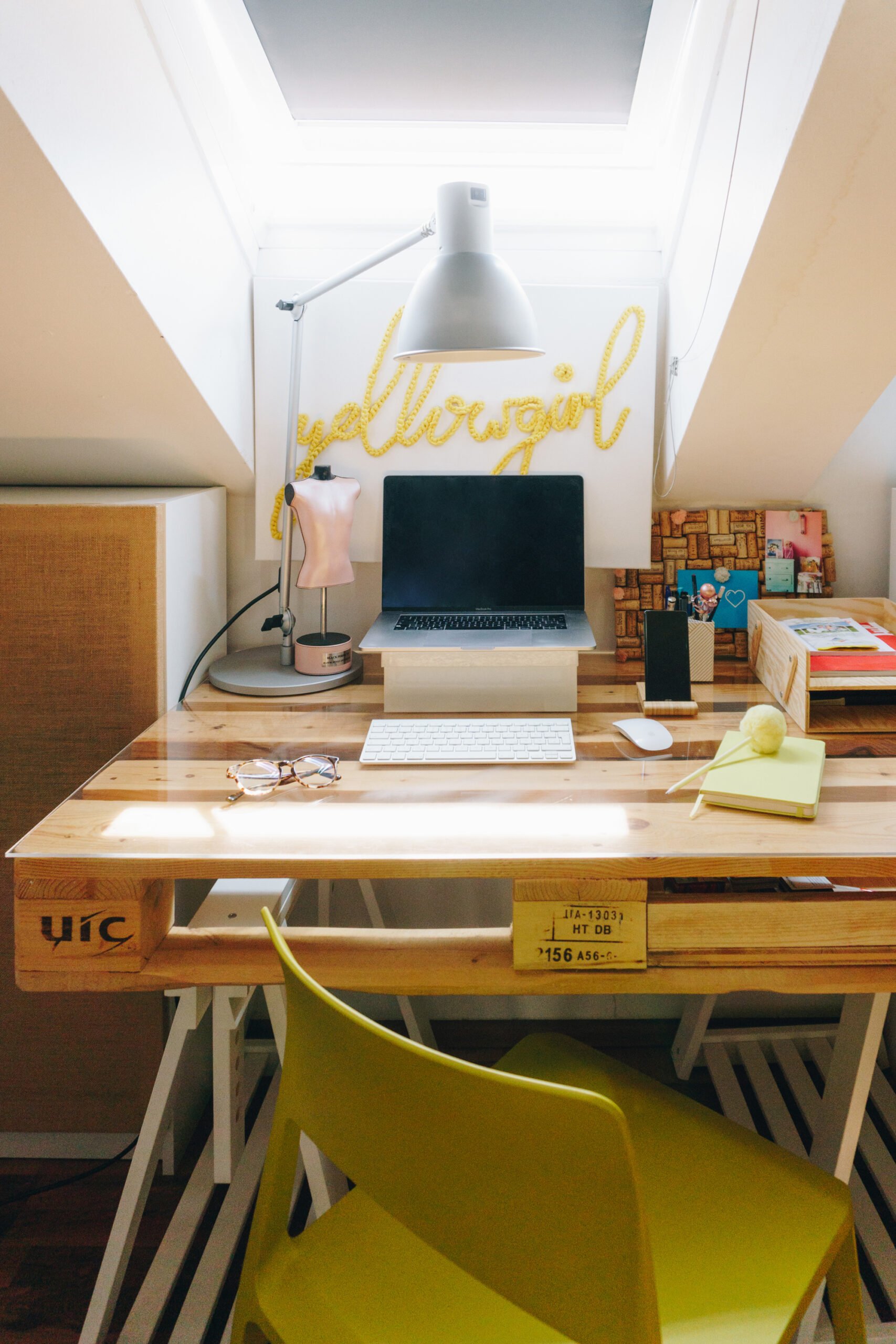 Mein Europaletten-Schreibtisch hat die richtige höhe, ist höhenverstellbar und neigbar. Beides nutze ich aber nicht da mir für die Arbeit im stehen der Platz fehlt dank der Dachschräge. Leider steht er auch direkt beim Fenster was aus Platzgründen der beste Platz war. Damit die Sonne mich nicht blendet habe ich nicht nur ein abdunkelndes Rollo innen sondern auch ein Sonnenschutz-Rollo außen an meinem Dachfenster.