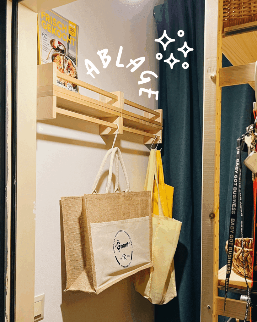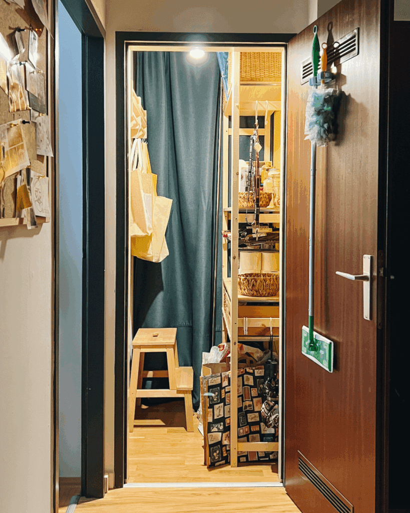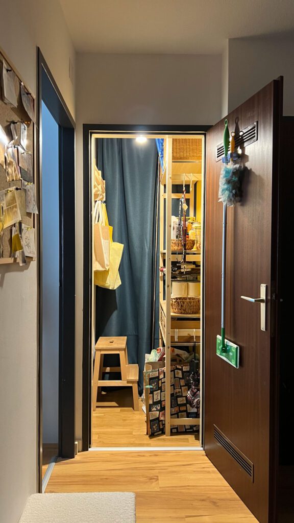 Statt einer klassischen Tür kam ein heller Vorhang mit Deckenmontage zum Einsatz. Das spart Platz und wirkt luftiger. Danach wurde ein IVAR-Regal von IKEA aufgebaut – schlicht, flexibel und schon vorhanden.