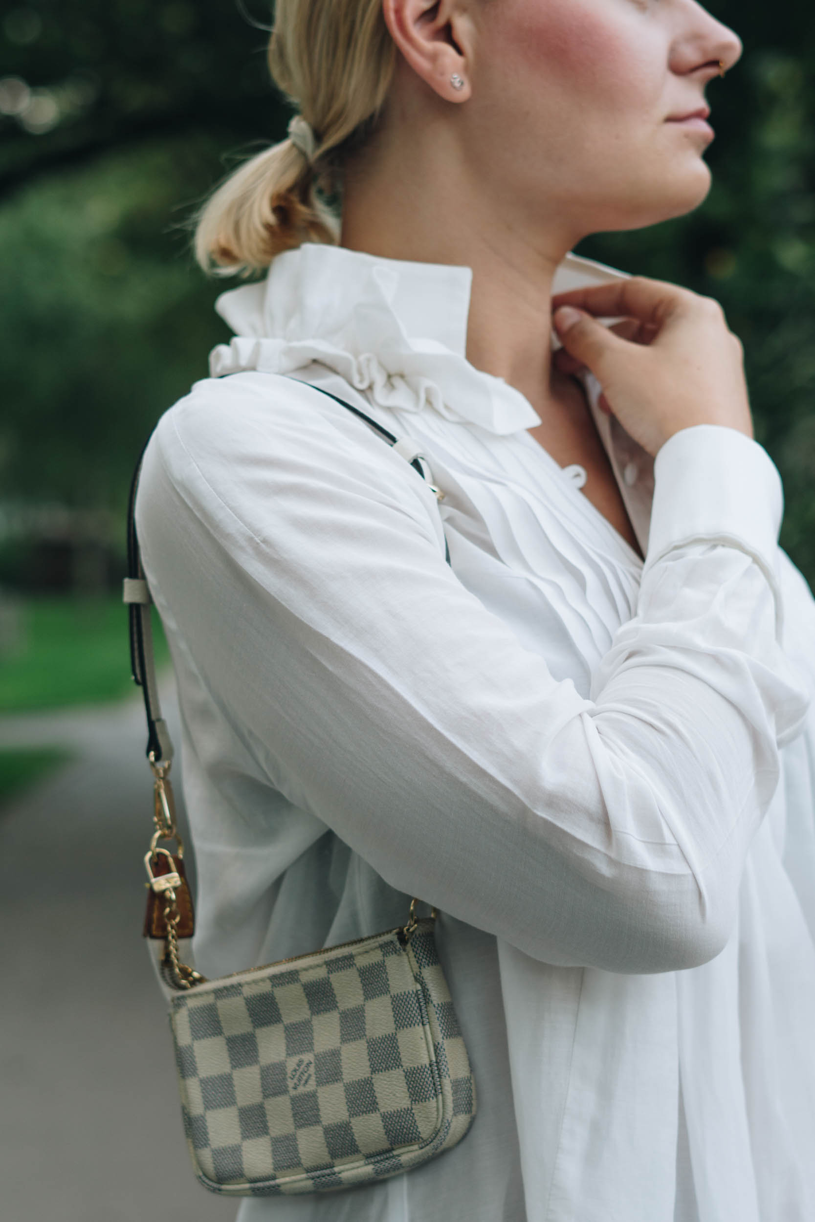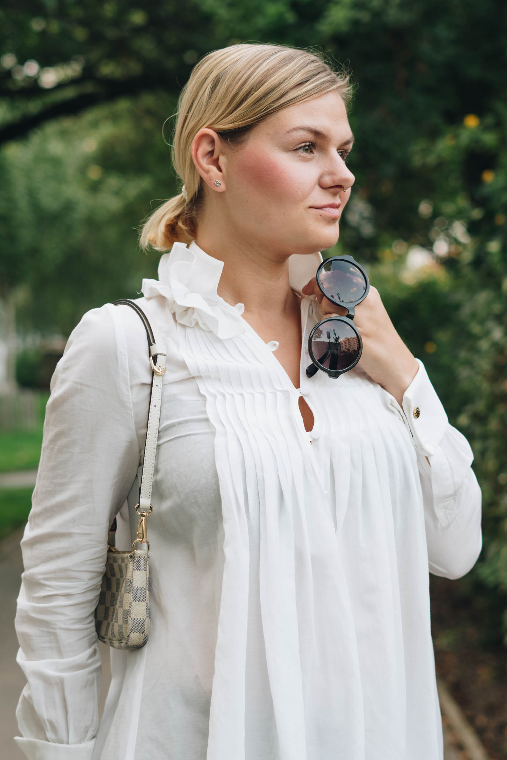 Auf den Bildern trage ich eine Tunika-Bluse von Lineight, mini Pochette von Louis Vuitton mit zusätzlichem Taschenband, Jeggings mit Fußschlaufen, Mules mit Goldabsatz von Mango und runder Sonnenbrille von Primark.