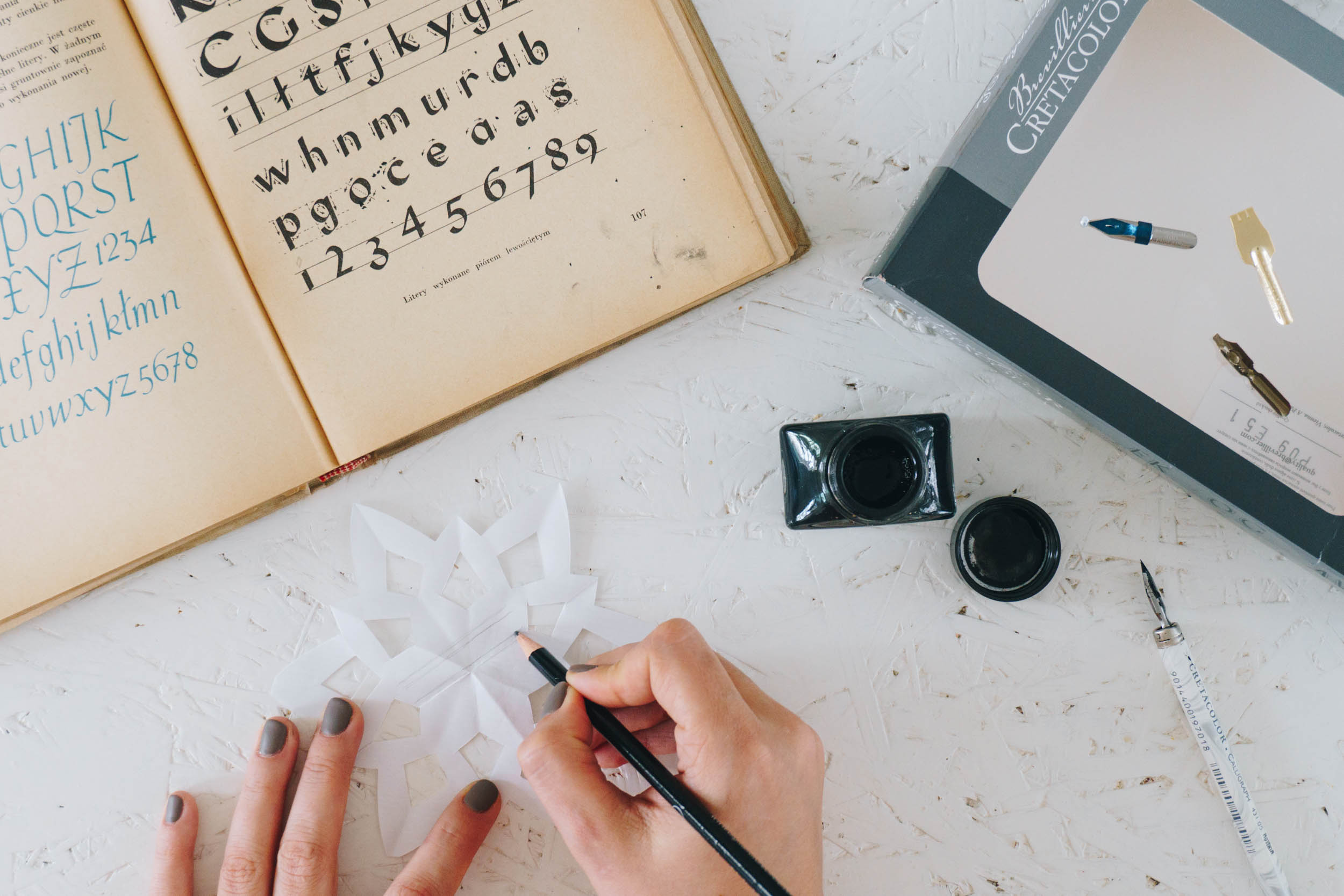 Als nächstes zeichnest du mit einem Bleistift Linien ein um dir das Beschriften zu erleichtern. Wenn du wenig Übung hast, verwende eine Vorlage und schreibe die Namen deiner Gäste auf die einzelnen Schneeflocken aus Papier.