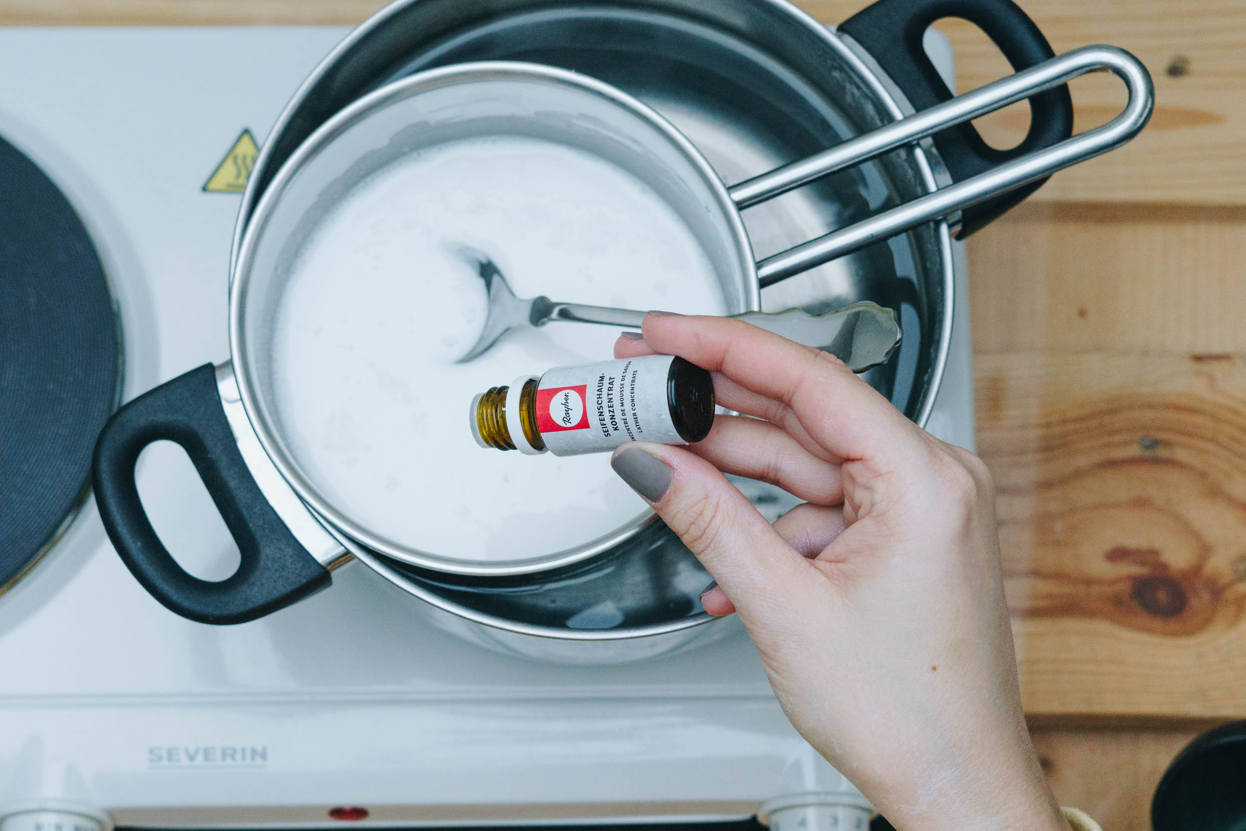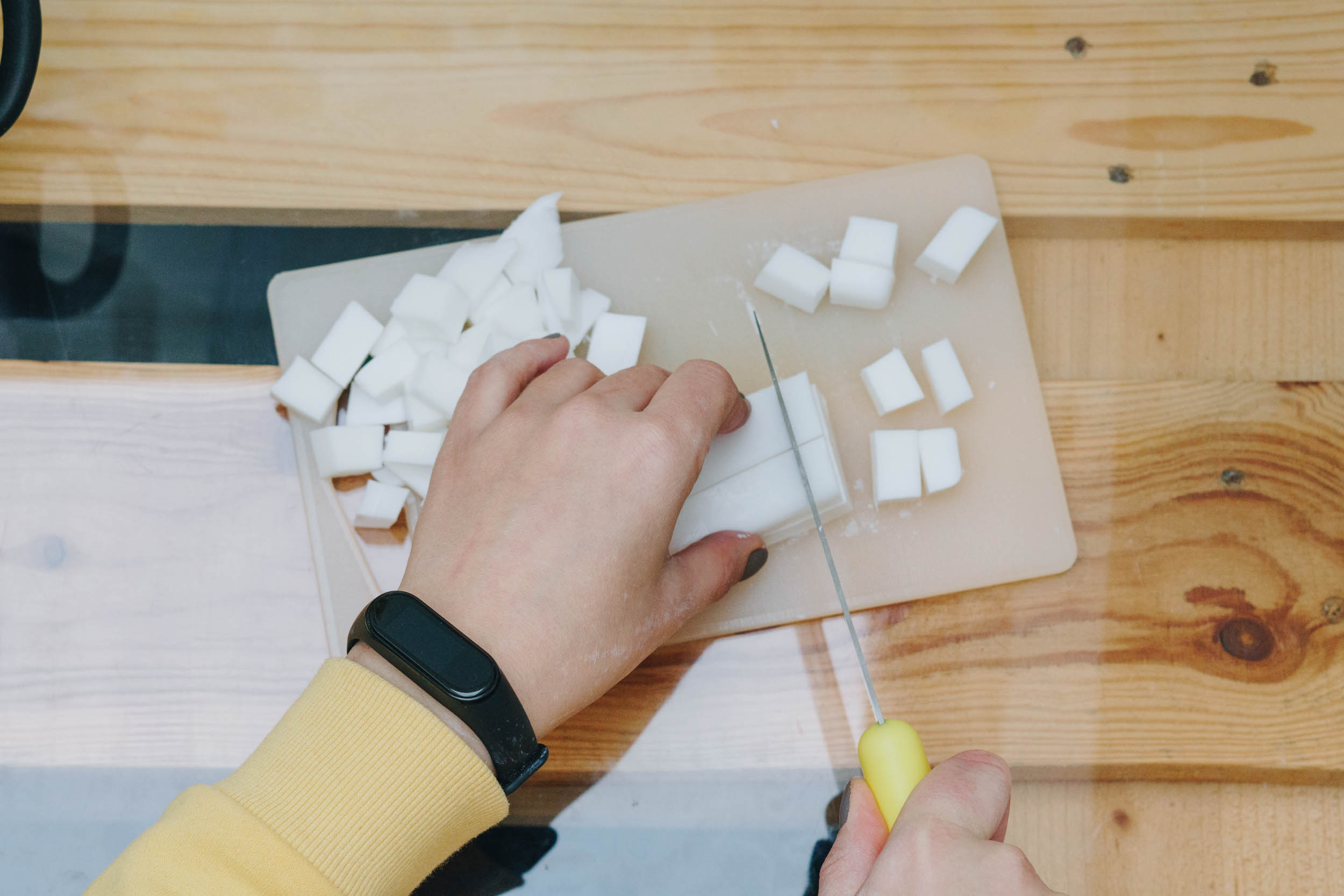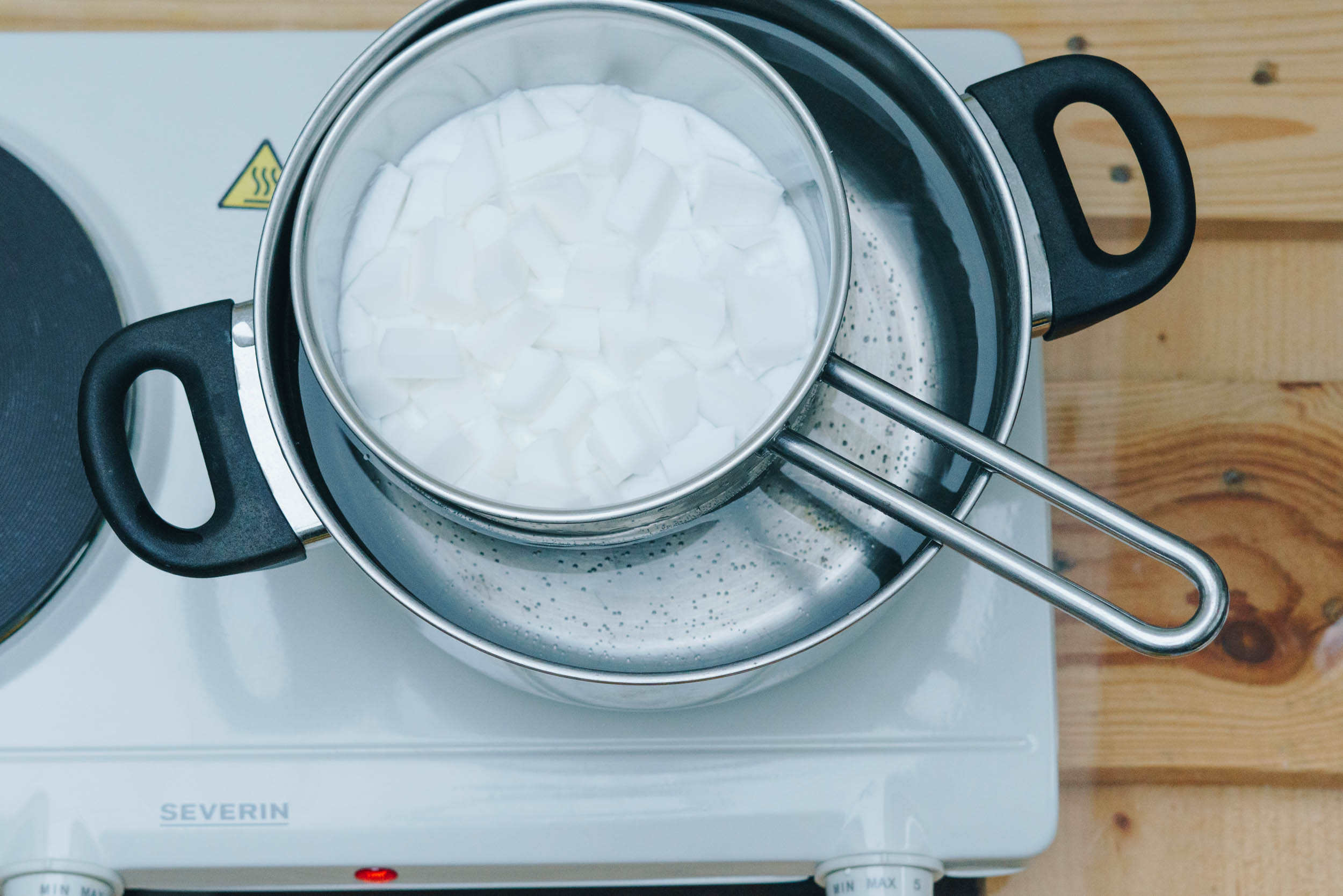 Schneide die gewünschte Menge an Seife in kleine Würfel und erwärmen sie im Wasserbad.