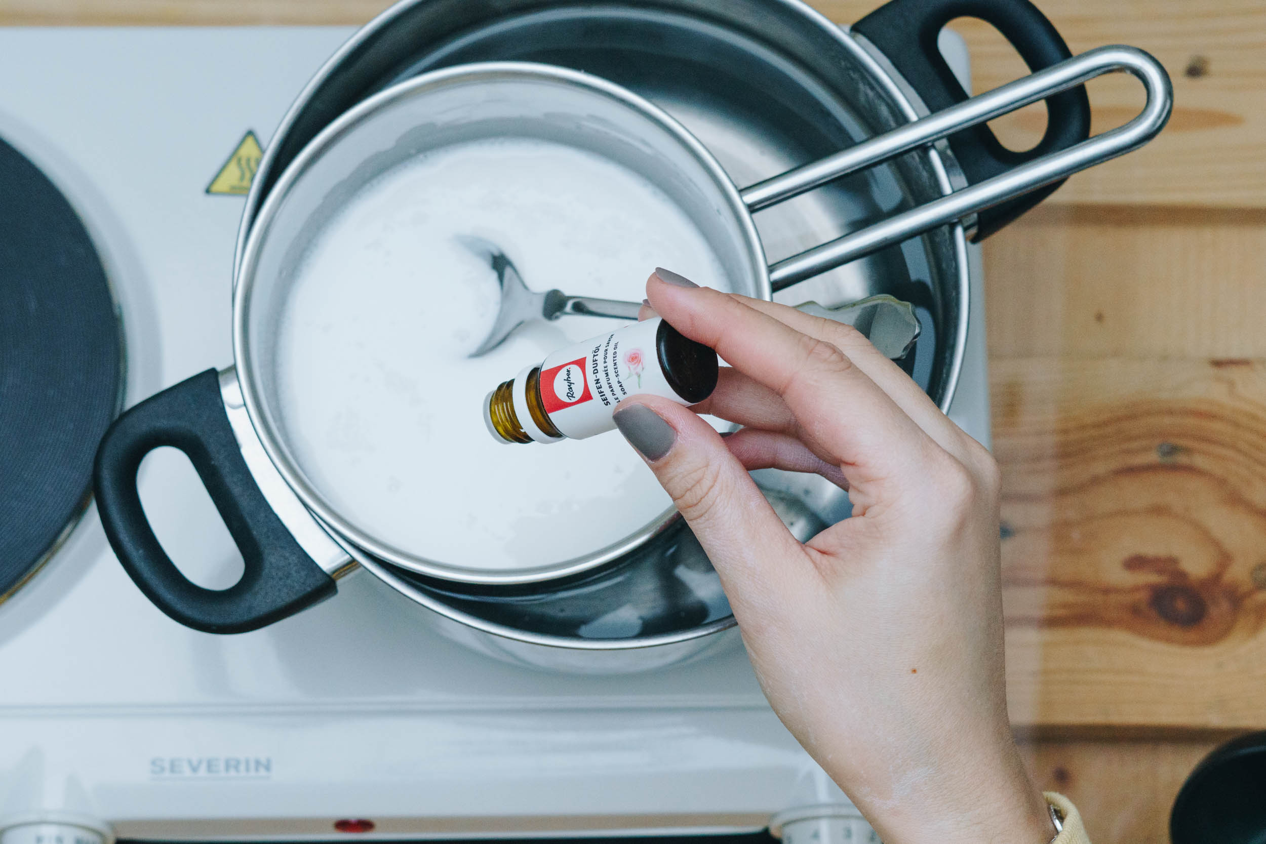 Wenn die Seife geschmolzen ist, gib ein paar Tropfen Rosenduft und Seifenschaum dazu und verrühre es gut.