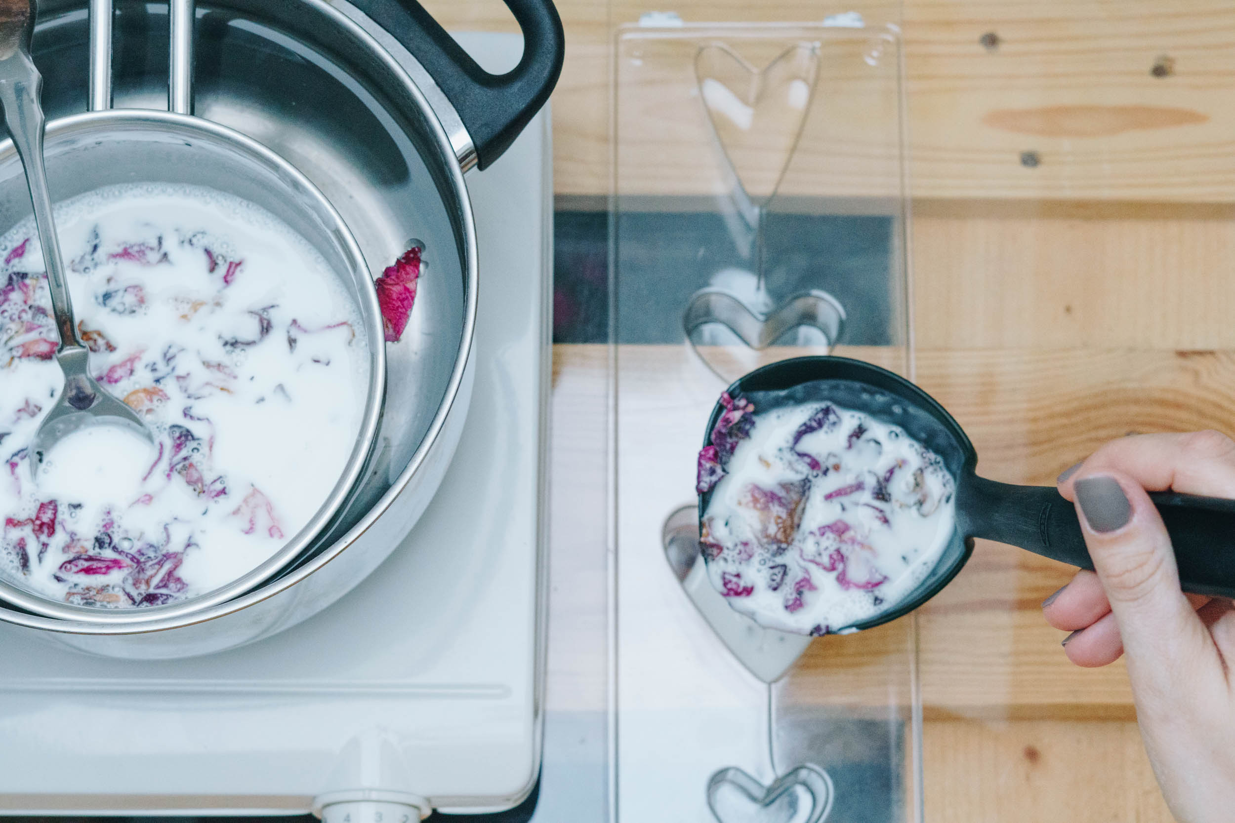 Mische getrocknete Rosenblüten unter und verteile die Seife in den Herz-Formen.