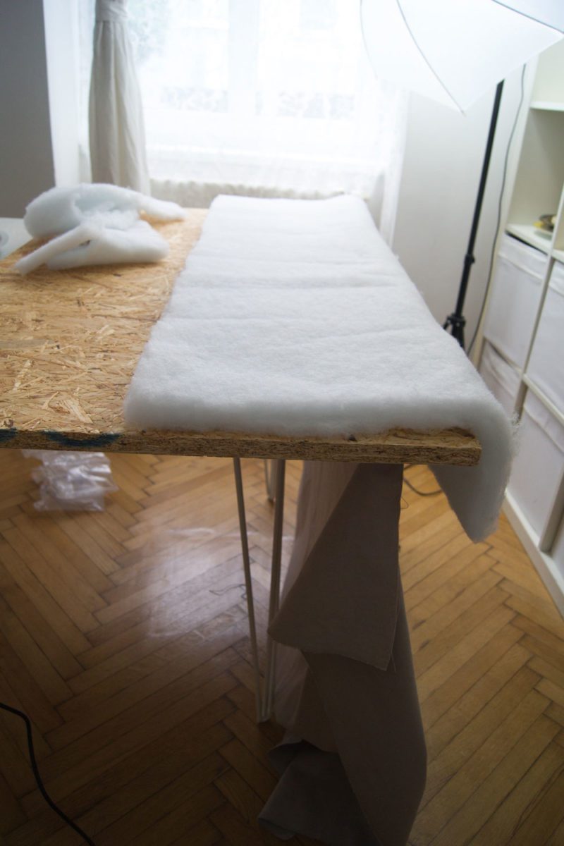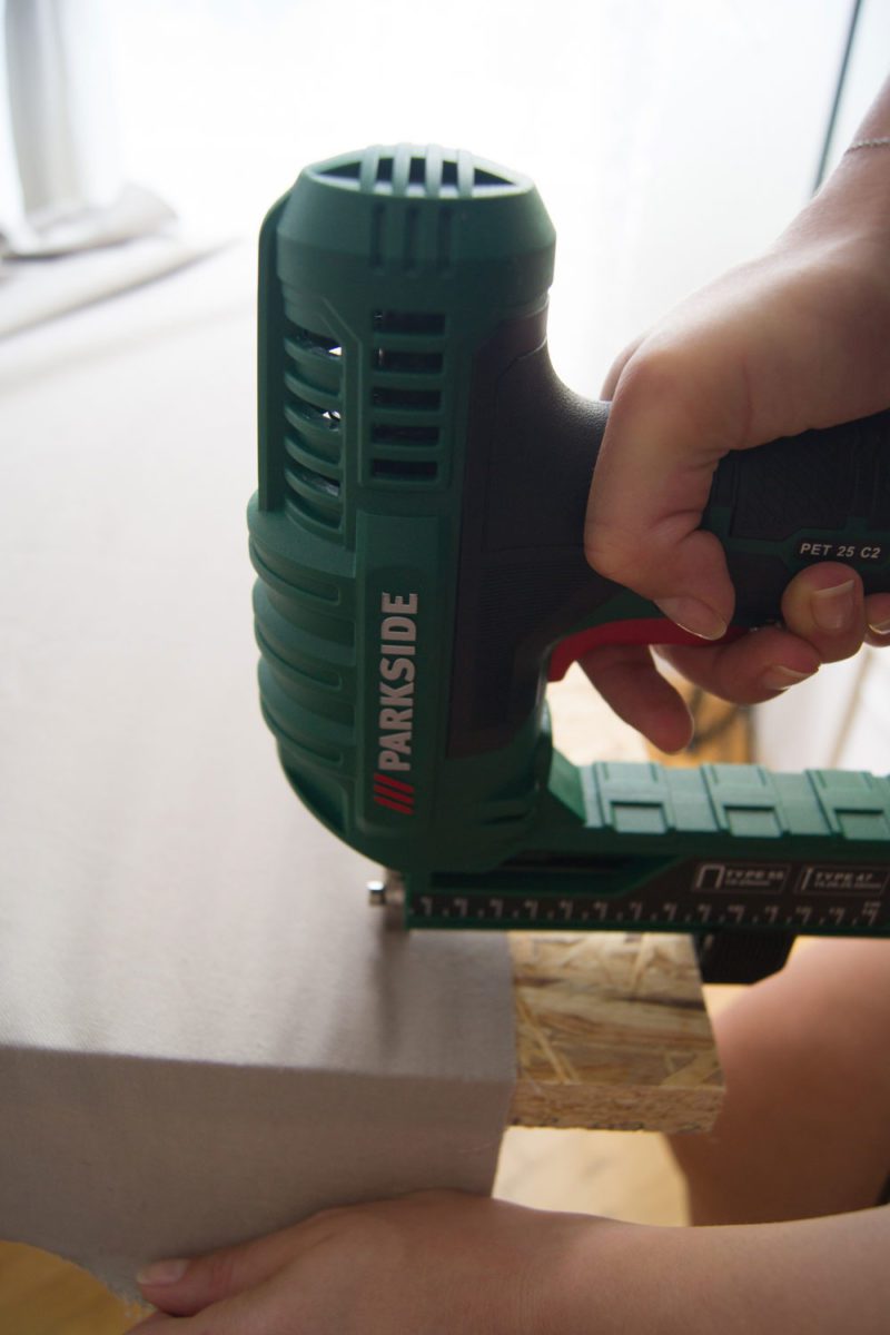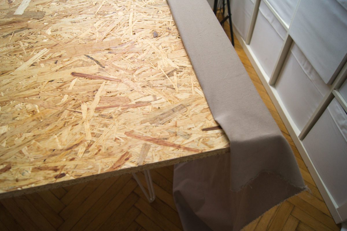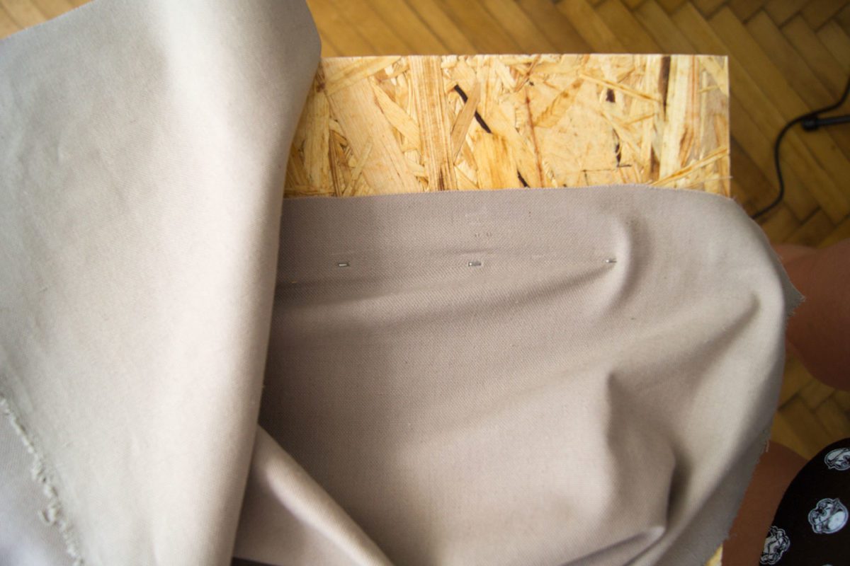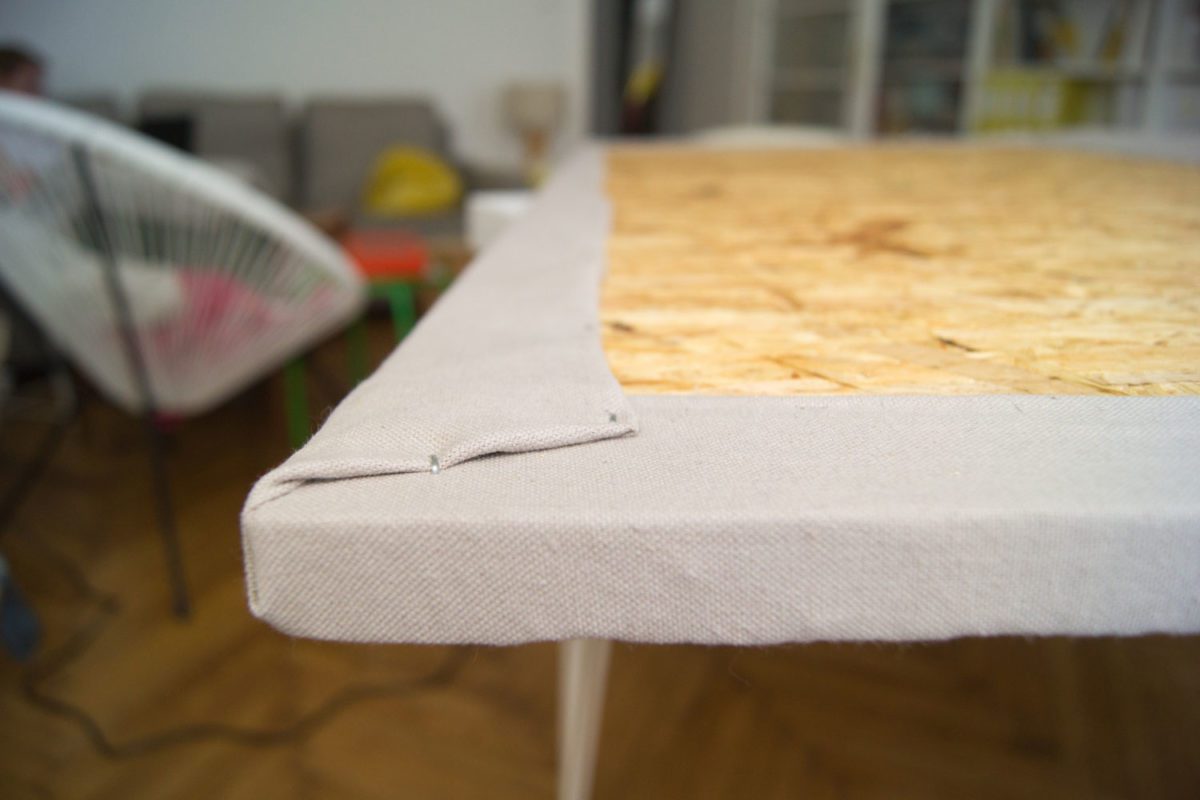 Leg deine Platte mit der Rückseite nach oben auf deinen Arbeitstisch. Lege den Stoff mit der Innenseite nach oben auf die Platte und mit der Kante 5cm unter die Kante deiner Platte. Tackere den Stoff 2cm unter der Kante des Stoffes an der Platte fest. Spanne den Stoff per Hand und setzte ca. 3cm eine Tackerklammer. So bald der Stoff mit genug Klammern an der Platte fixiert ist lege den Stoff um die Kante der Platte.