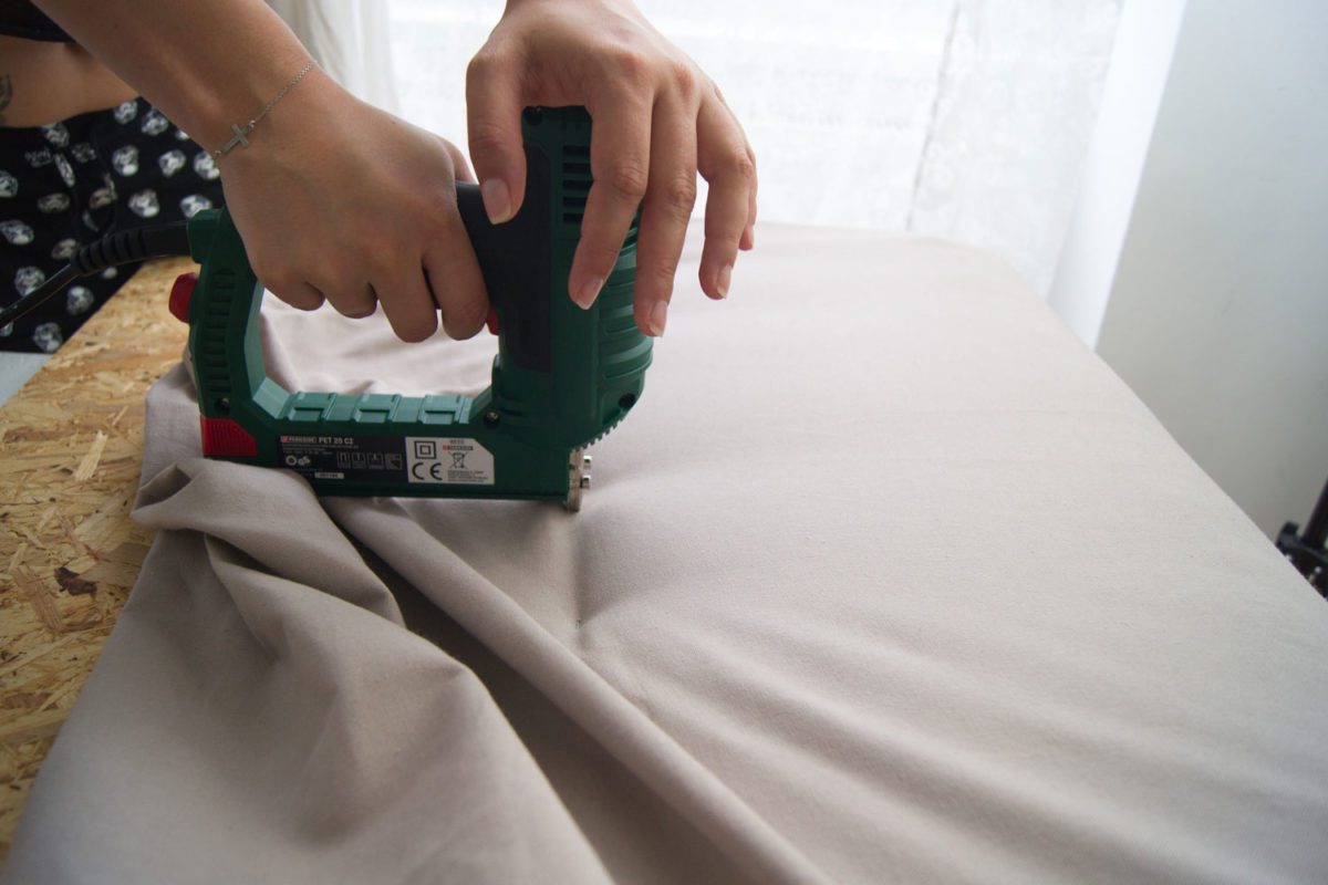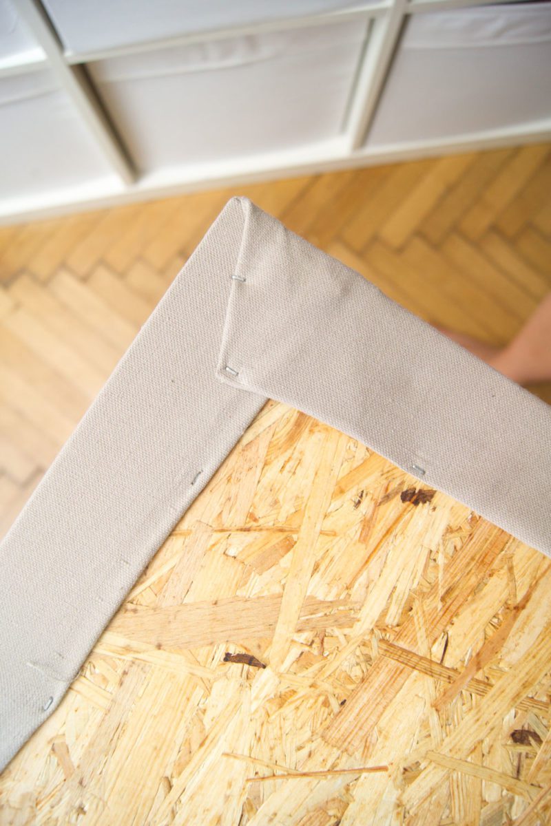 Lege deinen Stoff um die Kanten auf der Rückseite der Platte um und tackere sie fest. Spanne den Stoff unter der gepolsterten Fläche und tackere ihn auf der Rückseite fest. Achte dabei immer den Stoff umzuschlagen, damit die Enden schöner aussehen.