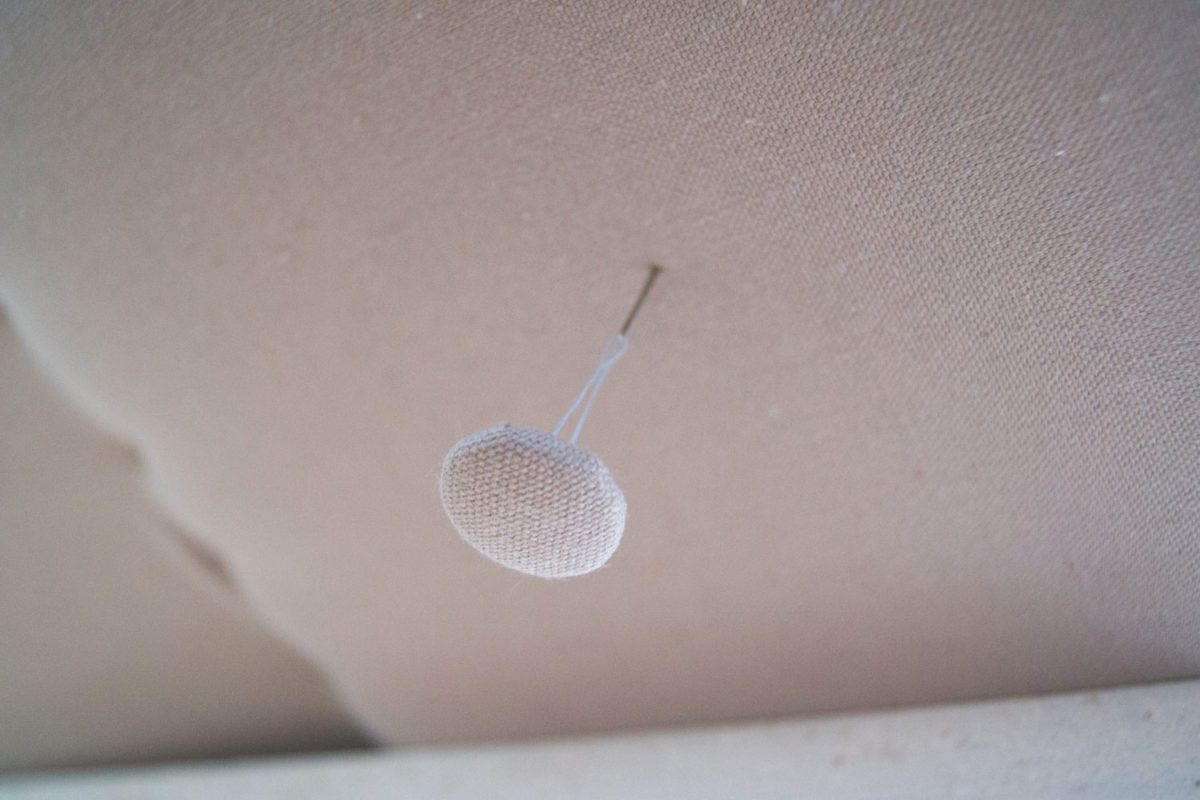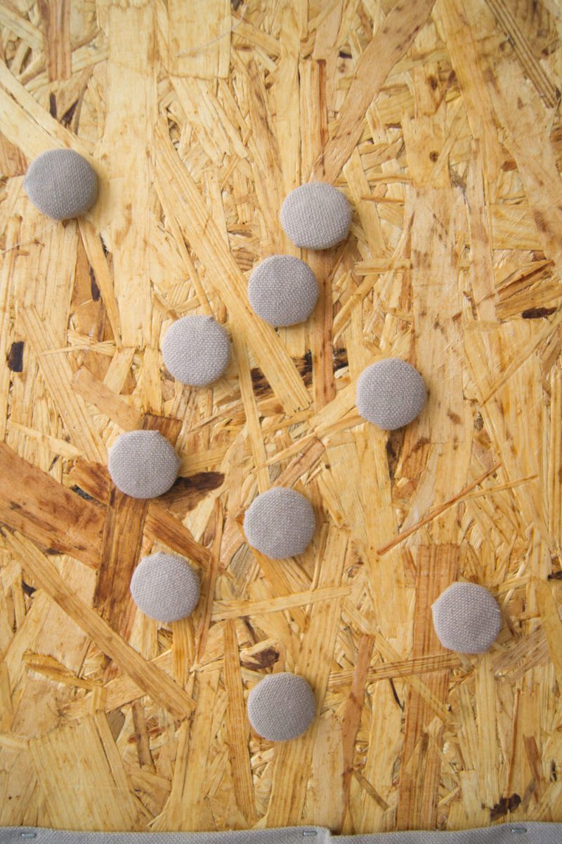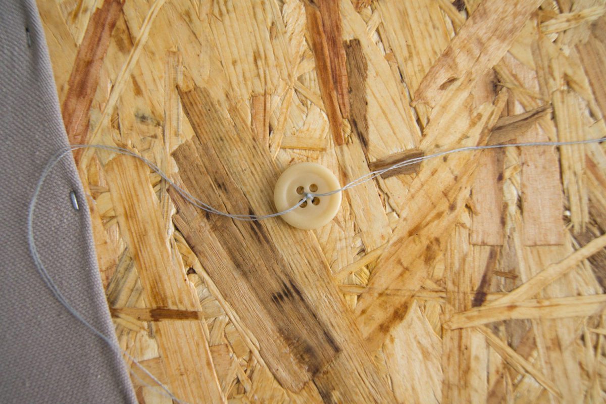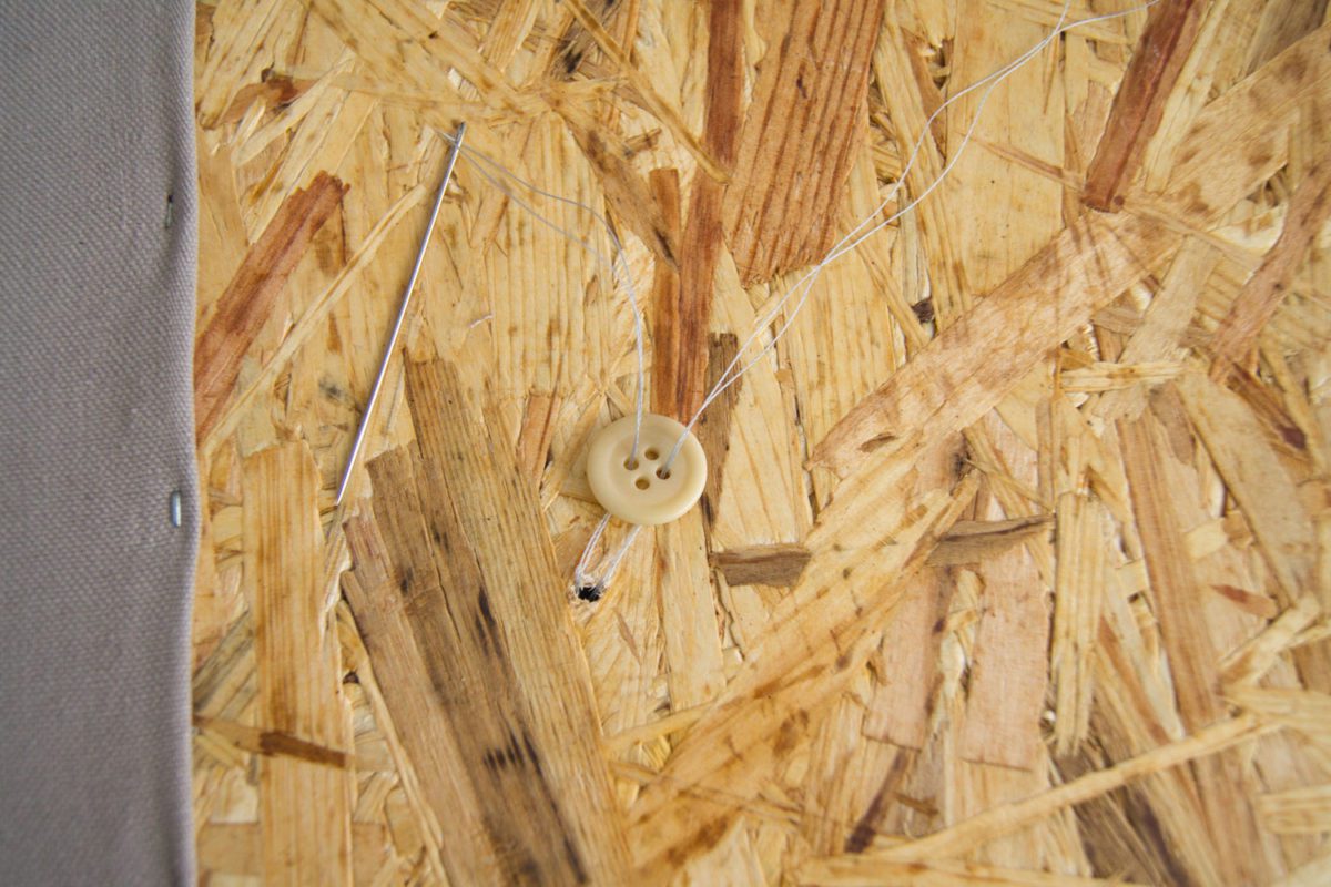 Drehe deine Platte mit der Rückseite nach oben so dass ein Teil deiner Platte über die Kante deiner Arbeitsplatte steht. Steche deine lange Nadel mit einem längeren Stück doppeltem Faden durch eines deiner Bohrlöcher, das Polsterfließ und deinen Stoff. Fädle die Nadel durch einen Knopf und steche die Nadel an so gut es geht der gleichen Stelle im Stoff wieder durch. Fädle die beiden Enden deines Fadens durch zwei Löcher deines einfachen Knopfes. Ziehe deinen Knopf so fest du kannst fest und verknote den faden mit deinem einfachen Knopf. Umwickle den Knopf mehrere Male und mache mehrere Knöpfe hinein, damit der Faden nicht aufgehen kann. So bald du alle Knöpfe festgebunden hast bist du fertig. Jetzt musst du dein DIY Bett Headboard nur mehr an dein Bett befestigen aber das überlasse ich dir 😉