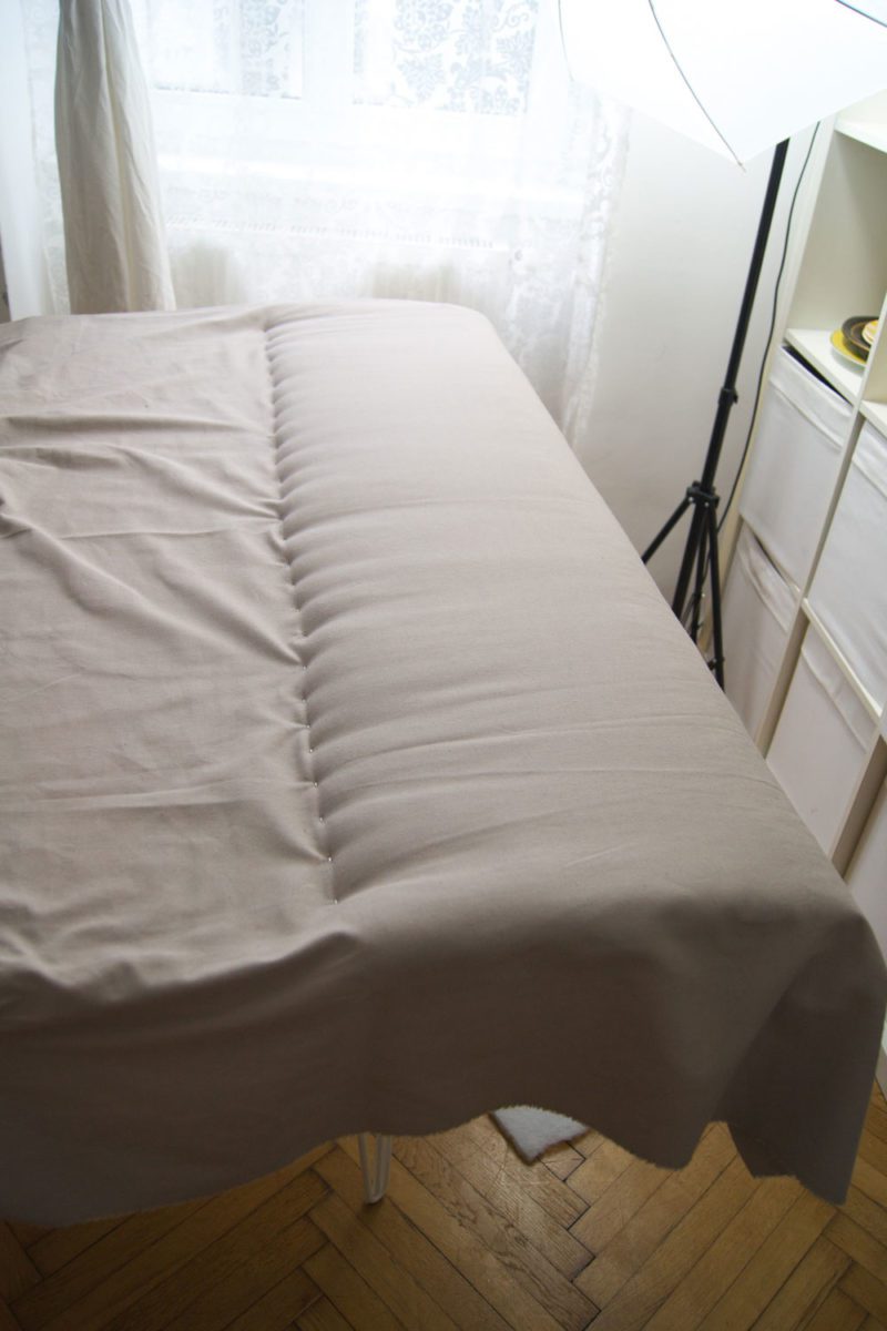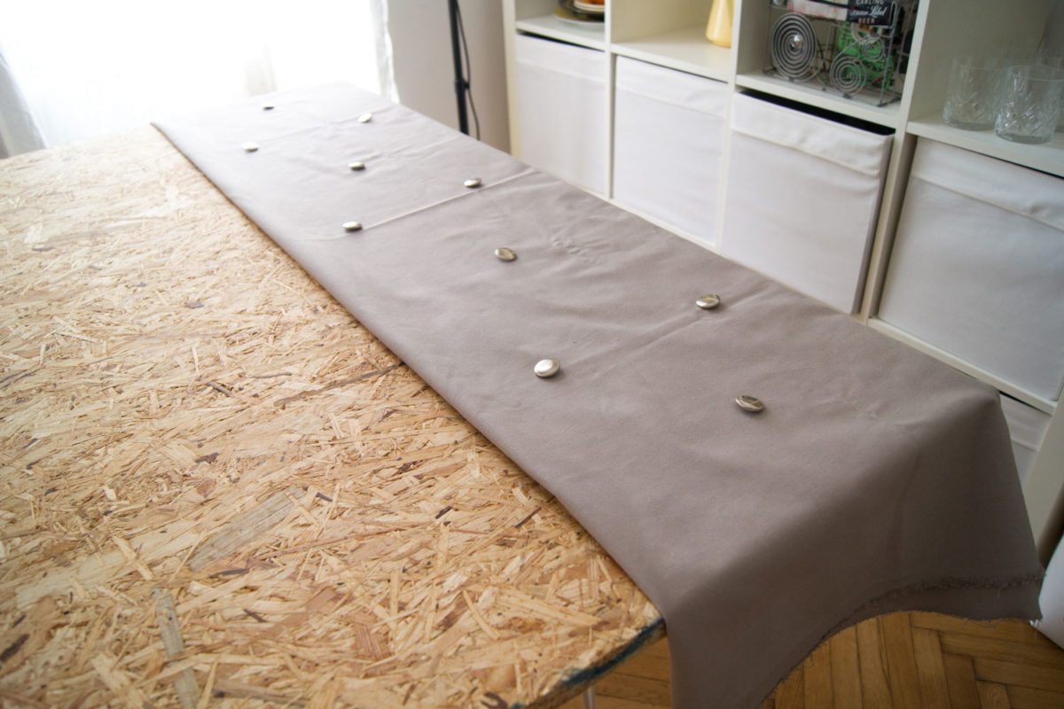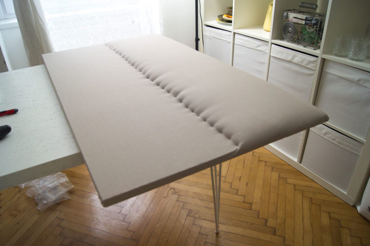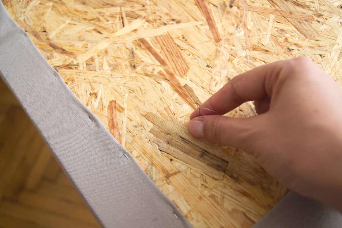 Drehe deine Platte mit der Rückseite nach oben so dass ein Teil deiner Platte über die Kante deiner Arbeitsplatte steht. Steche deine lange Nadel mit einem längeren Stück doppeltem Faden durch eines deiner Bohrlöcher, das Polsterfließ und deinen Stoff. Fädle die Nadel durch einen Knopf und steche die Nadel an so gut es geht der gleichen Stelle im Stoff wieder durch. Fädle die beiden Enden deines Fadens durch zwei Löcher deines einfachen Knopfes. Ziehe deinen Knopf so fest du kannst fest und verknote den faden mit deinem einfachen Knopf. Umwickle den Knopf mehrere Male und mache mehrere Knöpfe hinein, damit der Faden nicht aufgehen kann. So bald du alle Knöpfe festgebunden hast bist du fertig. Jetzt musst du dein DIY Bett Headboard nur mehr an dein Bett befestigen aber das überlasse ich dir 😉