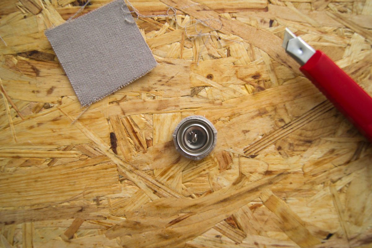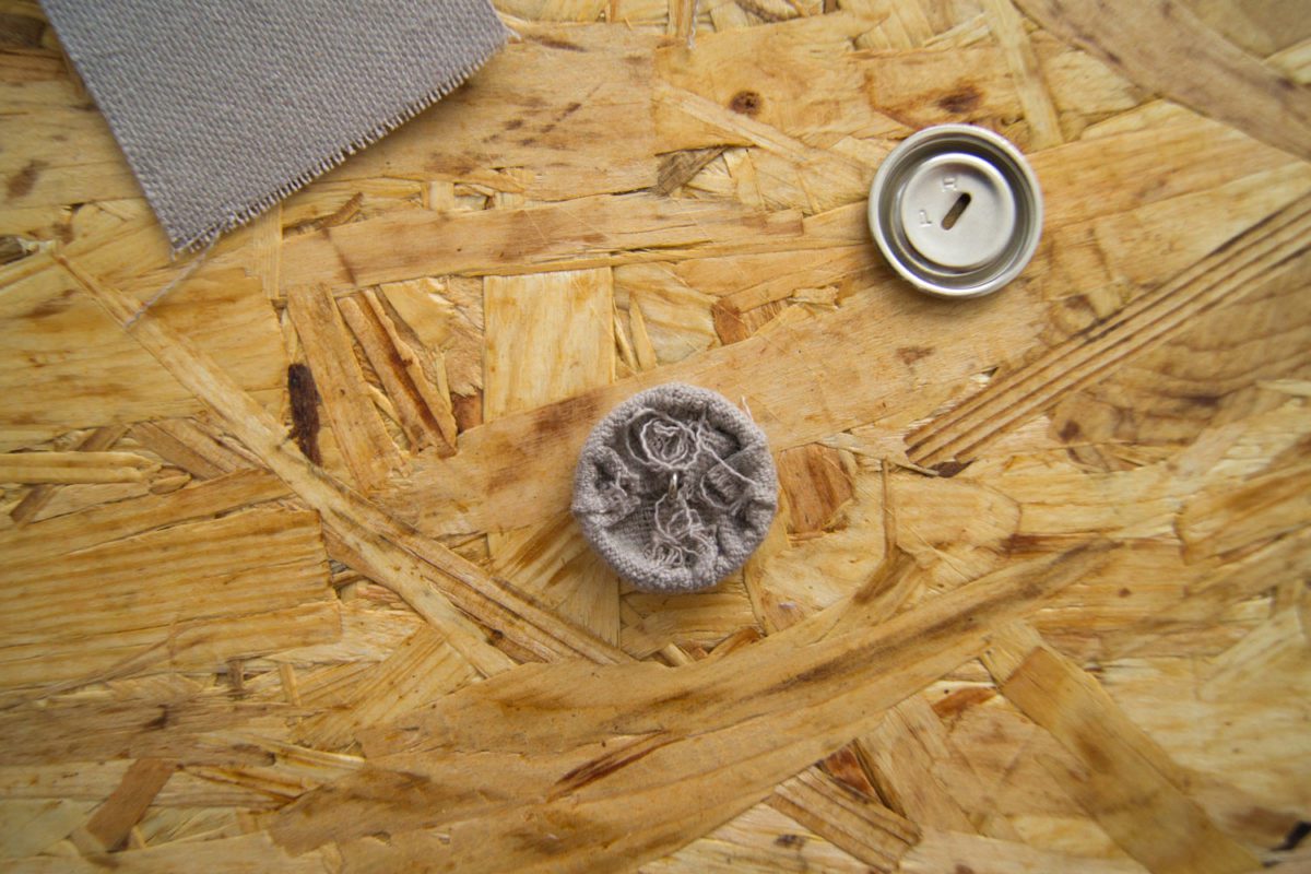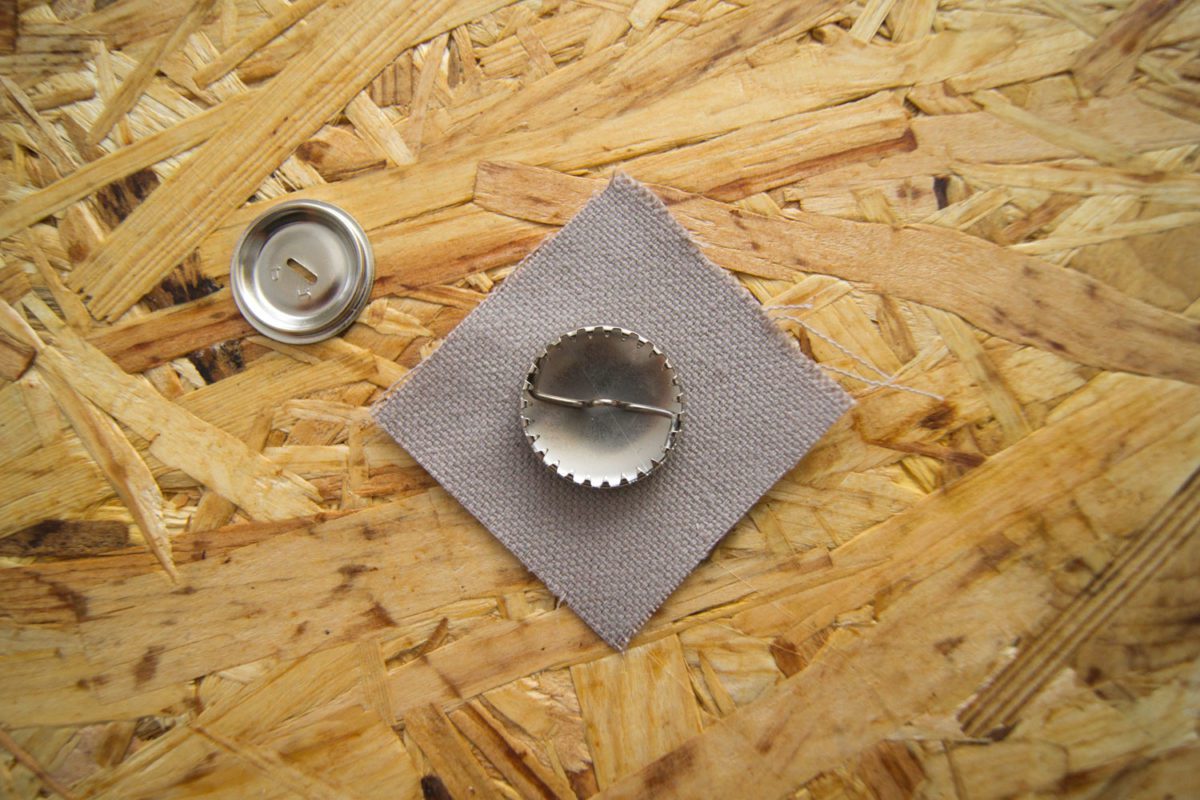 Nimm deine zweiteiligen Knöpfe zum selbst bespannen. Schneide Stoffstücke zu die ca. 1-0,5cm größer sind als dein Knopf. Lege deinen Stoff um den Außenknopf und drücke ihn auf der Innenseite hinein. Achte darauf, dass die Kante recht glatt ist und drücke den Innenknopf hinein. Wiederhole den Vorgang so lange bis du genug Knöpfe hast. Sollte einer deiner Knopfe lose sein und wieder auseinanderfallen, helfe dir mit etwas Heißkleber und klebe den Innenknopf an dem Stoff und dem Außenknopf fest.