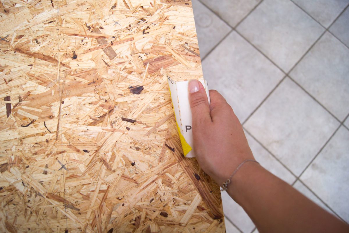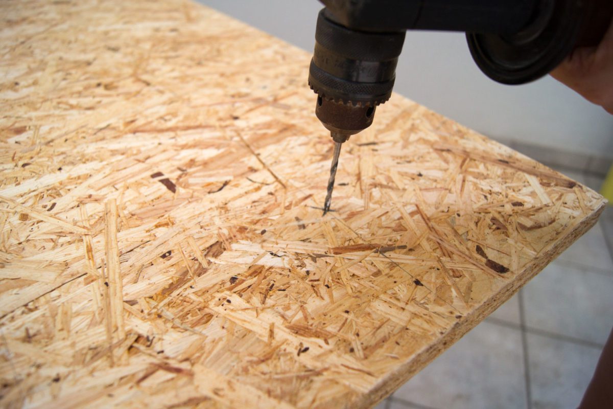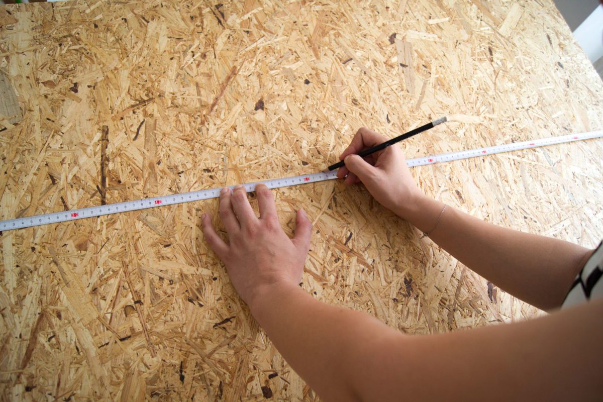 Zeichne deine Bohrstellen mit Bleistift auf der OSB-Platte ein. Bohre vorsichtig Löcher an den angezeichneten Stellen und schleife die Bohrlöcher und Kanten deiner Platte ab.