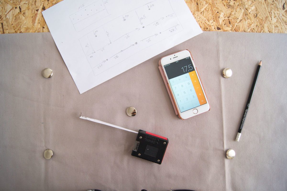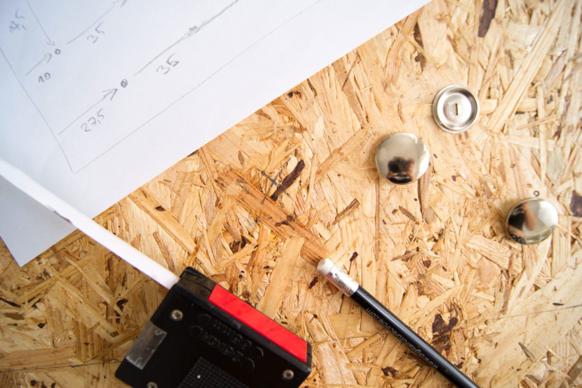 Messe deine OSB-Platte gut aus und plane wo deine Knöpfe hinkommen sollen und wie viel von der Platte gepolstert werden soll. Da mein Bett 35cm inklusive Matratze hoch ist und ich mein Headboard zwar bis zum Boden haben wollte aber gleichzeitig nur den Teil über der Matratze gepolstert haben wollte sowie das Headboard nicht viel höher als meine Kommoden haben wollte kamen diese Abstände bei 10 Knöpfen heraus: