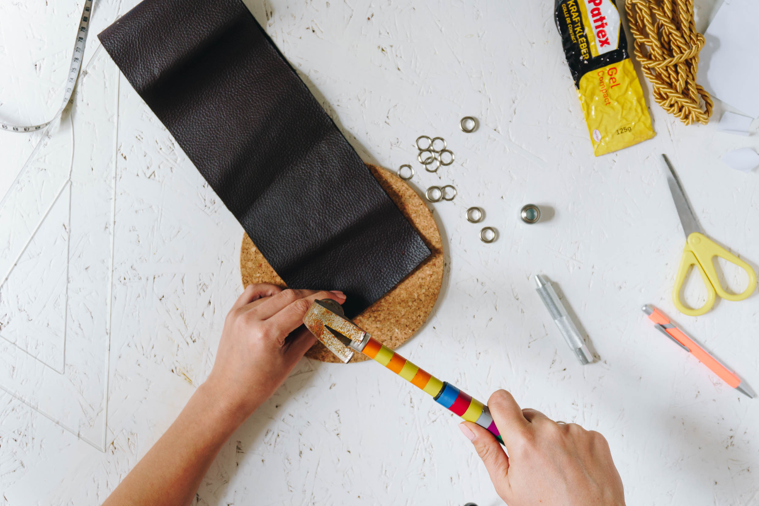 Schlage mit dem Ösenstanzer Löcher in dein Leder. Ich habe an jedem Ende vier gemacht. Und befestige die Ösen mit dem Einschlagstempel.