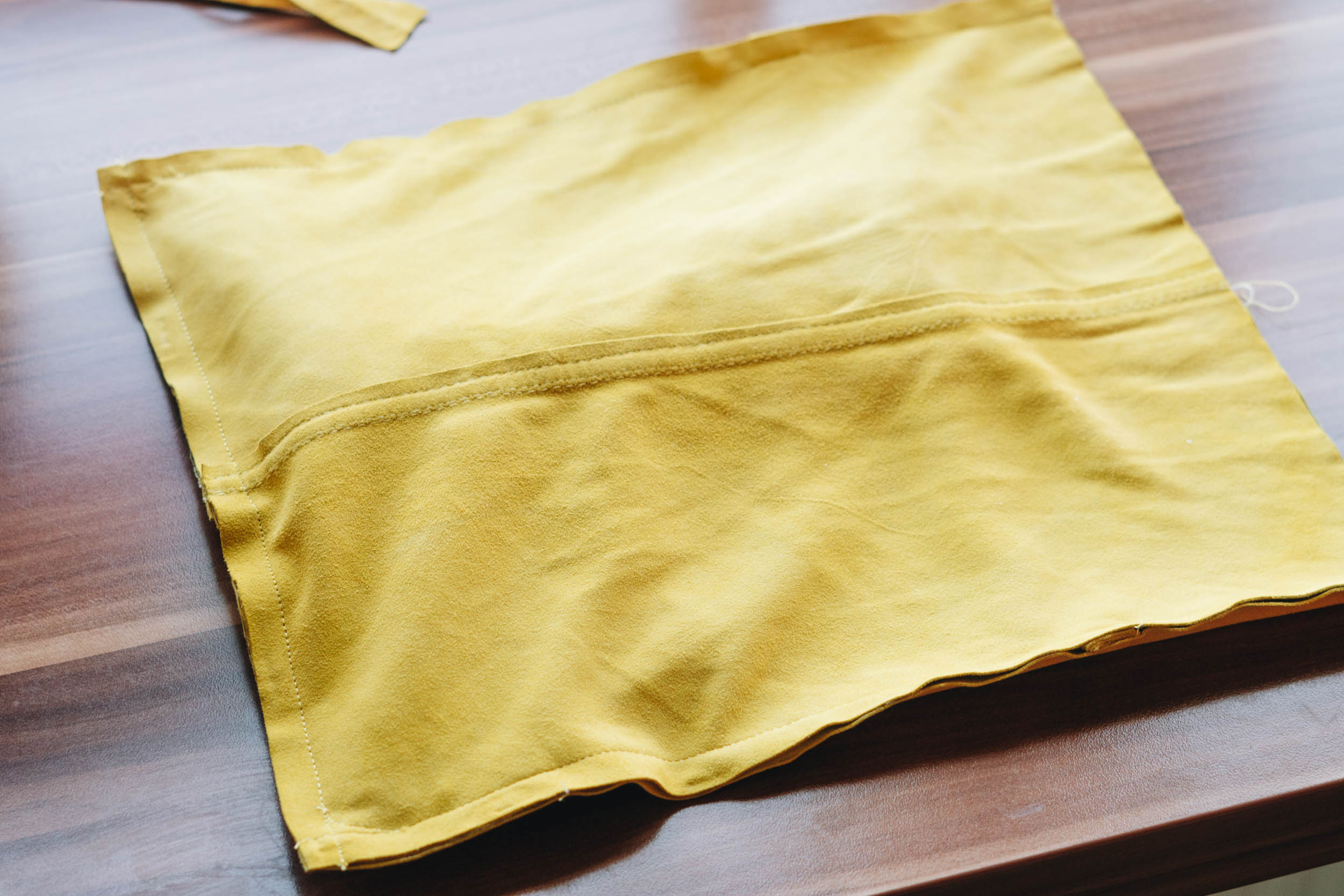 Schneide das Innenfutter auf 25×30 cm zu und nähe 2 Seiten ganz und eine Seite nur halb zu. Mache auch in den oberen Rand des Innenfutters Falten.