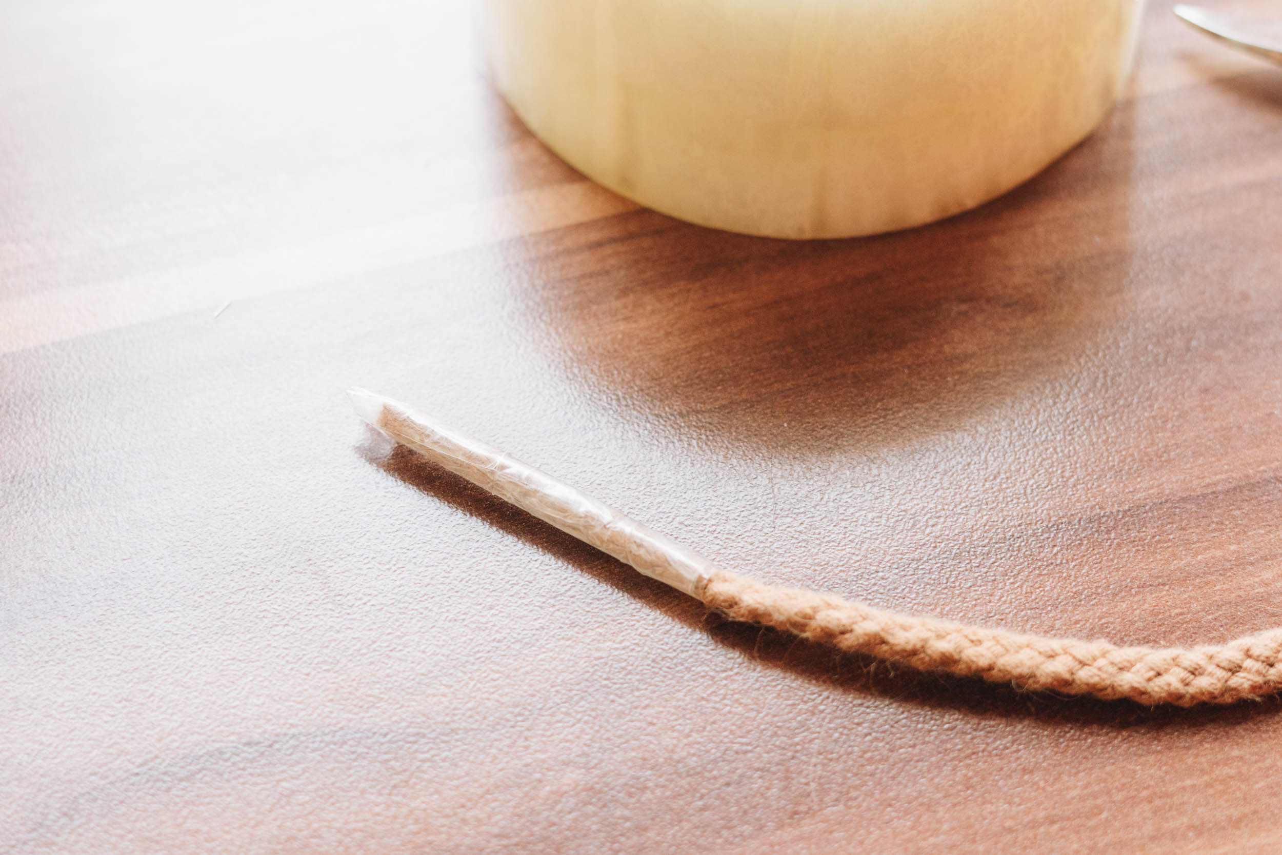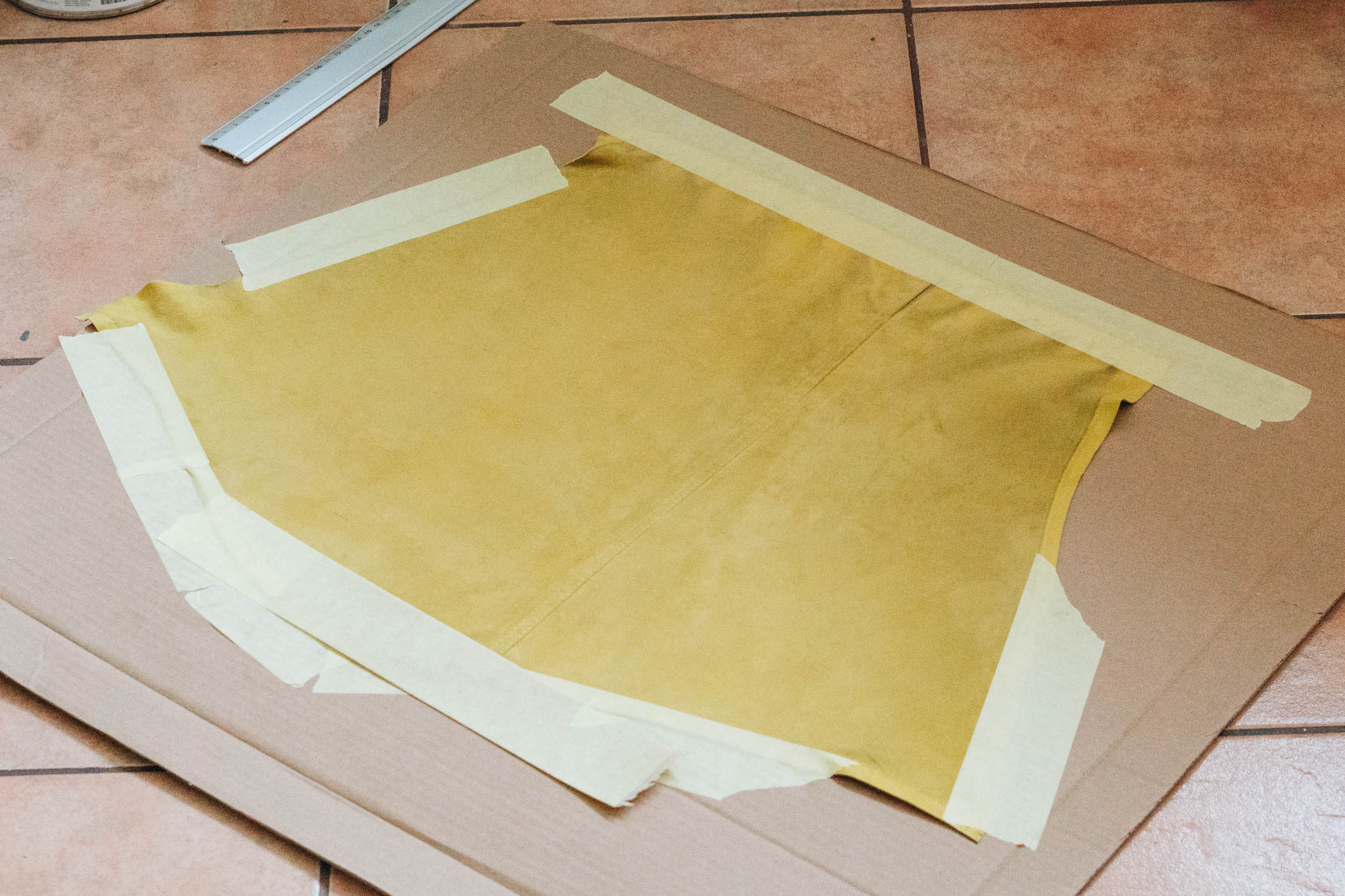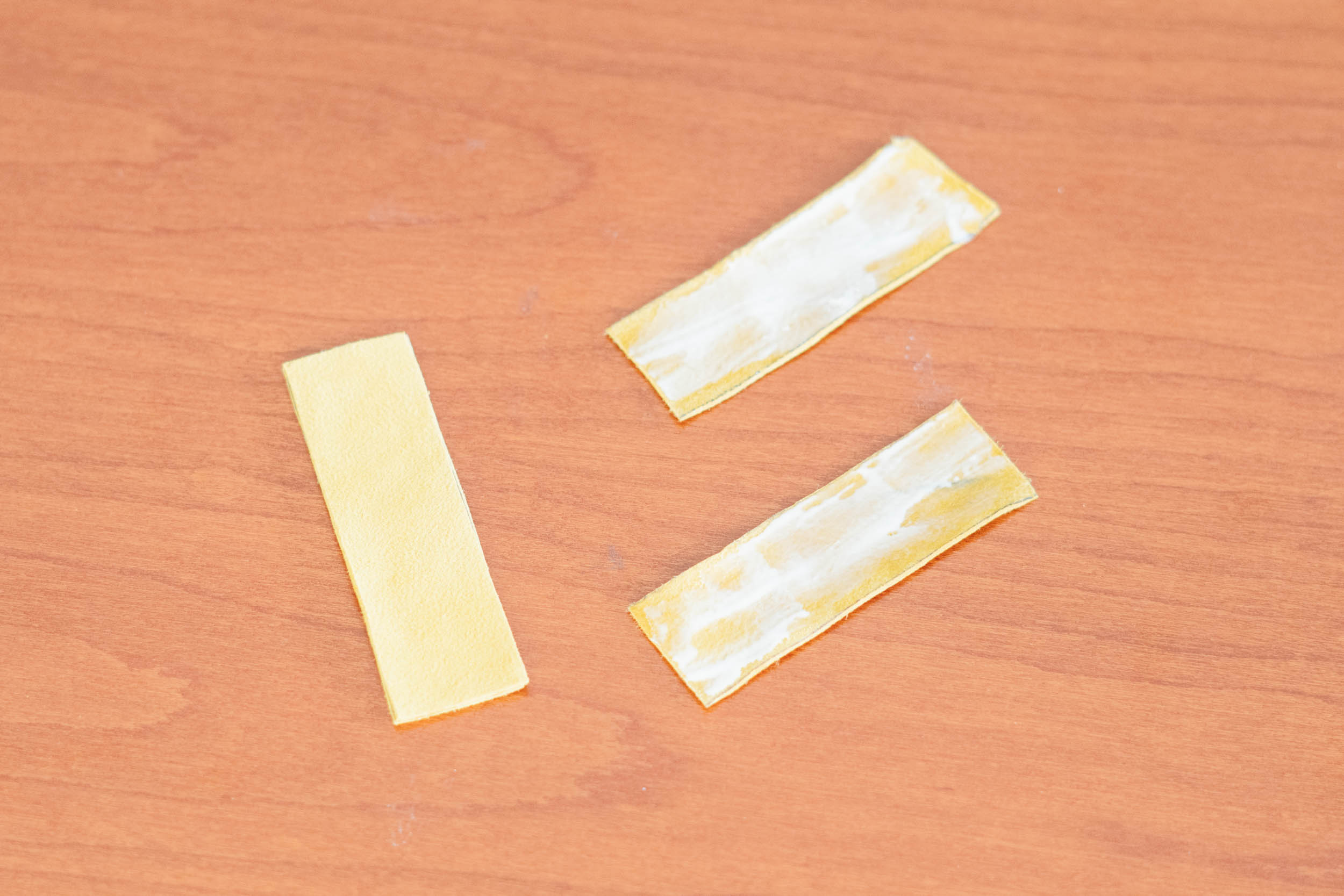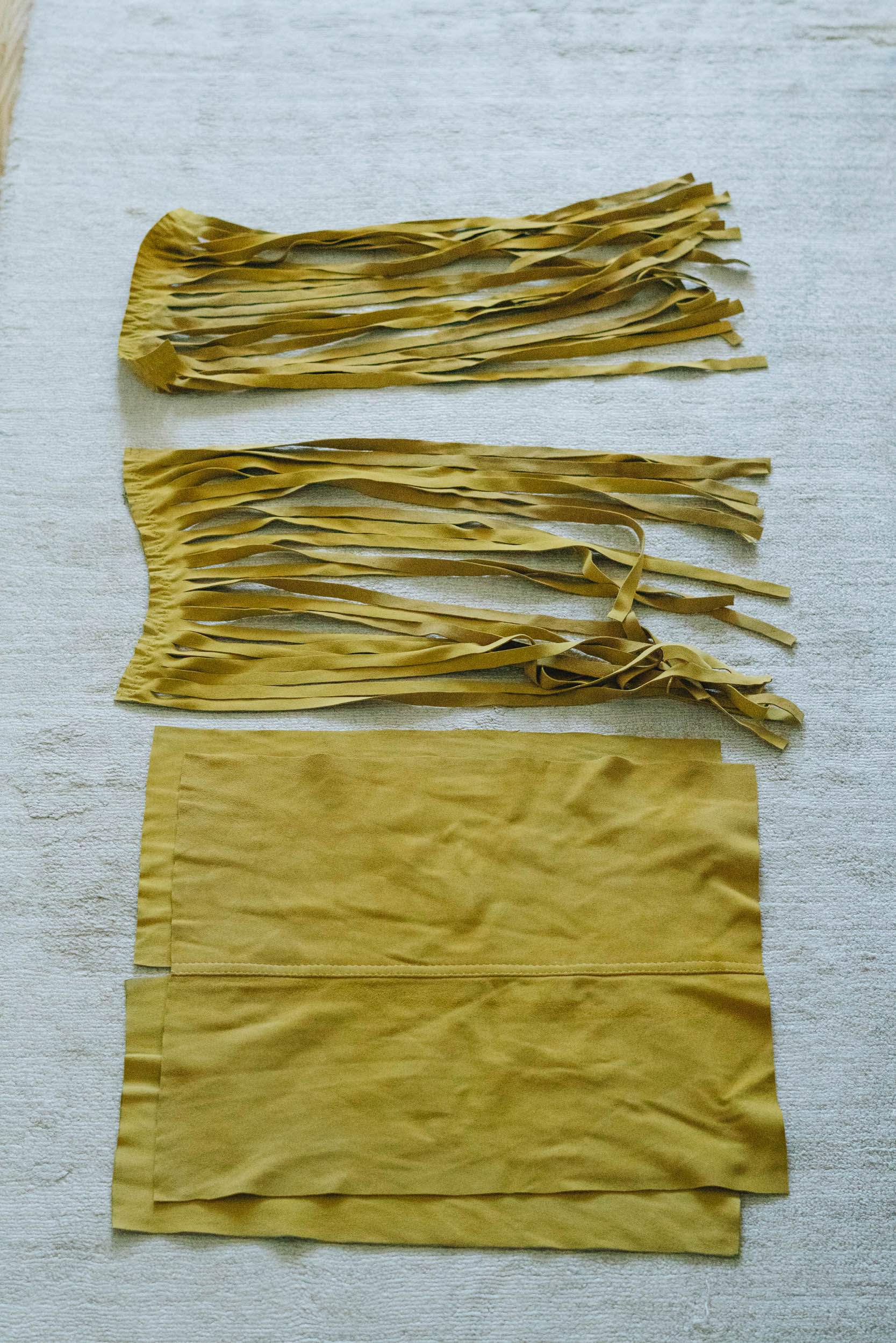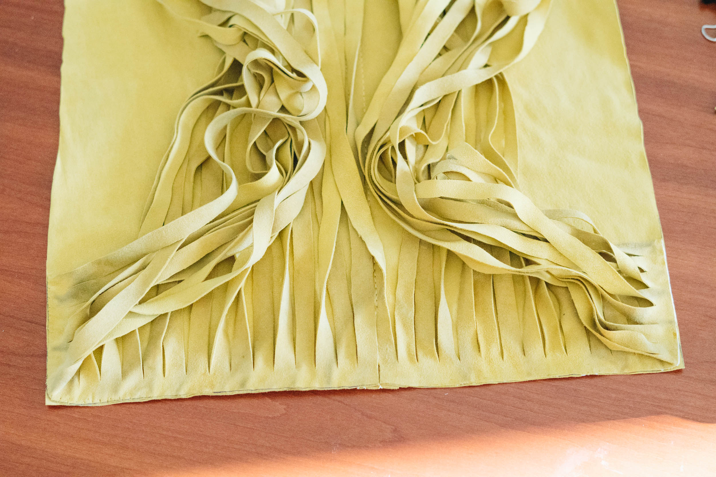 ​​Klebe das Leder für die Fransen mit Klebeband auf Pappe und schneide Vorsichtig 40cm lange Fransen, so dass ein 2cm breiter Rand an einem Ende bleibt.