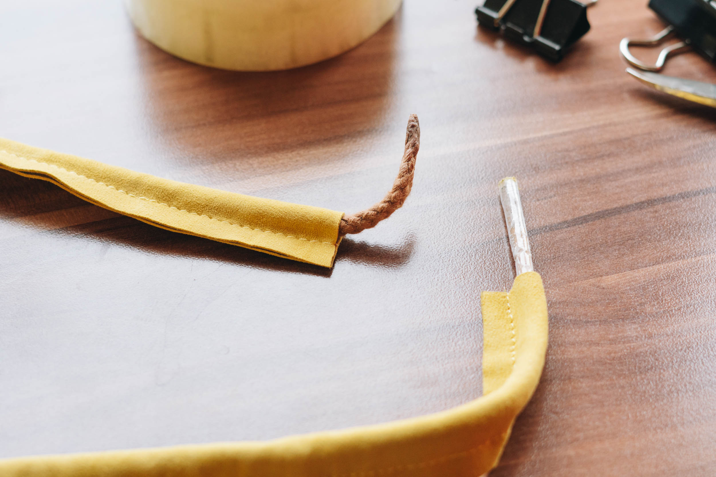 ​​Umwickle die Enden deiner Bänder fest mit Klebeband. Nähe für die Länge deiner Bänder Schläuche durch die die Bänder mit dem geklebten Ende vorraus gefädelt werden.