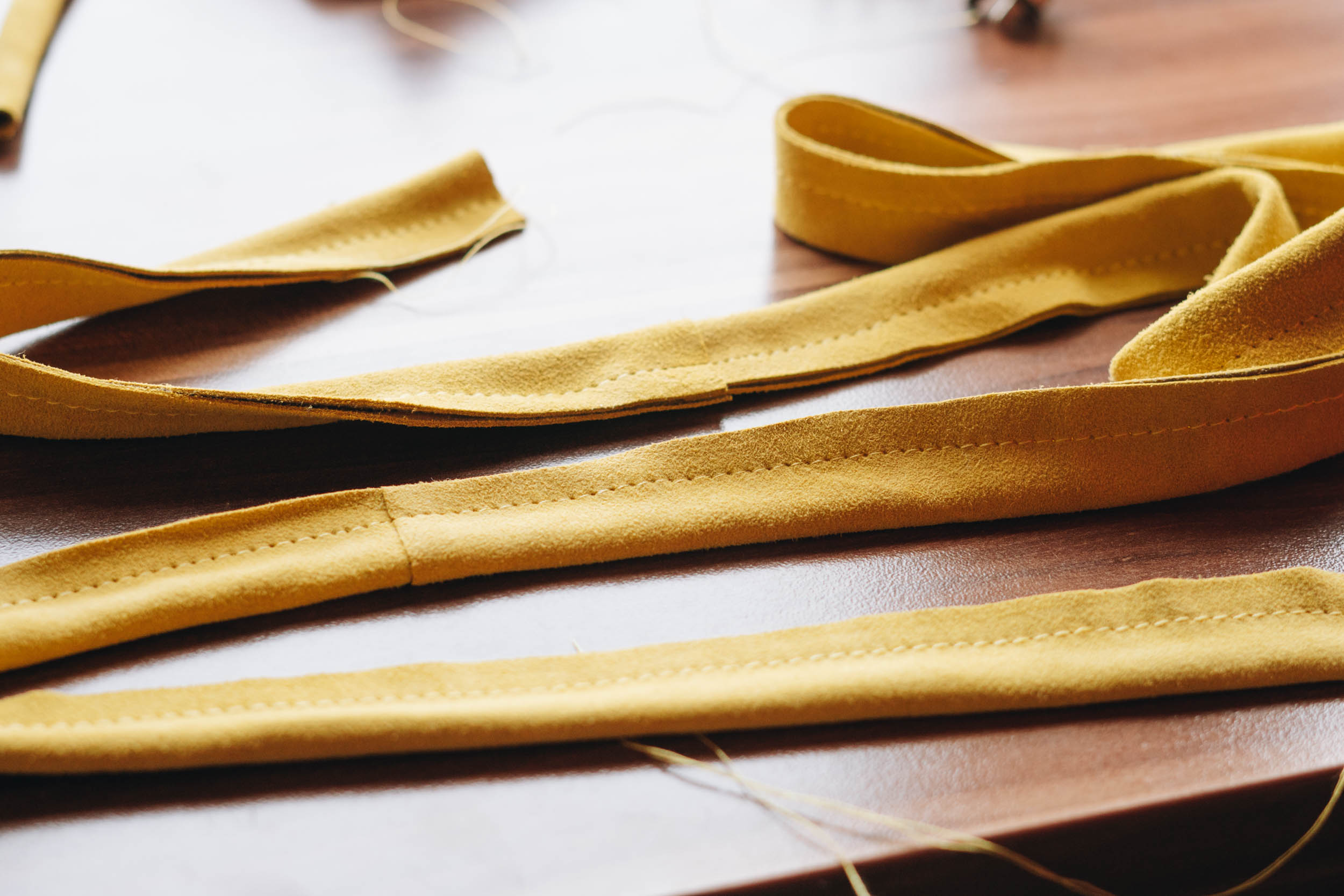 ​​Fädle die Bänder durch die Schlaufen und mach an den Enden bei den Schlaufen Knoten. Verbinde die anderen Enden mit dem Schiebeknoten (mehr zu Knoten folgt bald).