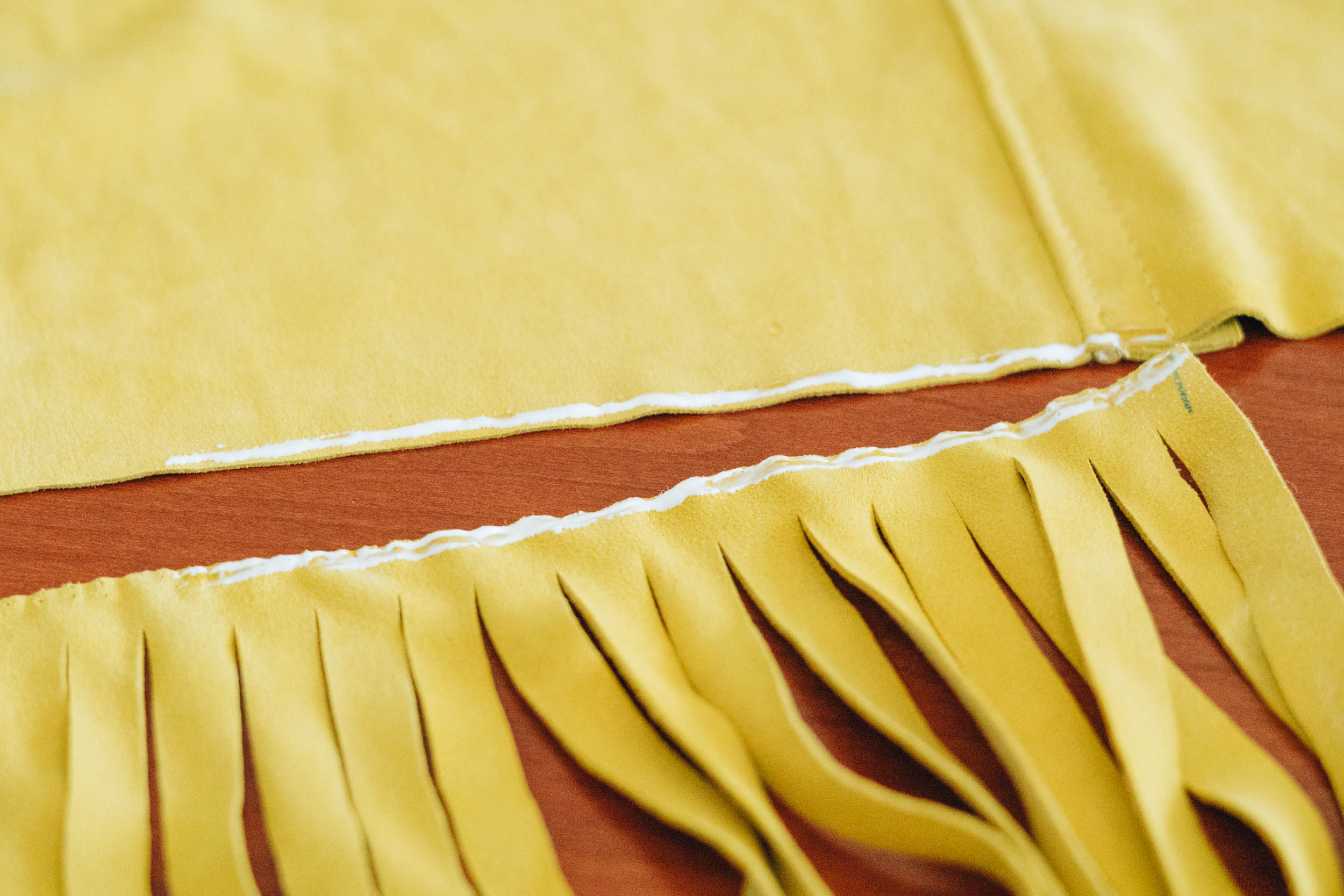 ​​Klebe die Fransen an den unteren Rand einer Seite deines Taschenkörpers und fixiere sie mit Klammern. Achte darauf, dass die Fransen und der Stoff rechts auf rechts liegen.