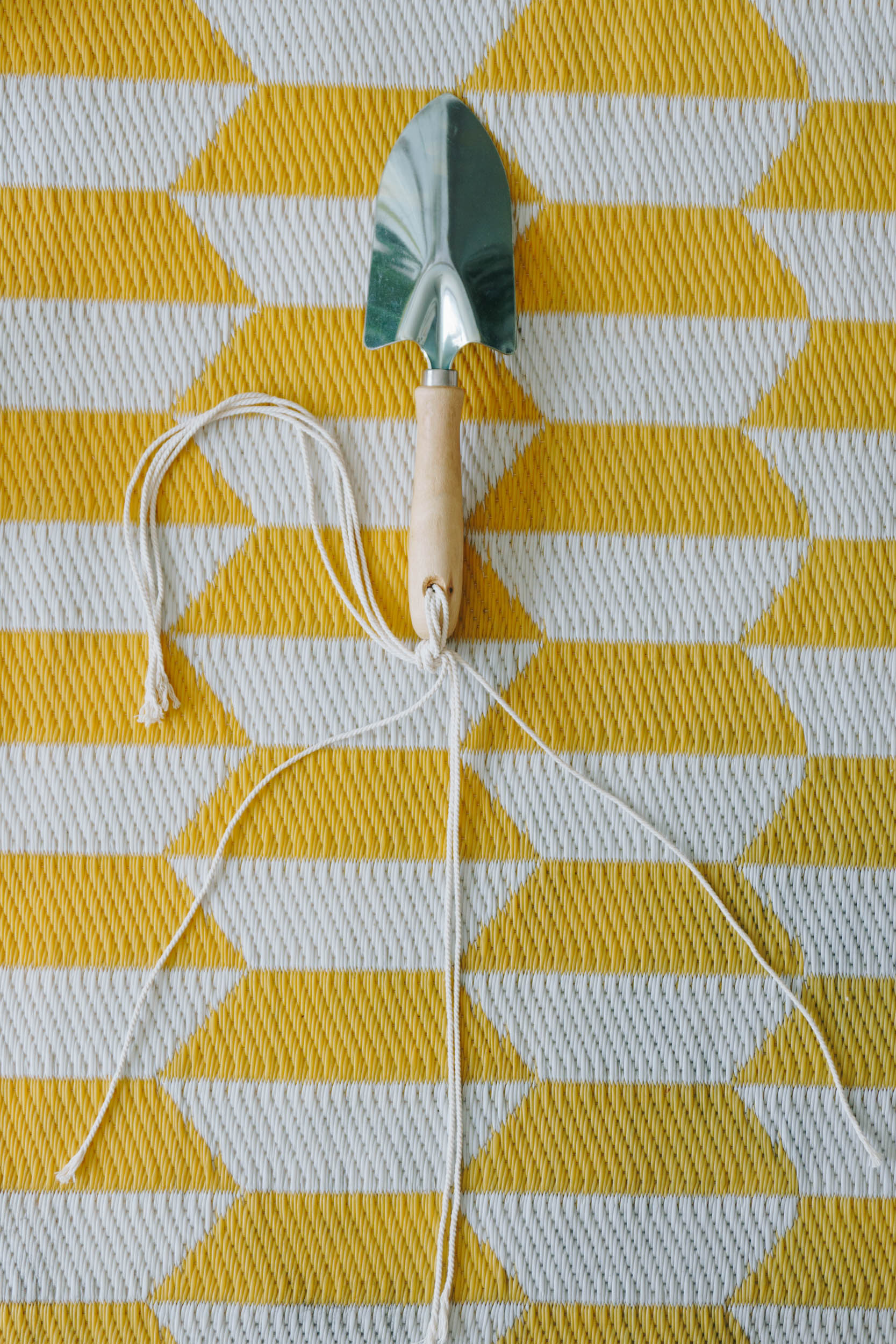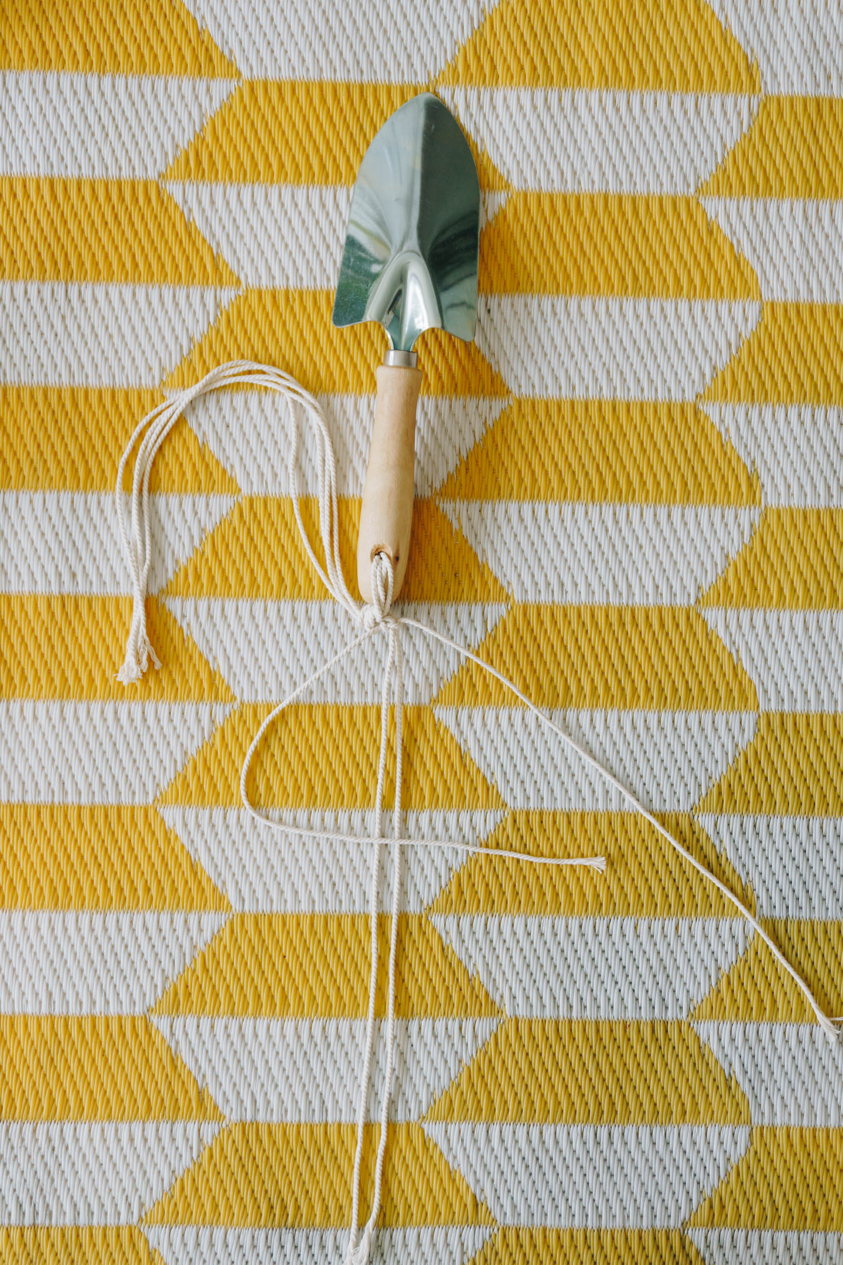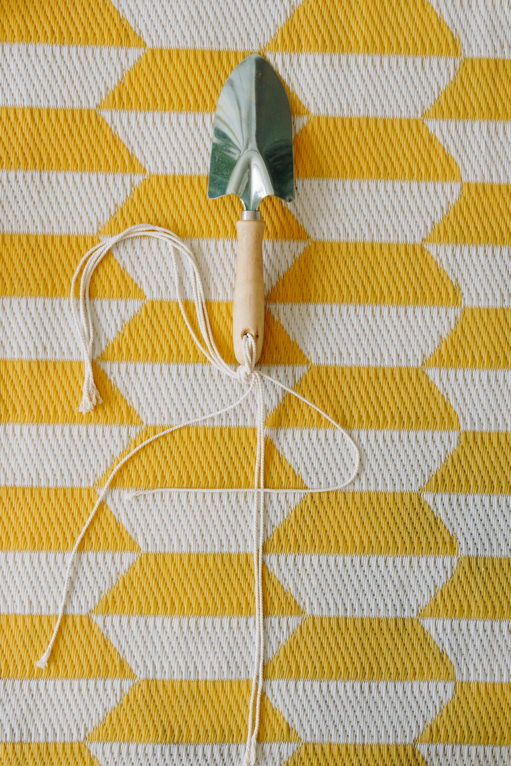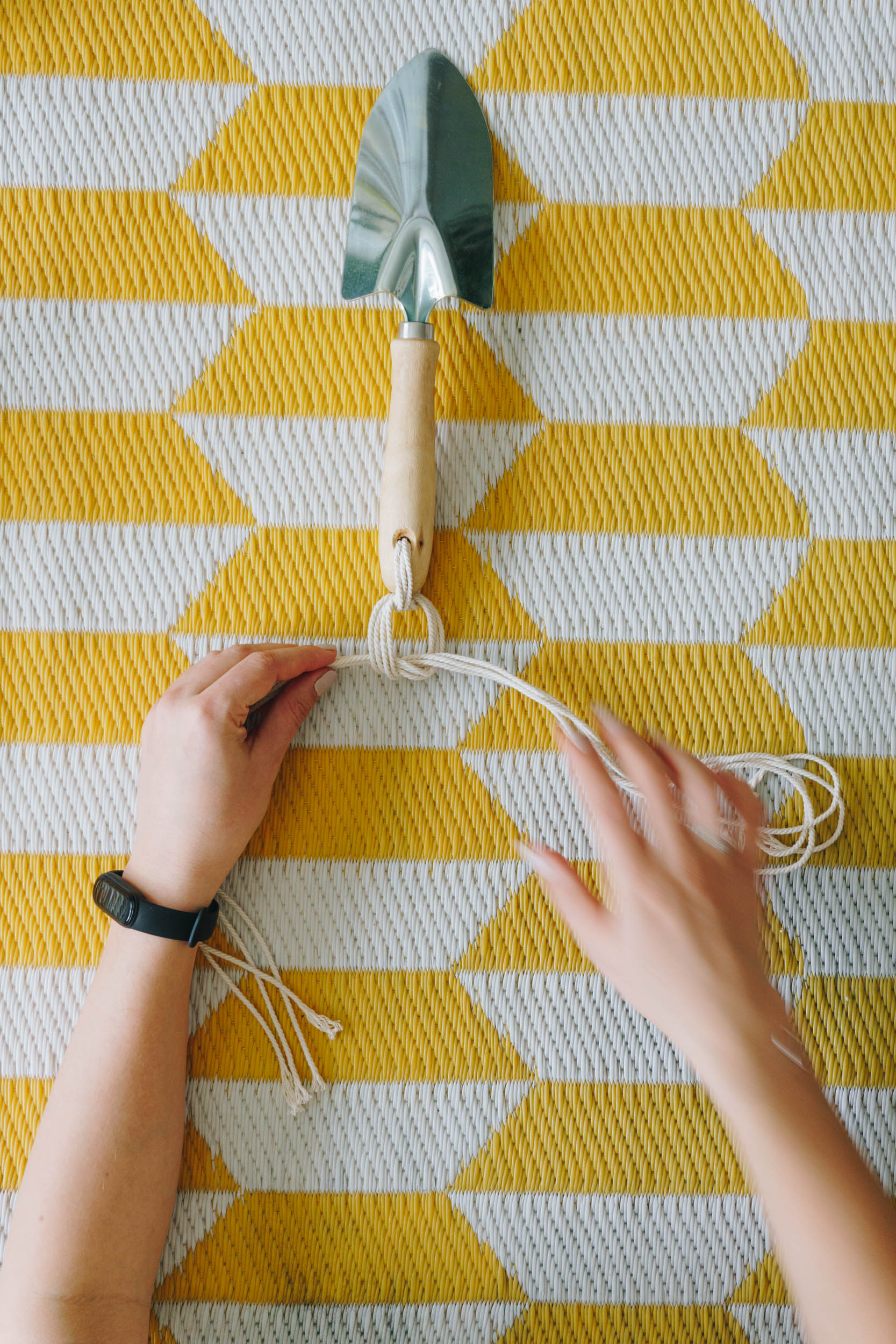 Ich habe 4 x 2m lange Stücke Garn zugeschnitten, durch das Loch im Griff gefädelt und verknotet.