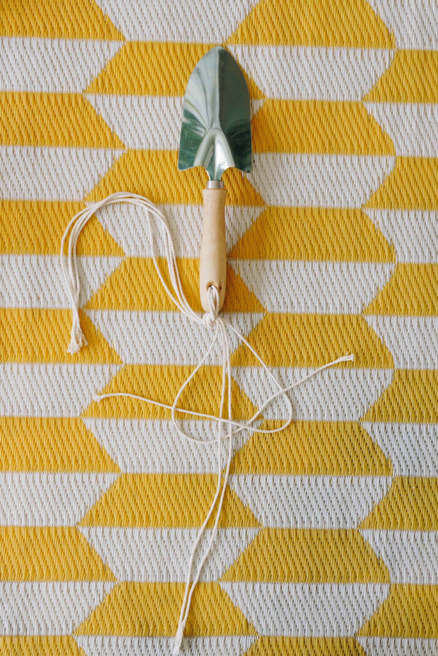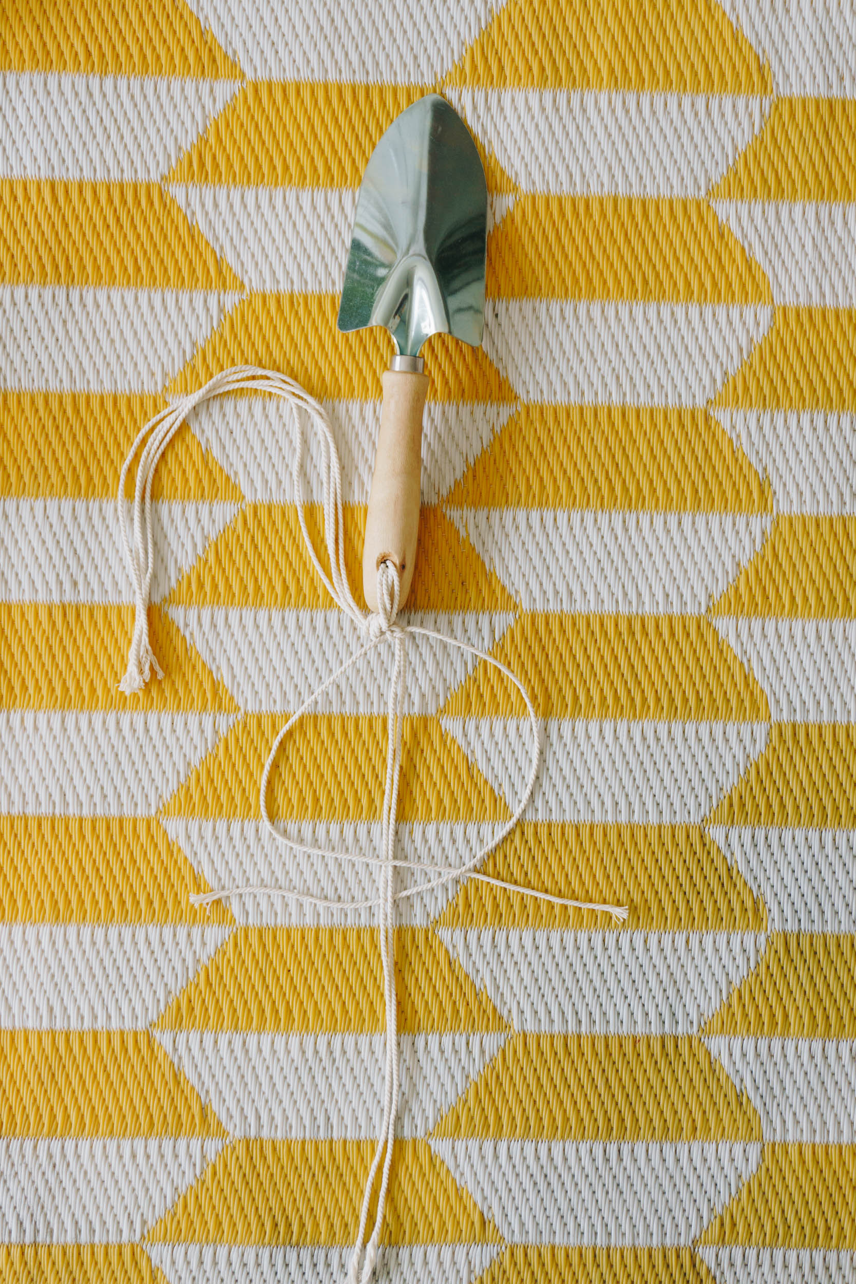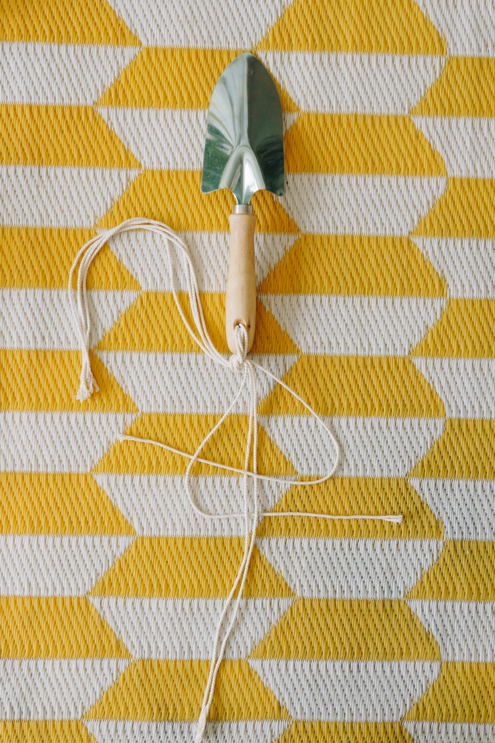 Ich habe 4 x 2m lange Stücke Garn zugeschnitten, durch das Loch im Griff gefädelt und verknotet.