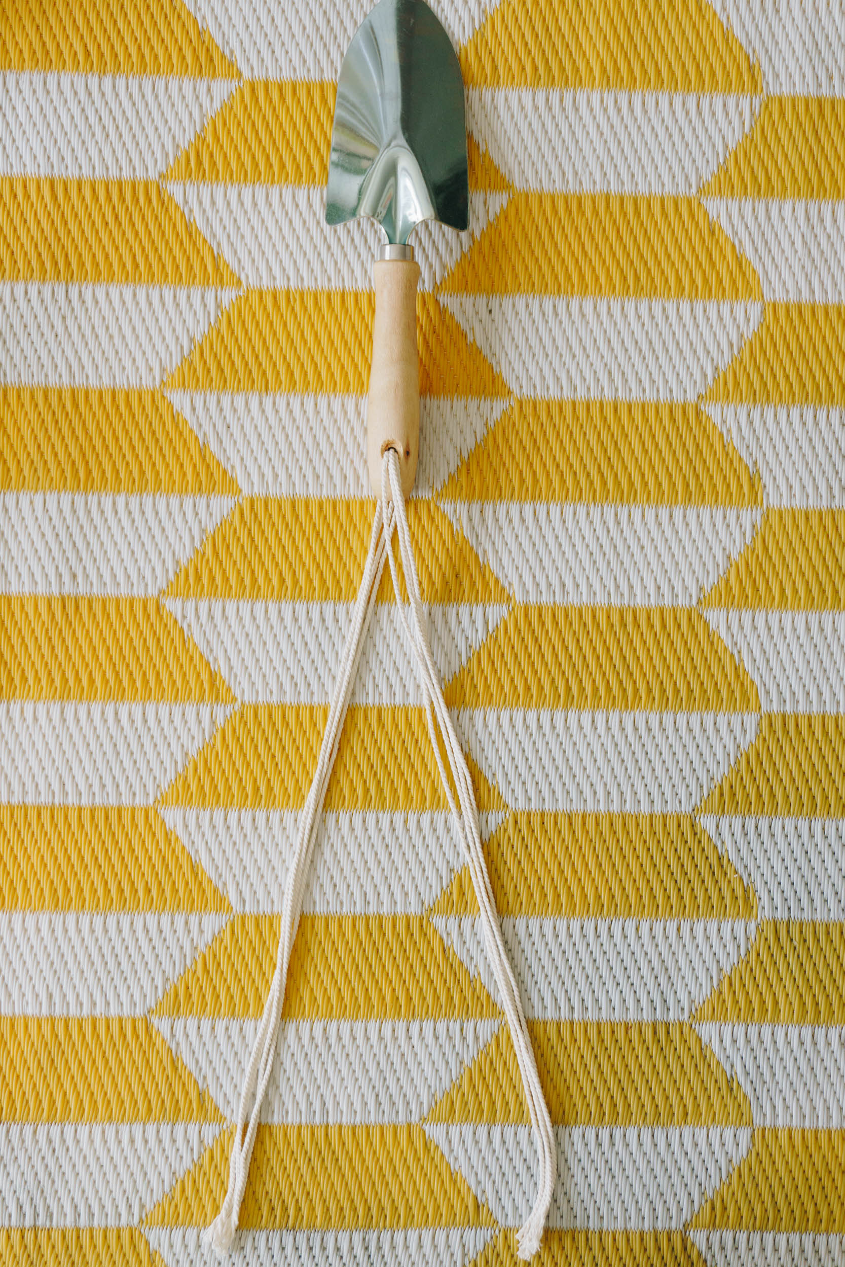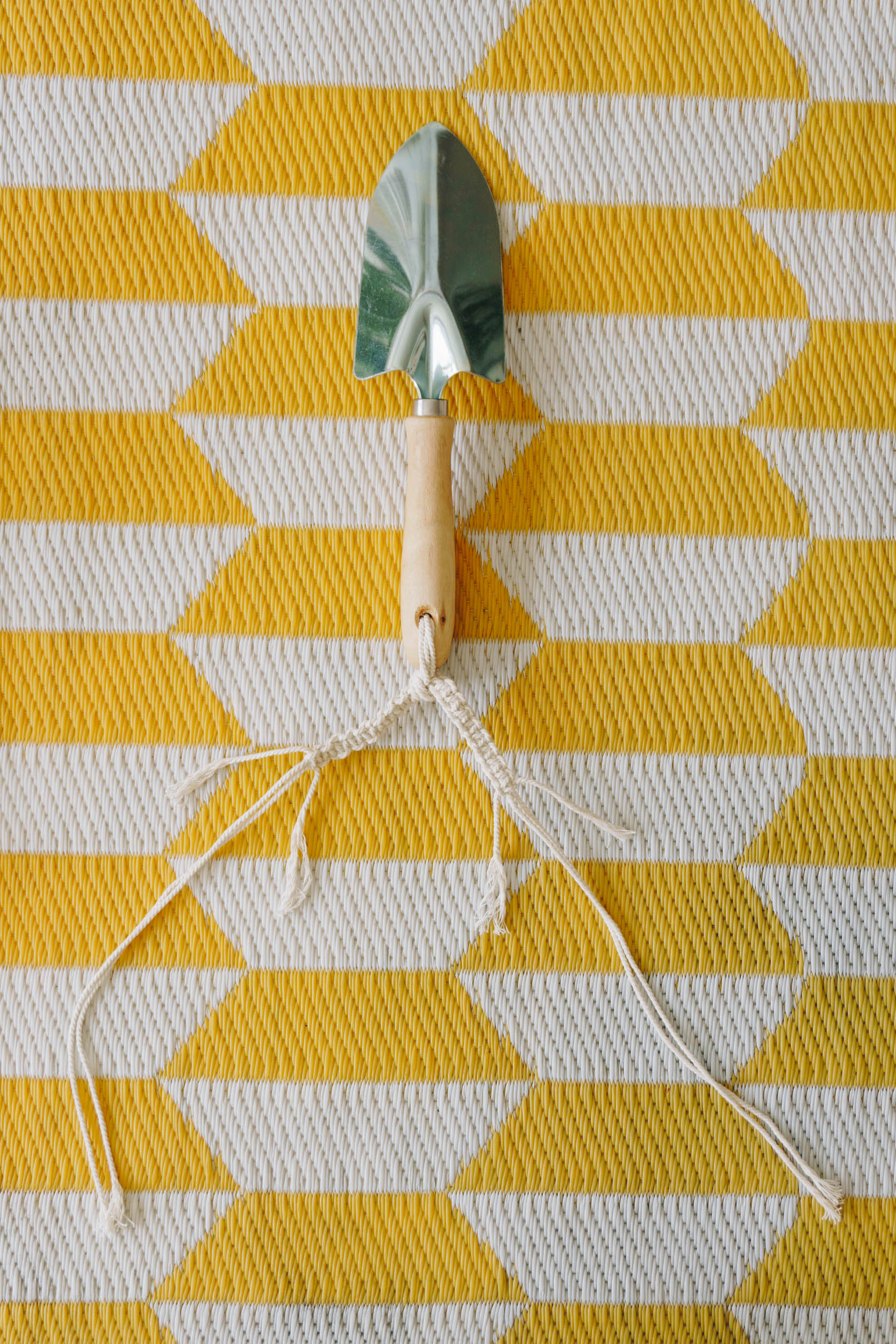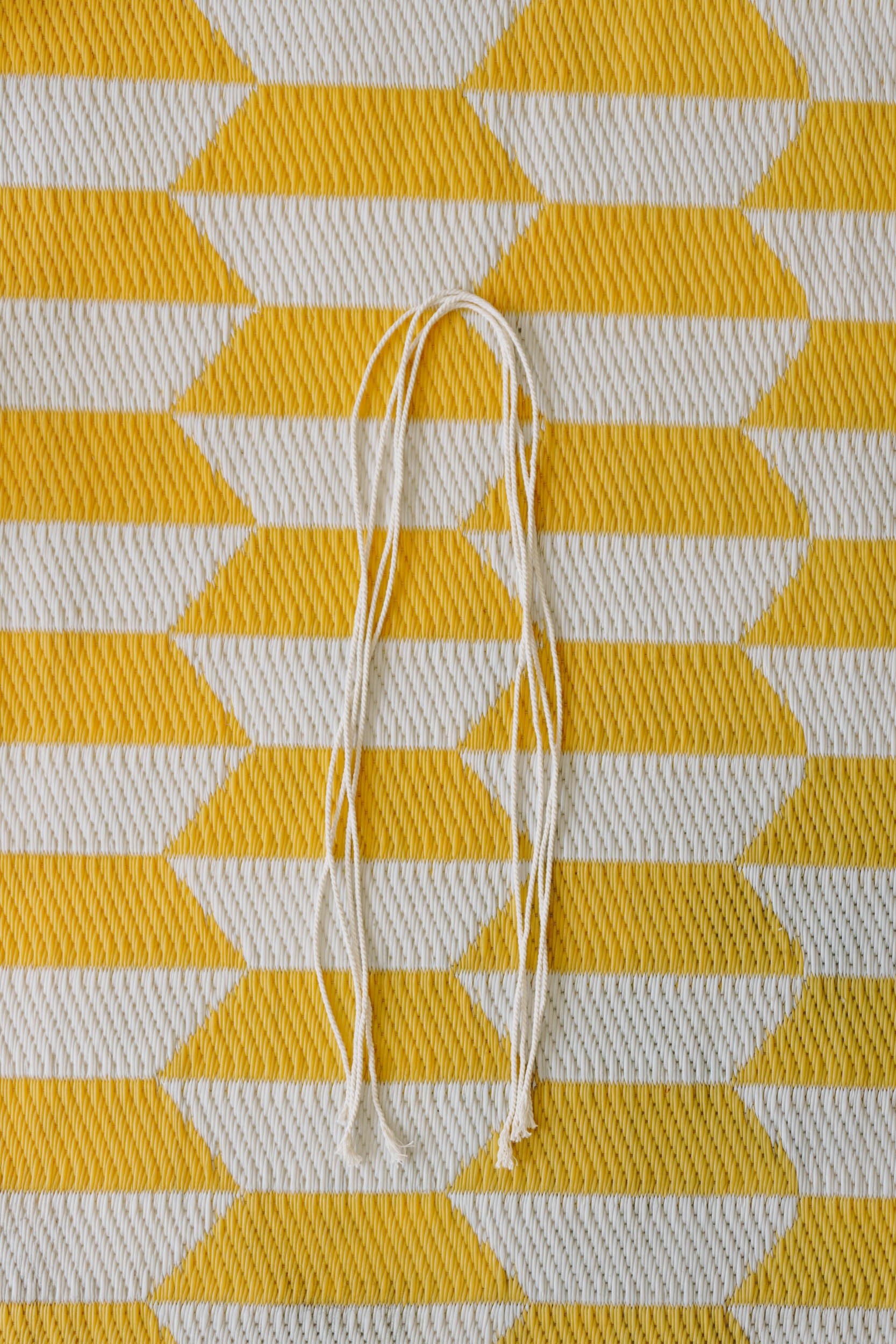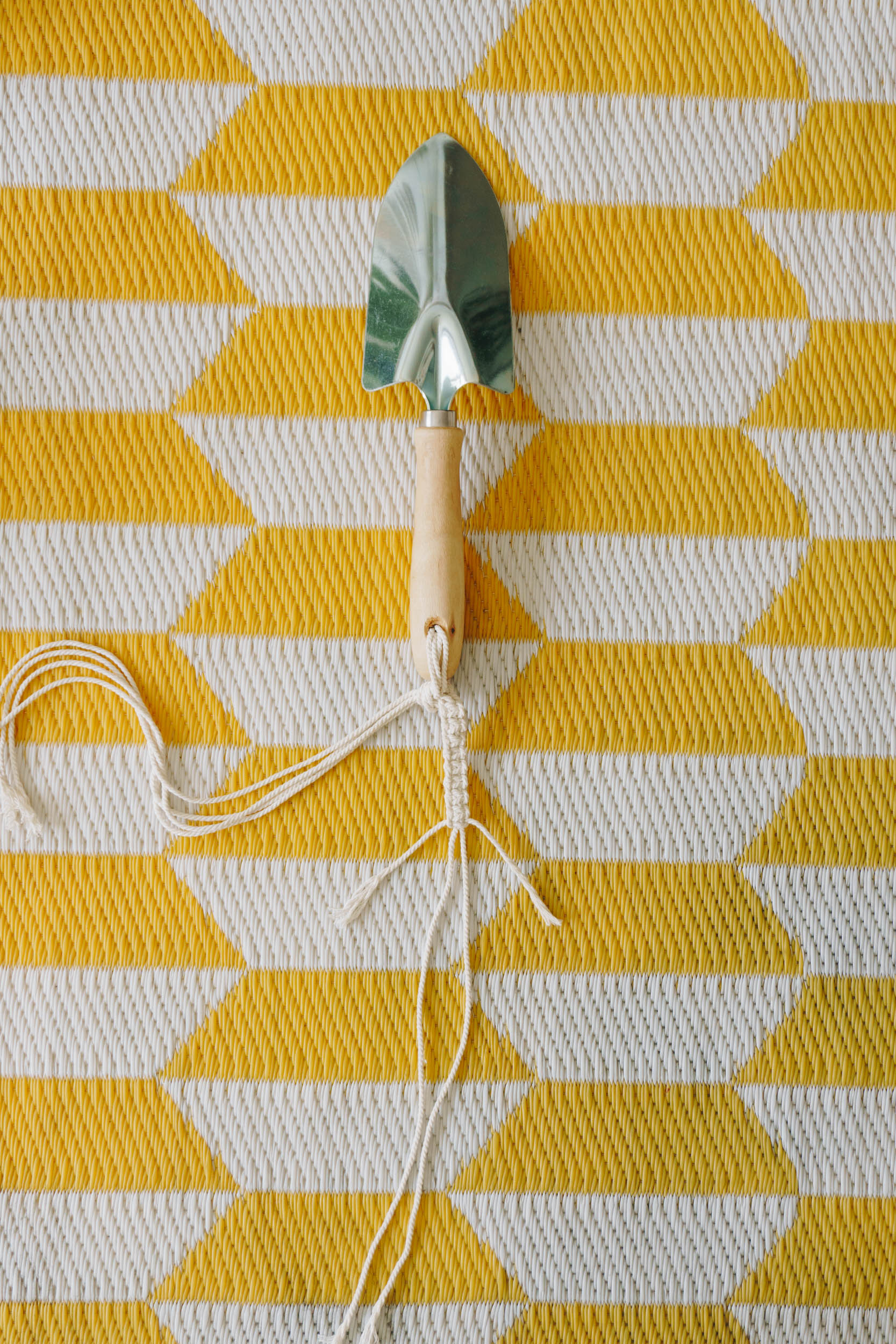 Ich habe 4 x 2m lange Stücke Garn zugeschnitten, durch das Loch im Griff gefädelt und verknotet.