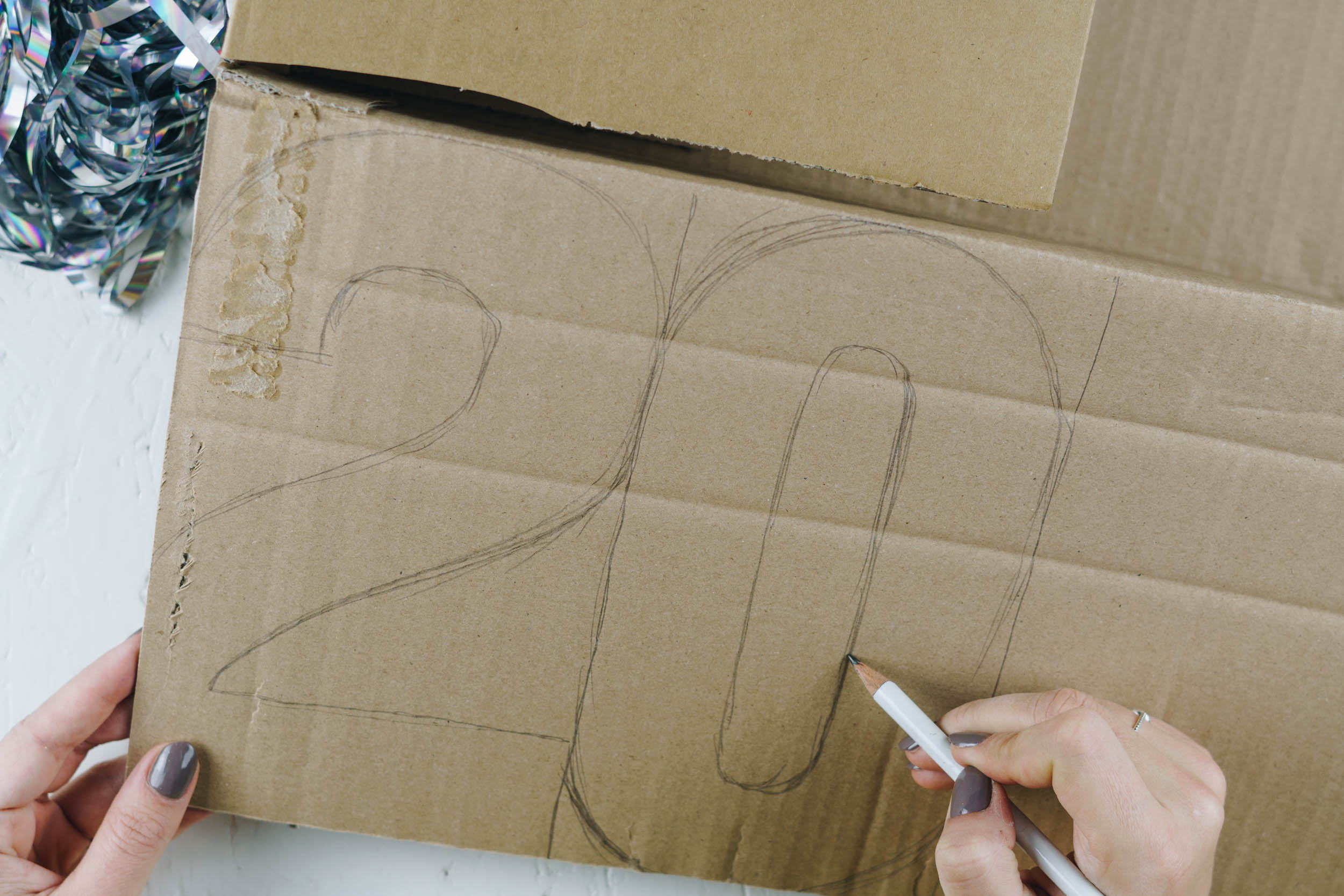 Schneide die Zahlen 2020 aus dem Karton aus. Nimm dein ĂŒbrig gebliebenes Lametta von Weihnachten, knĂŒlle es zu kleinen BĂ€llen zusammen und klebe sie auf den Karton. Lass alles gut trocknen. Fertig! Deine glitzernden Zahlen kannst du nun aufhĂ€ngen, aufstellen oder fĂŒr ein tolles Instagram-Bild nutzen!
