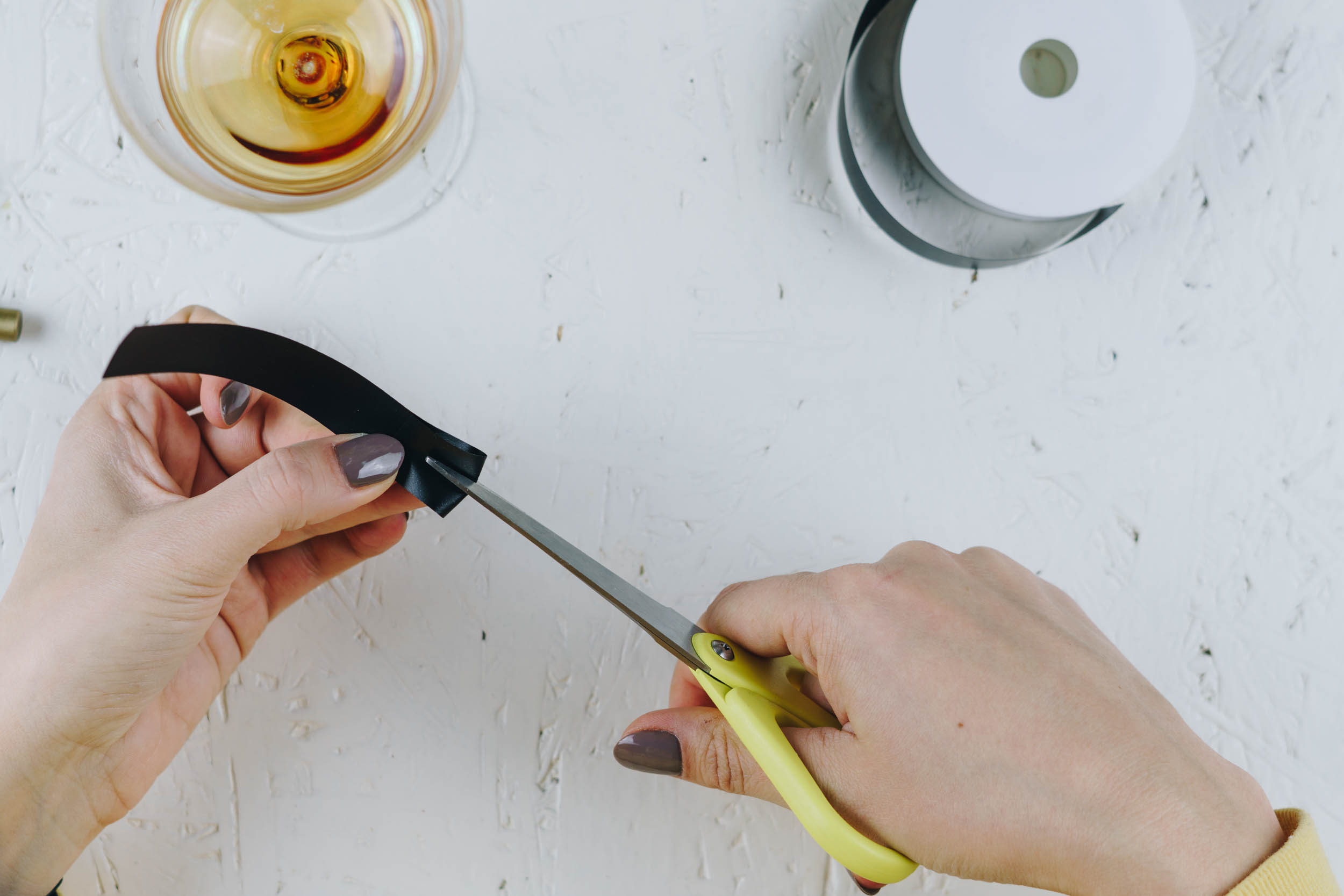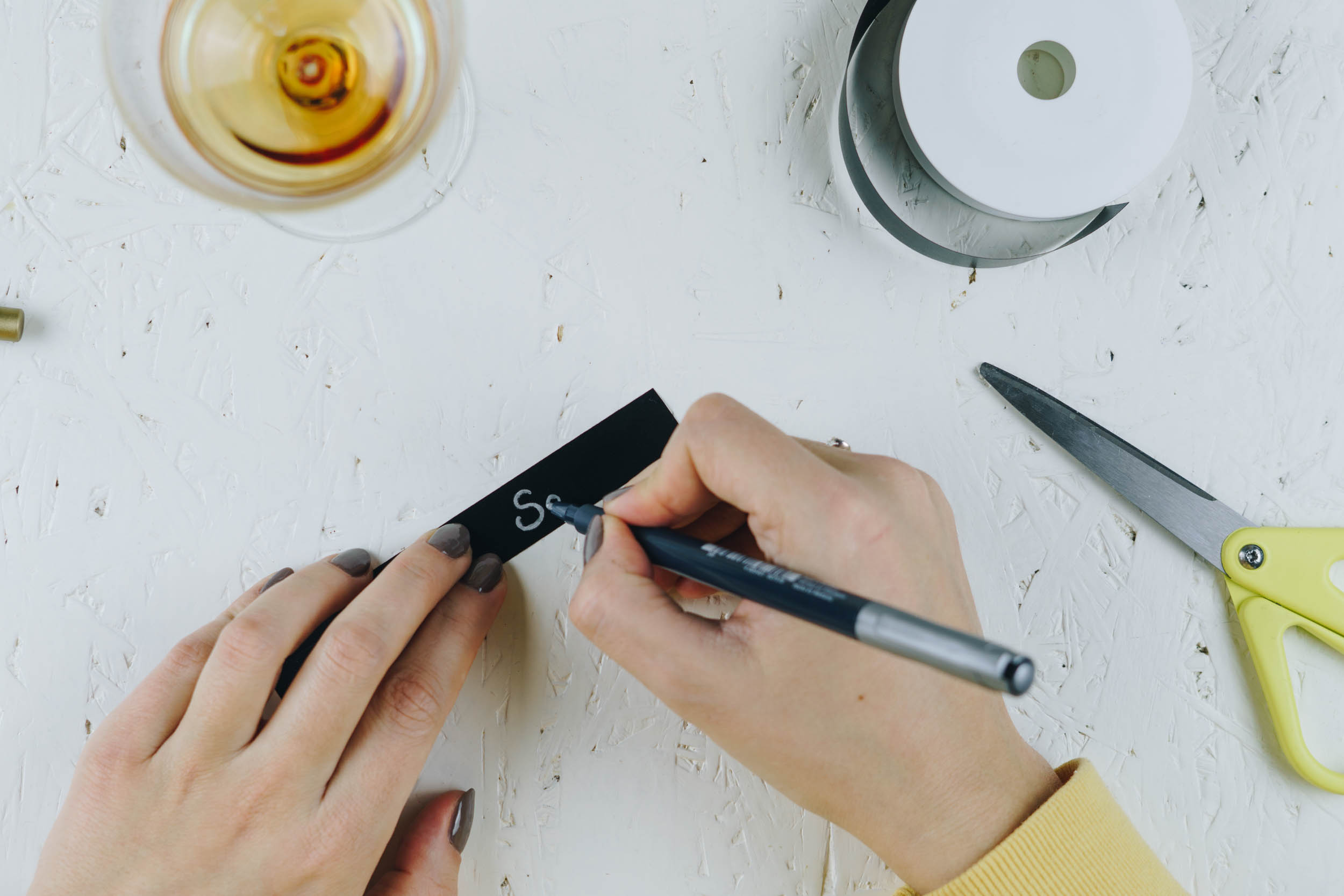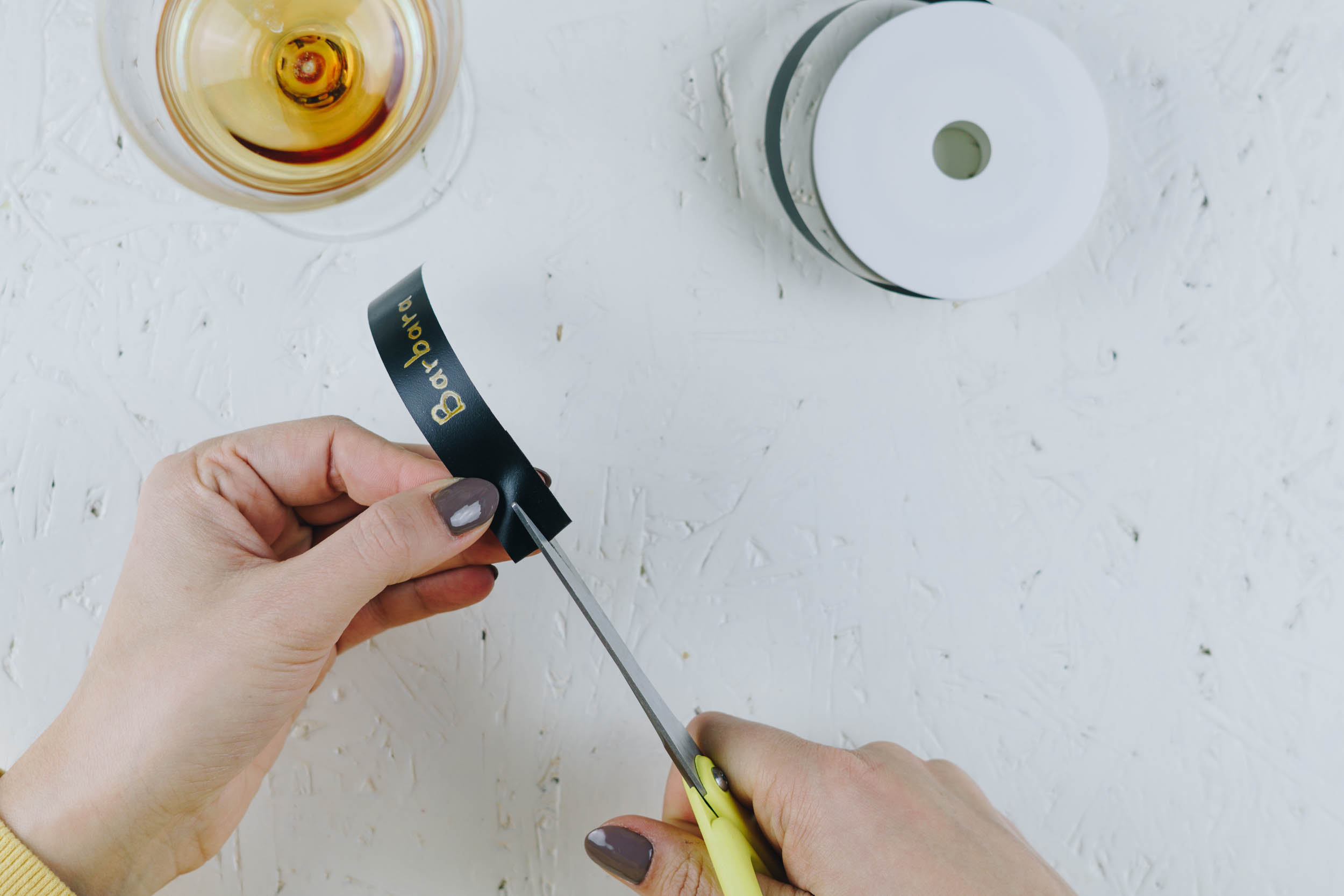 Schneide ca. 5 cm lange BÀnder ab. An einem Ende des Bandes schneidest du einen Schlitz, durch den du das andere Ende fÀdeln kannst. Schreibe den Namen deines Gastes mit Lackstift auf das Band am Ende ohne Schlitz. Lege nun das Band um das Glas und fÀdle das Ende mit Namen durch den Schlitz. Fertig und Prost!