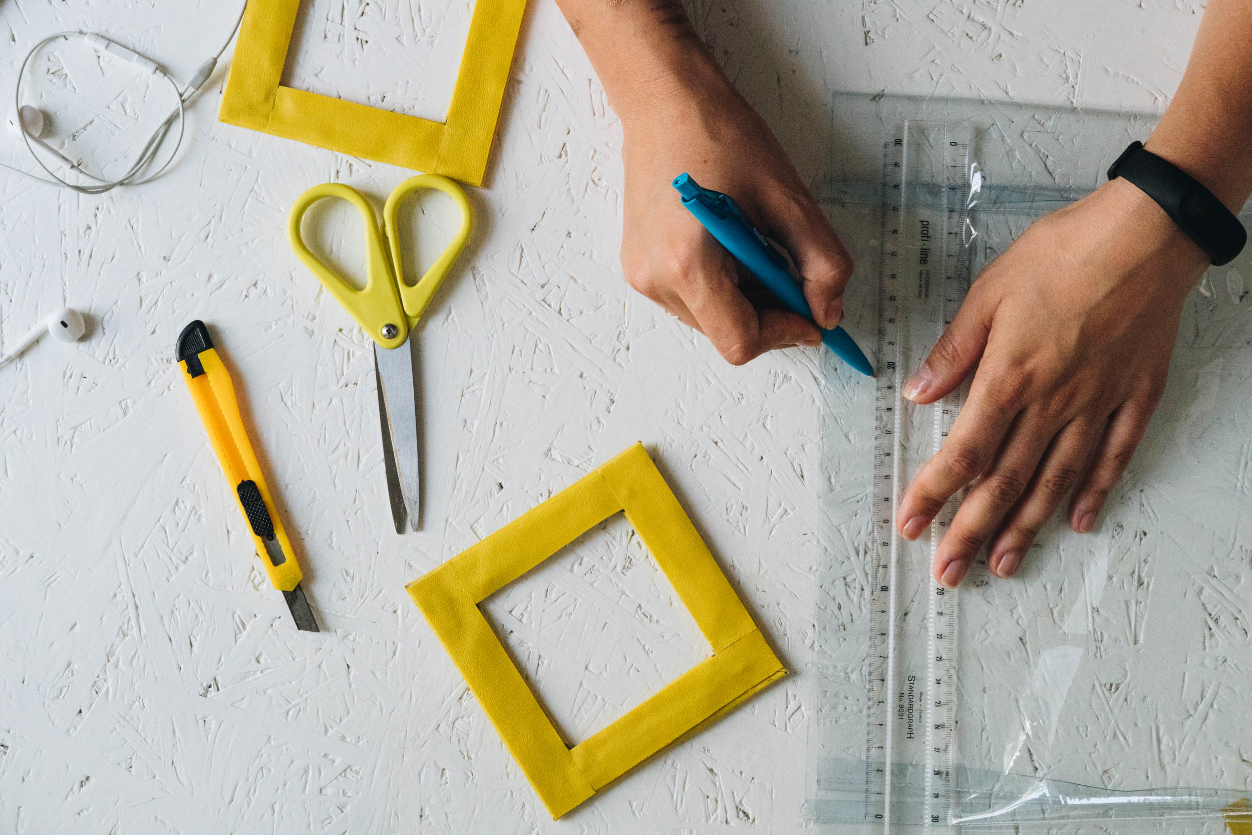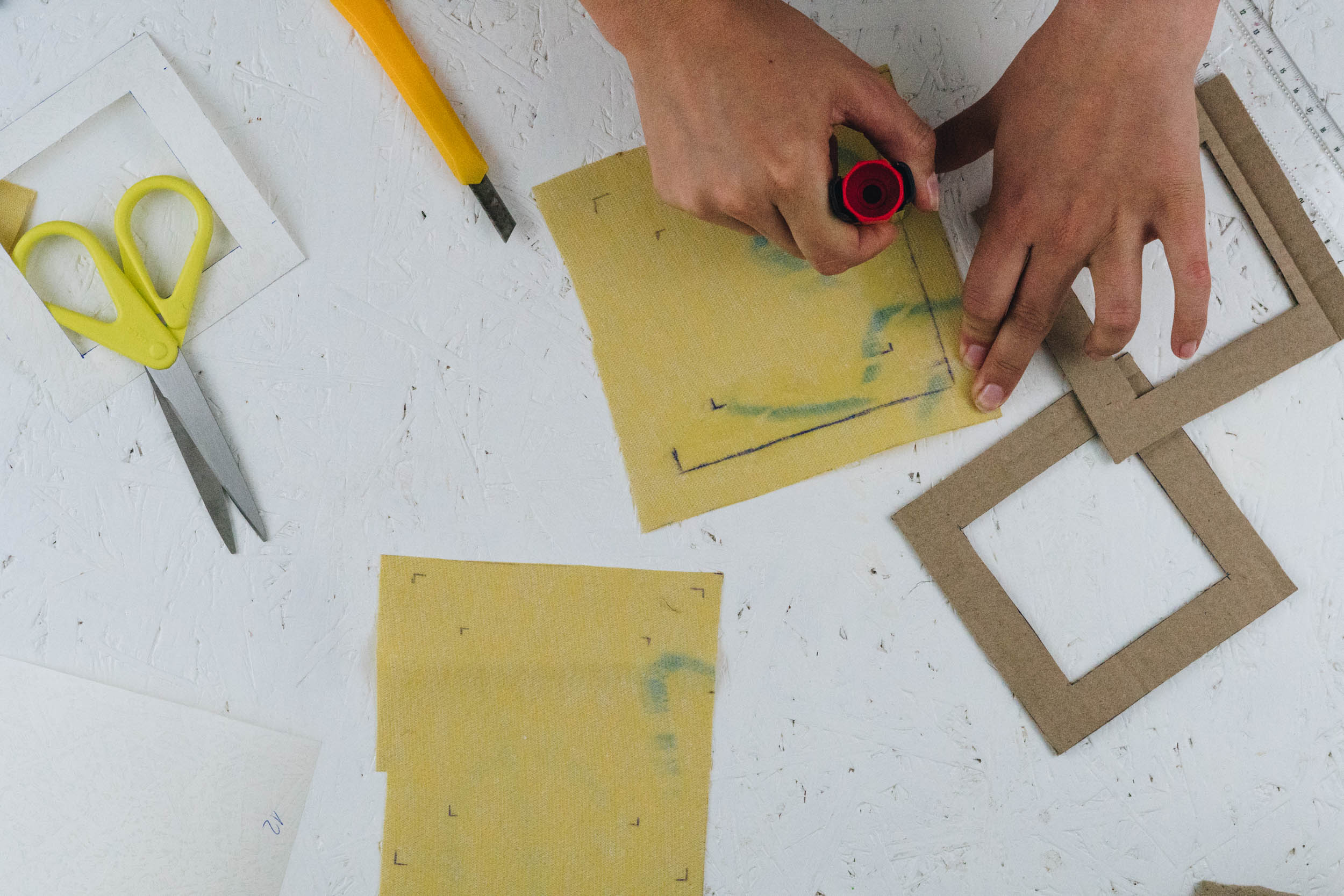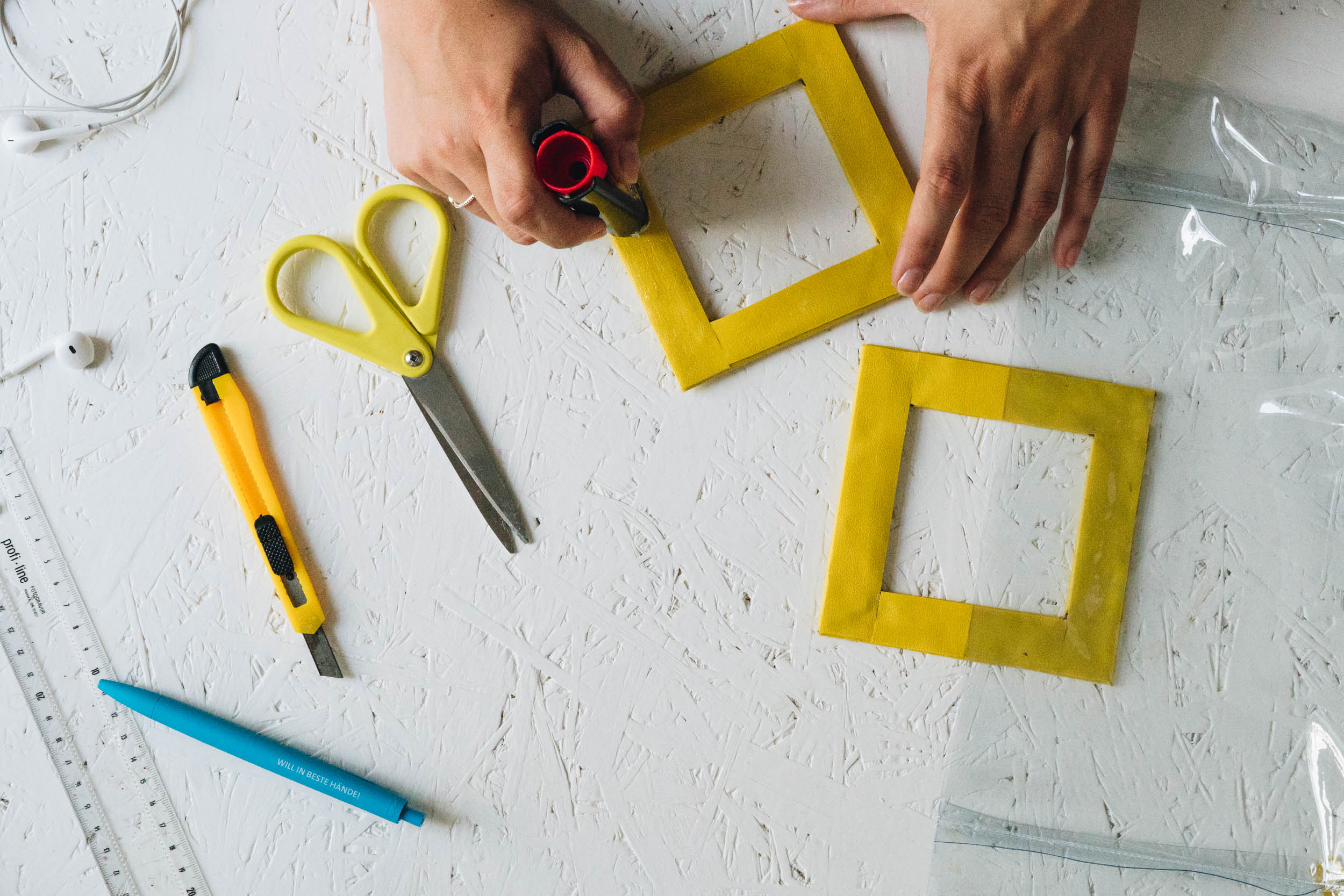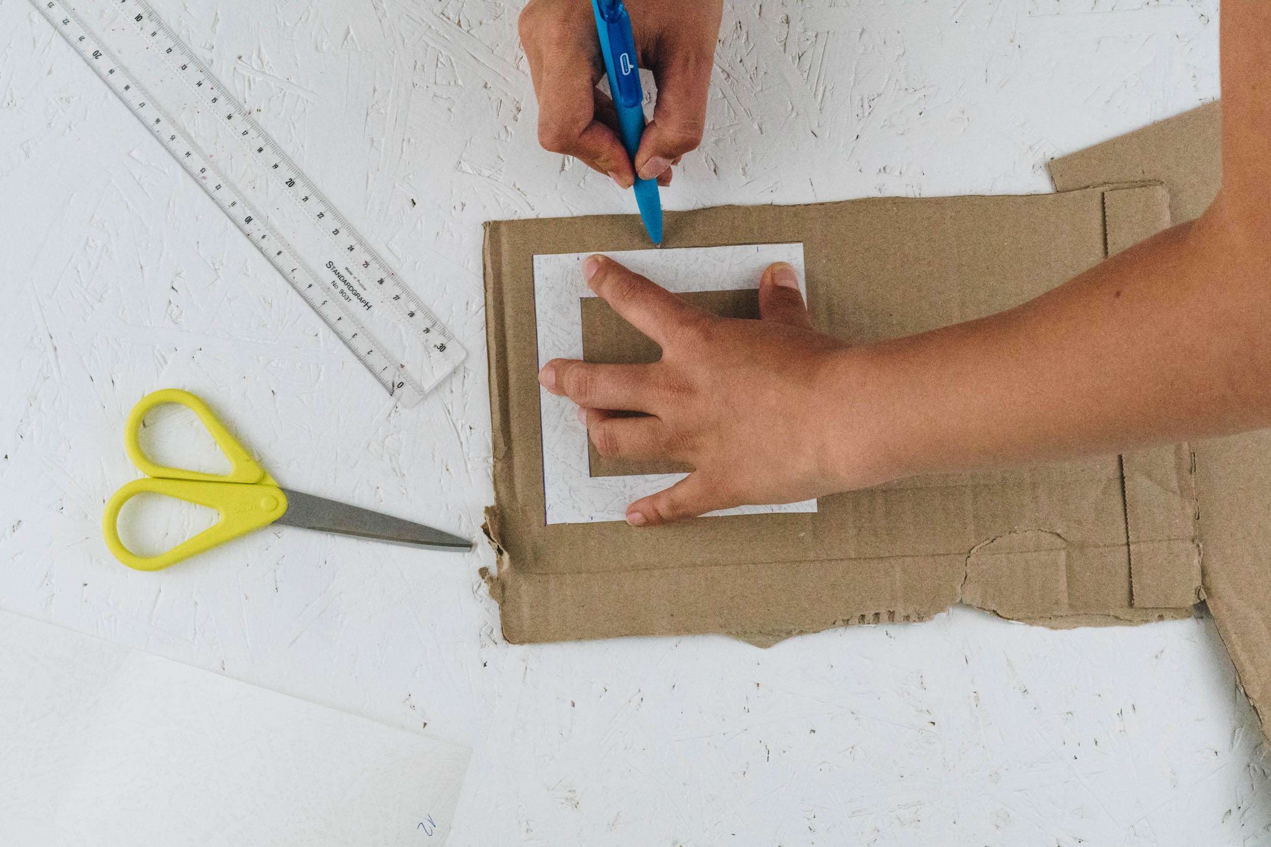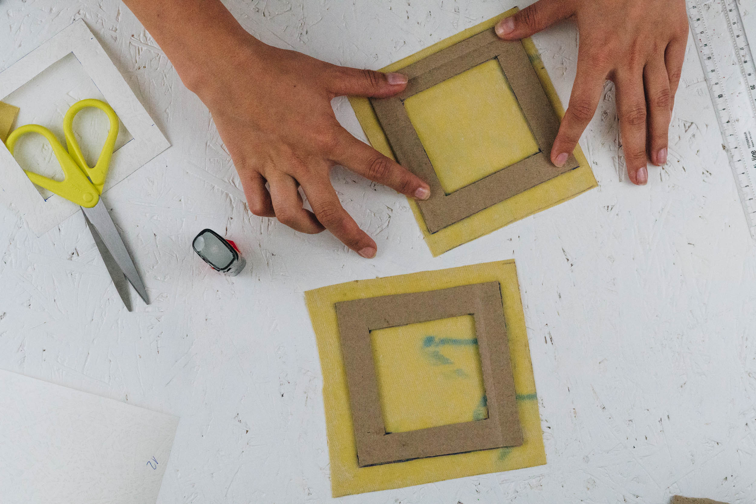 Schneide aus dickem Karton einen Rahmen in 12 cm x 12 cm mit einer Rahmendicke von 2 cm. Übertrage die Maße auf dein Leder und schneide es so zu, dass ein Rand von mind. 1cm über den Rahmen drüber stehend übrig bleibt. Klebe den Karton auf das Leder.