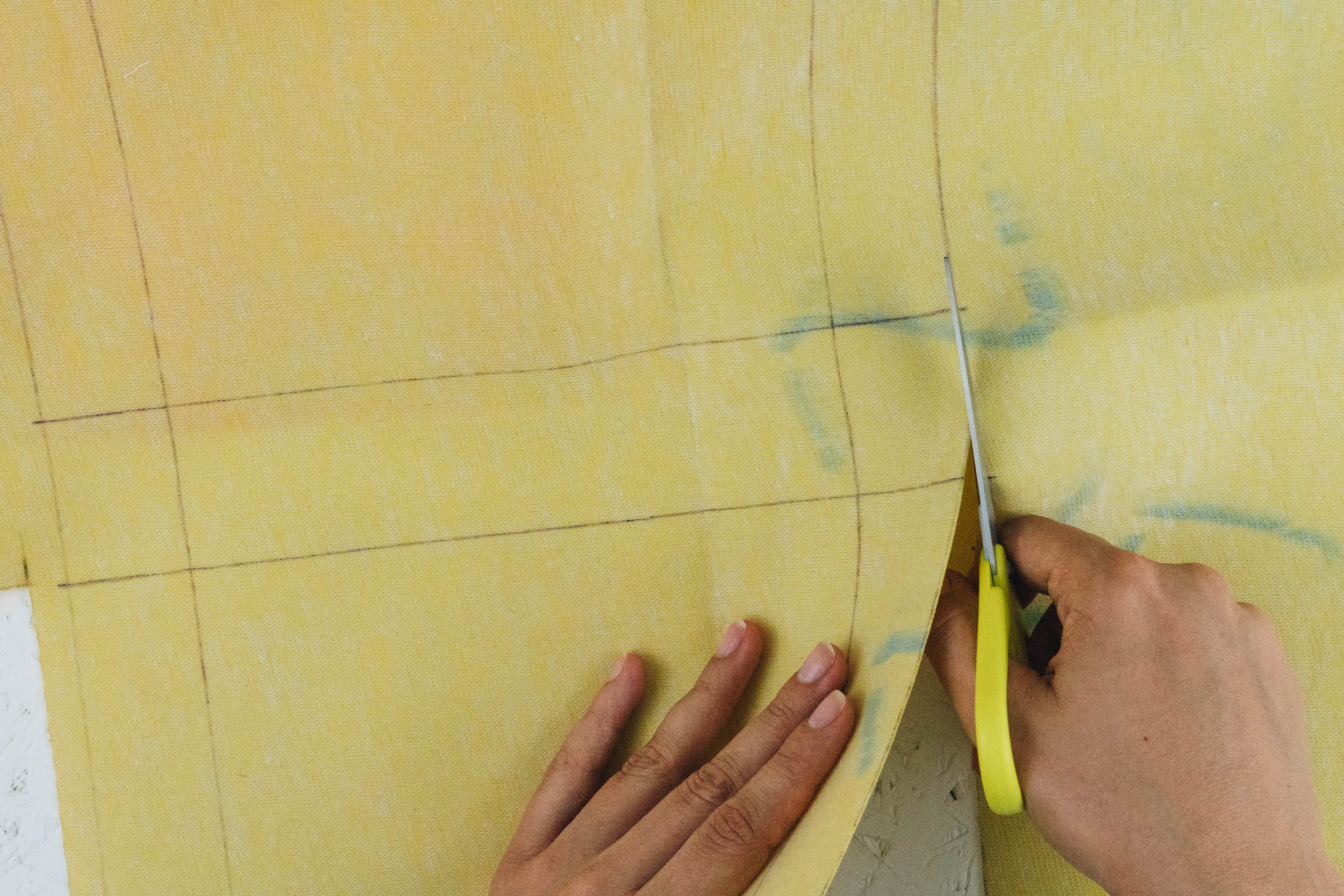Übertrage die Vorlage auf das Innenfutter, schneide sie aus und lege Leder und Futter rechts auf rechts.