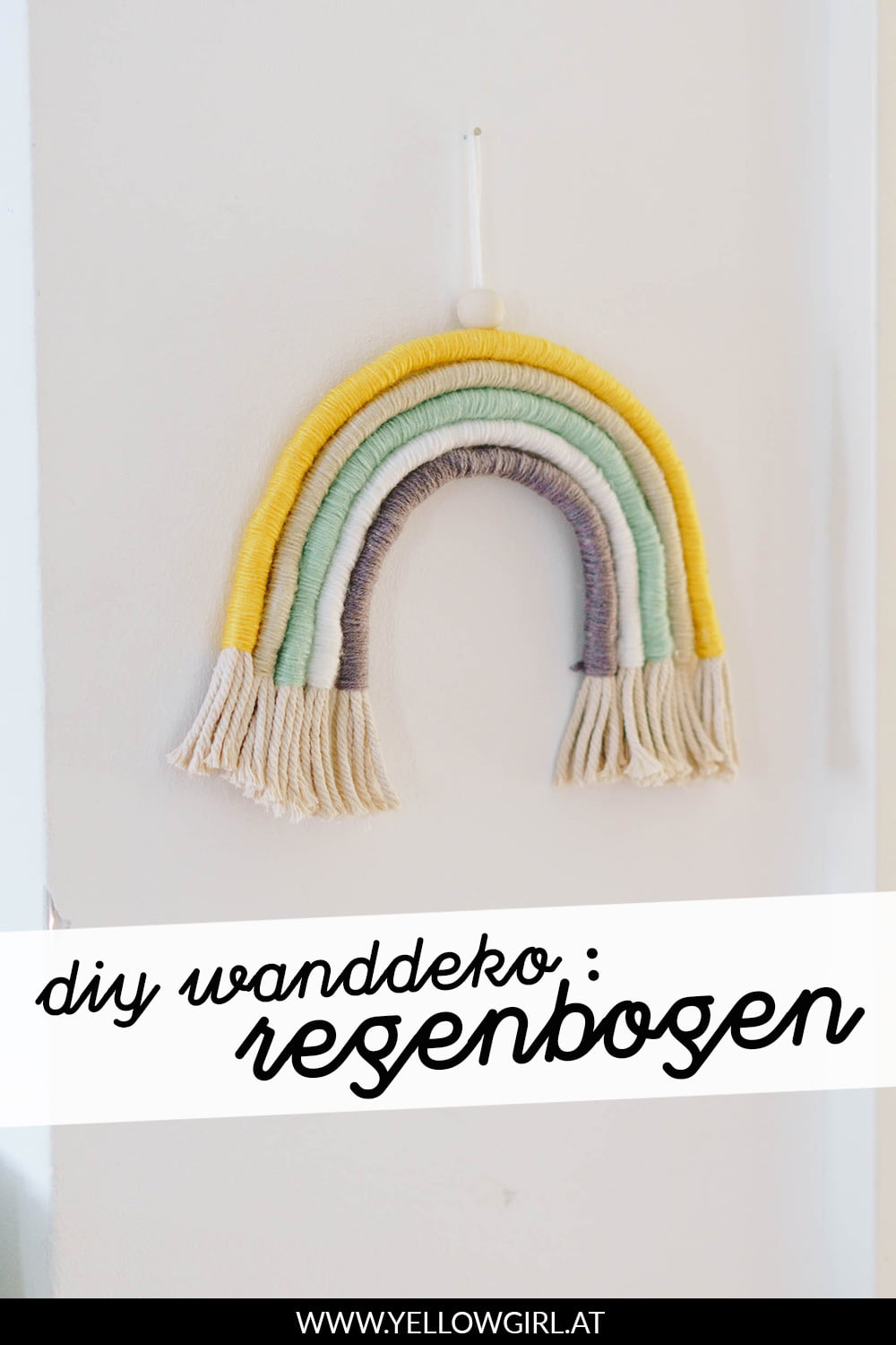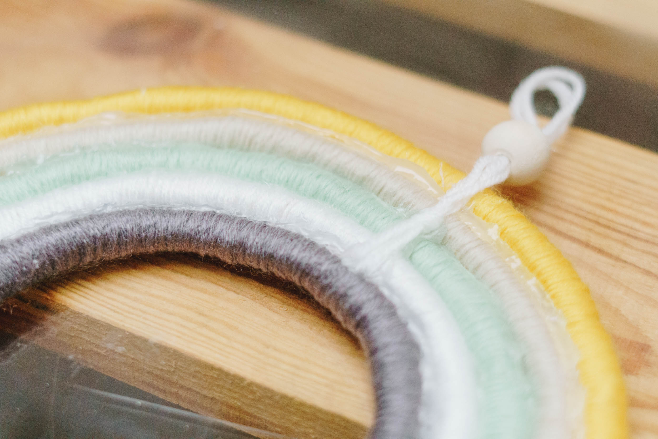 Schneide die Kordeln zu und umwickle sie mit der Wolle. Klebe die einzelnen Streifen des Regenbogens zusammen. Fertig! Die genaue Anleitungen findest du auf der Verpackung deines Regenbogen-Sets. Viel Freude beim basteln!