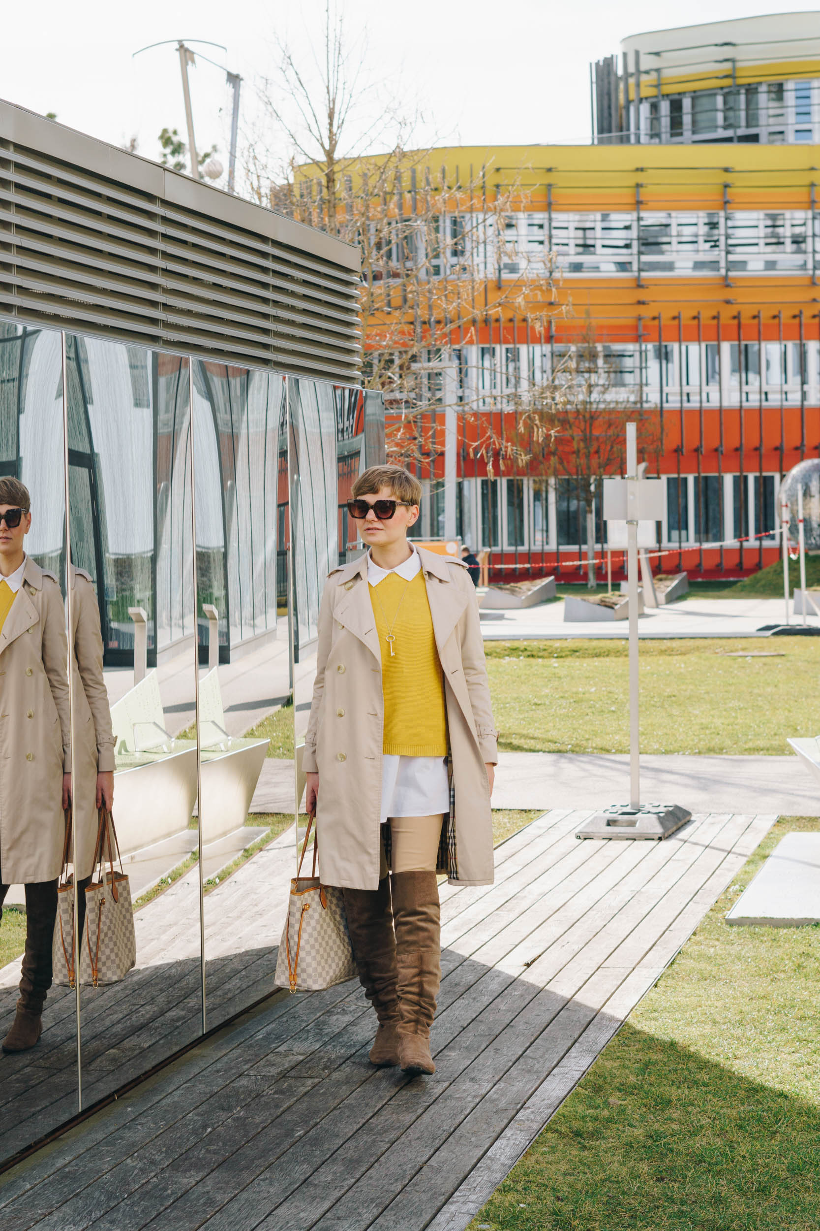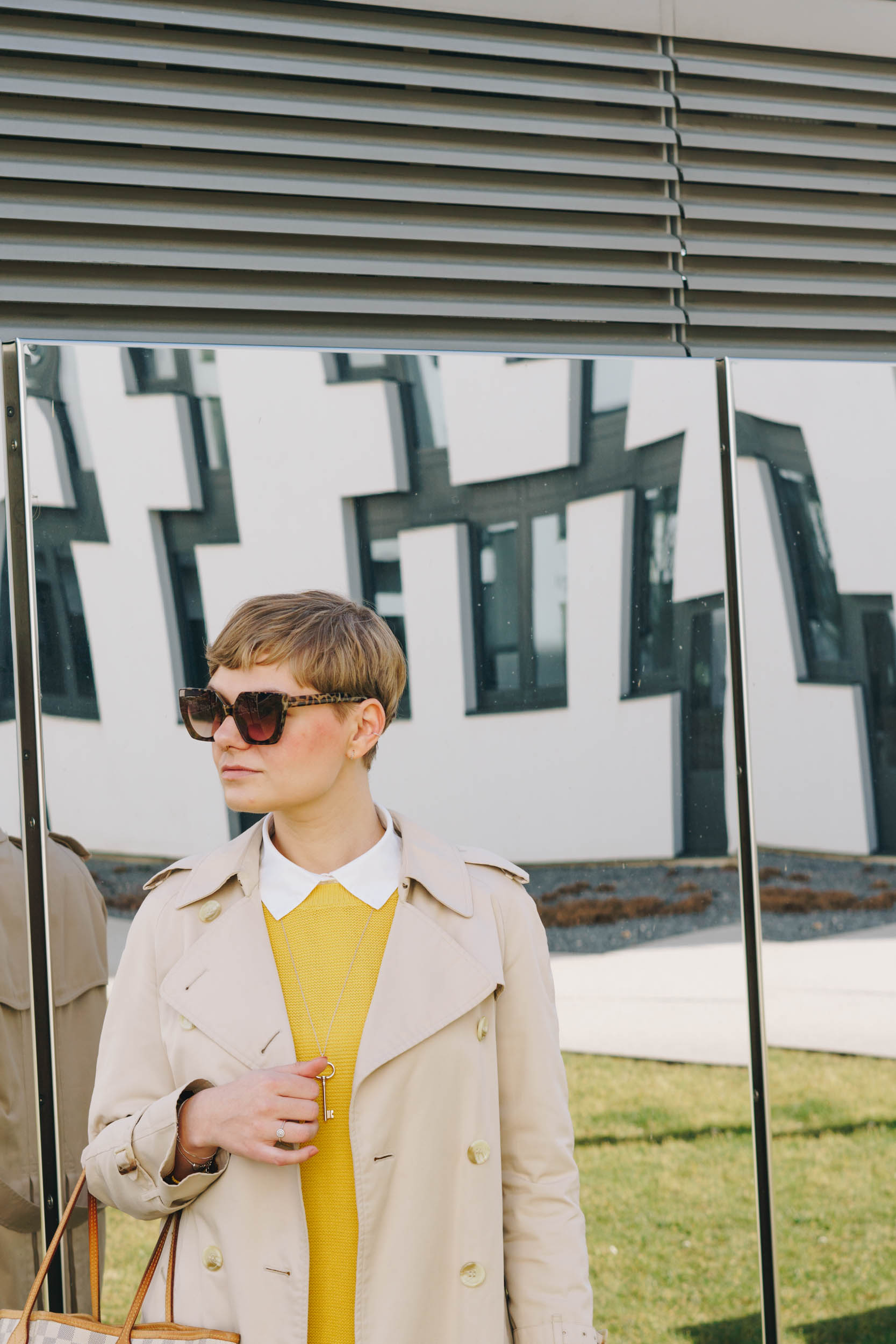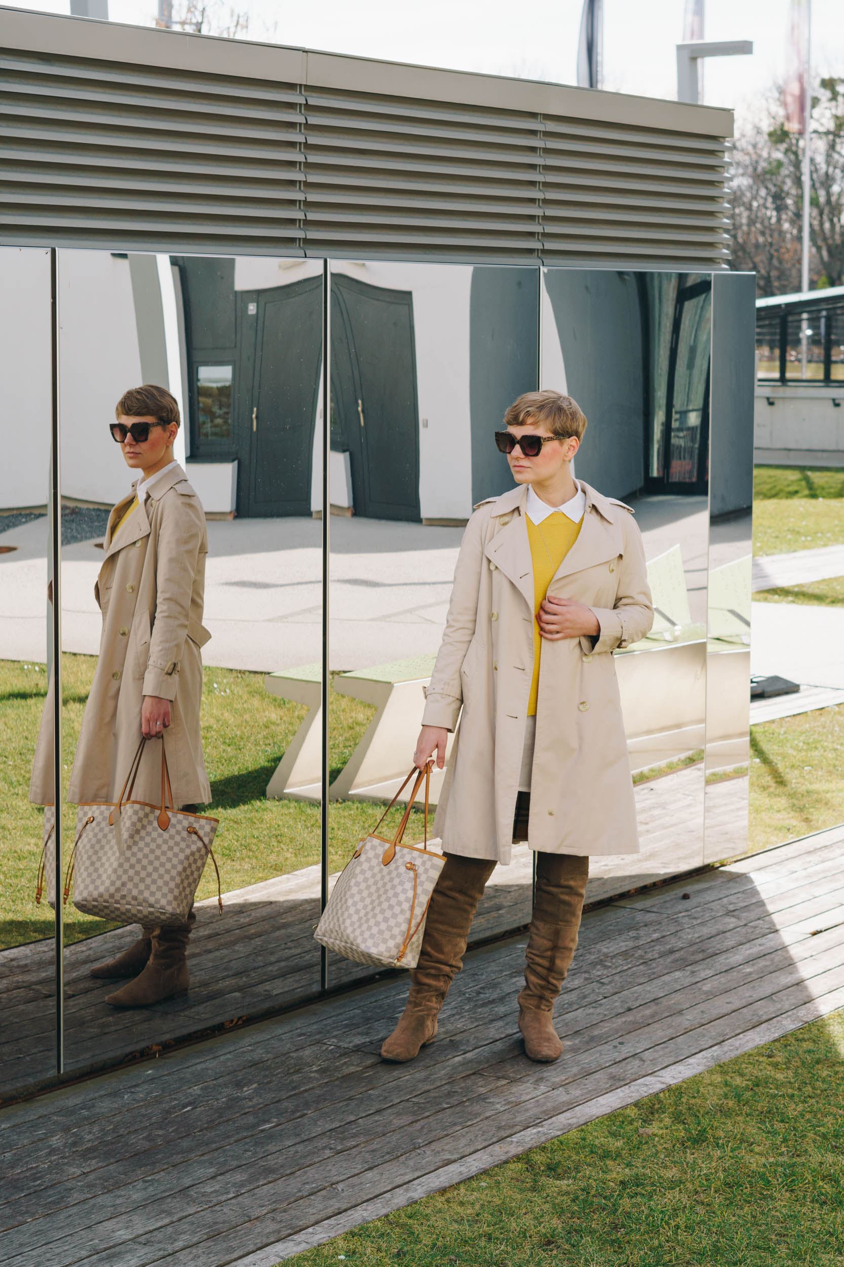 Auf den Bildern trage ist eine Bluse von cos, Trenchcoat von Burberry, Pullover von Max Mara, Hose von jacquard jeans, Stiefel no name, Tasche Louis Vuitton, Sonnenbrille von Sheein und Halskette von Tiffany’s.