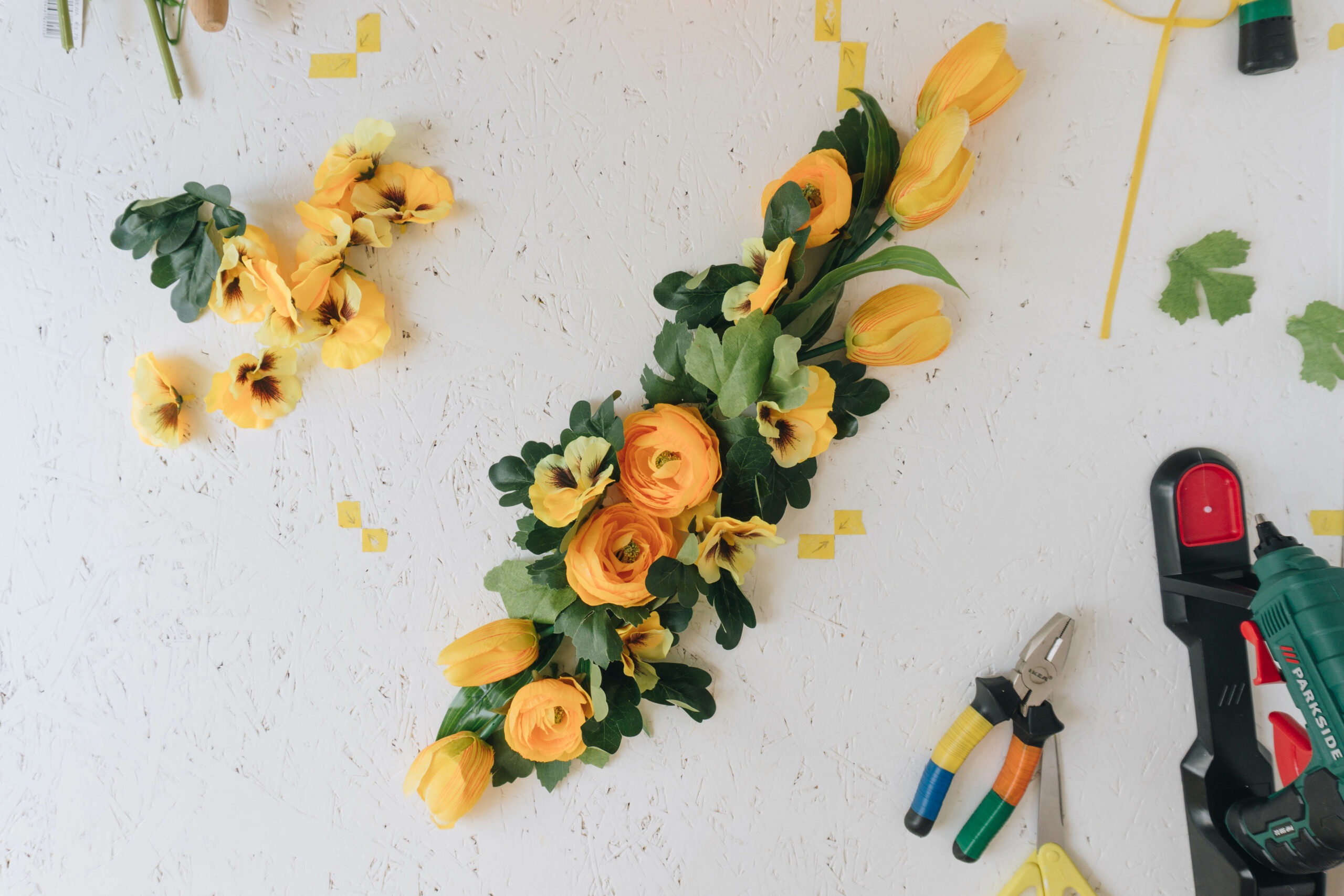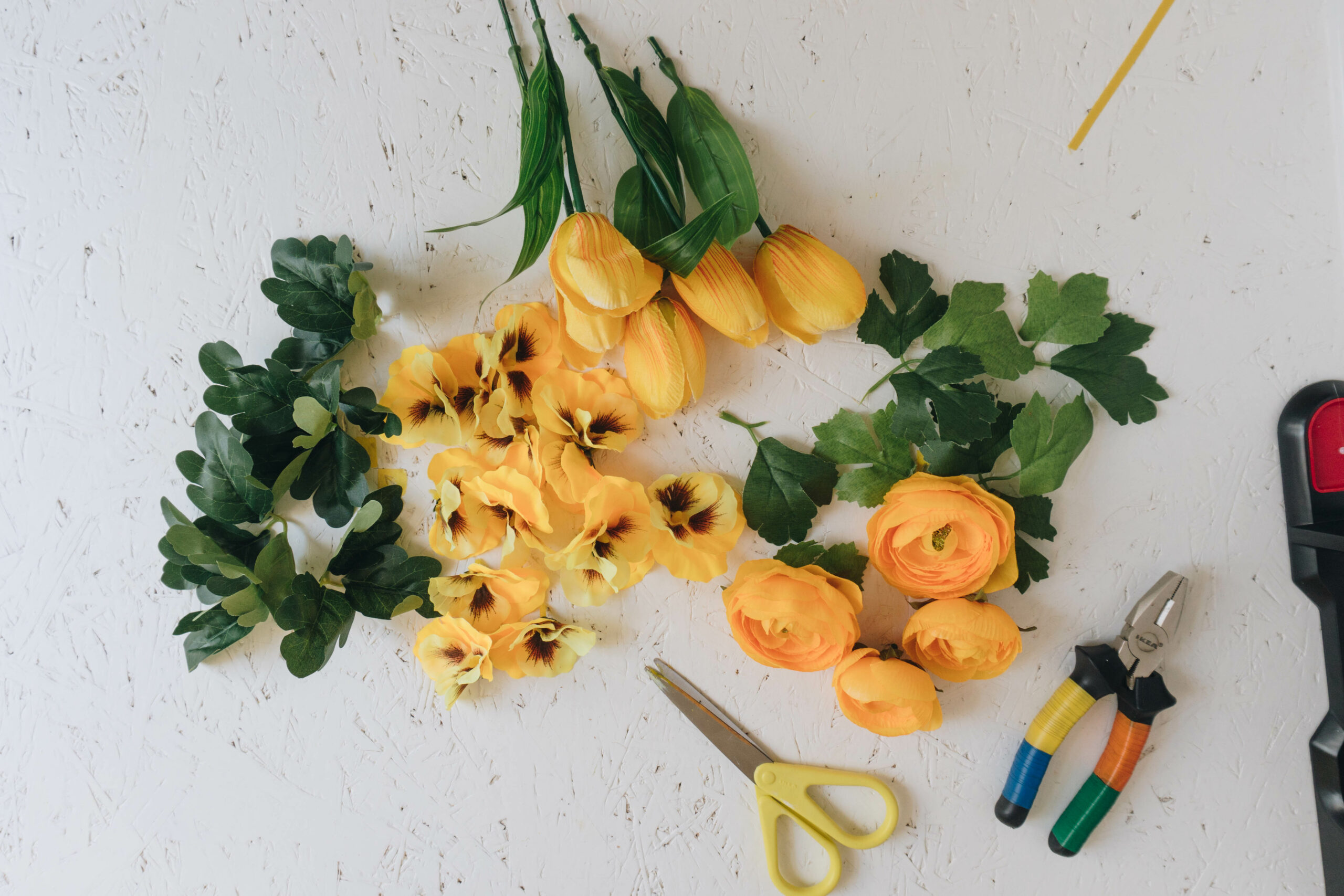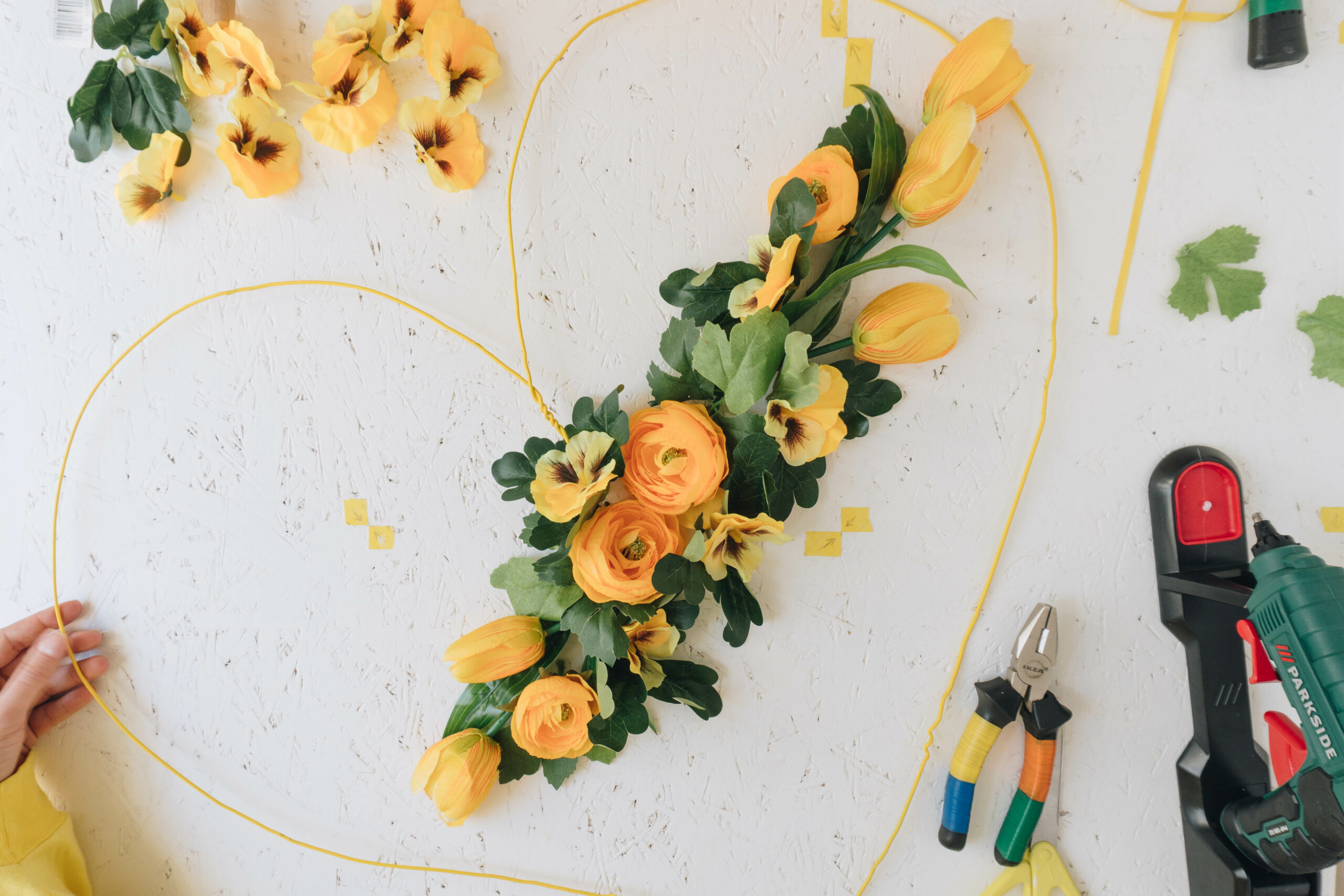 Lackiere dein Drahtherz mit Sprühlack im Freien auf einer Unterlage und lass es gut trocknen. Trenne die Blütenköpfe von den Stängeln und lege die Blumen so auf dem Tisch, wie sie später auf dein Herz geklebt werden sollen.