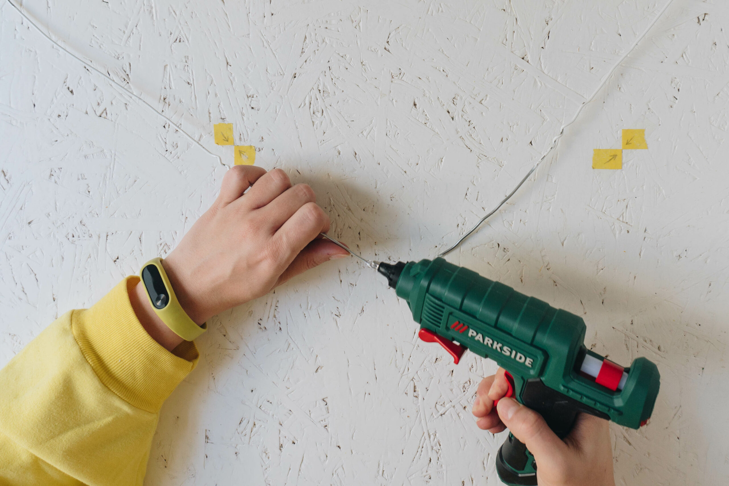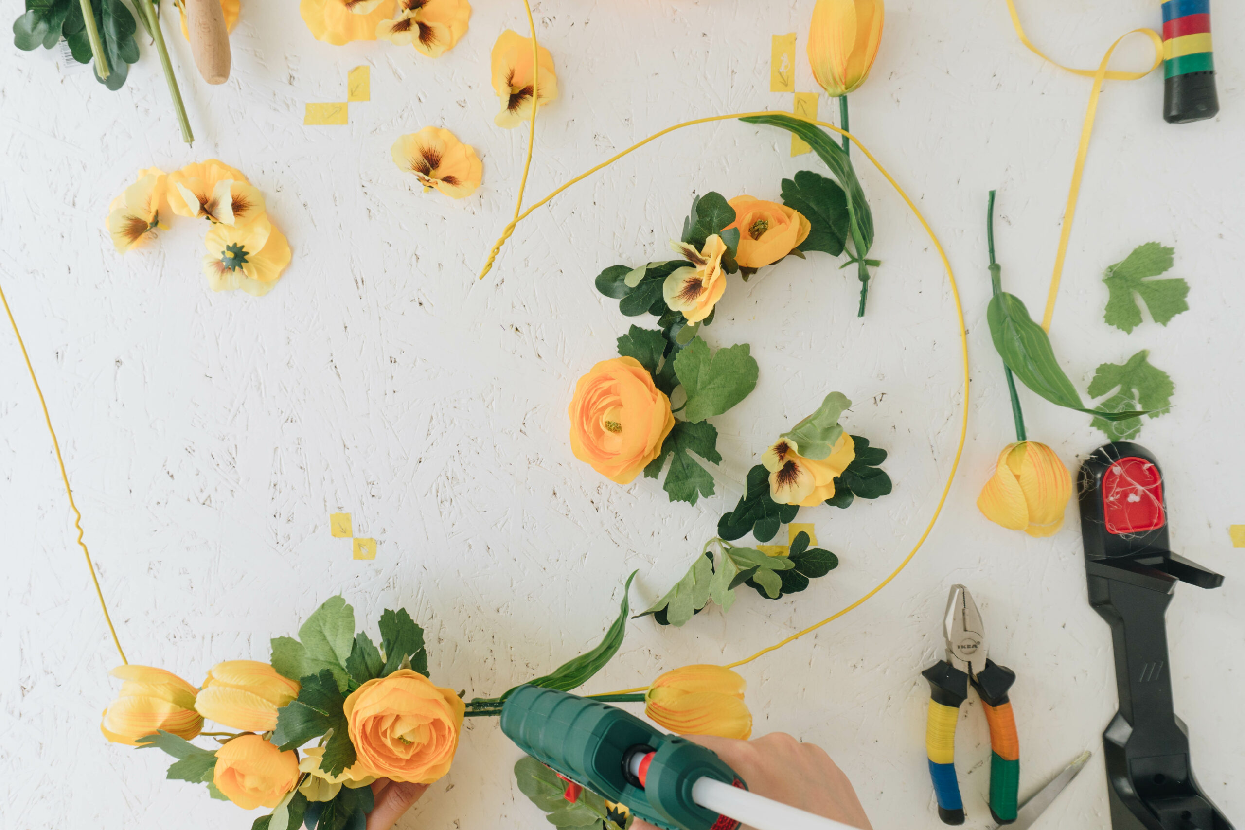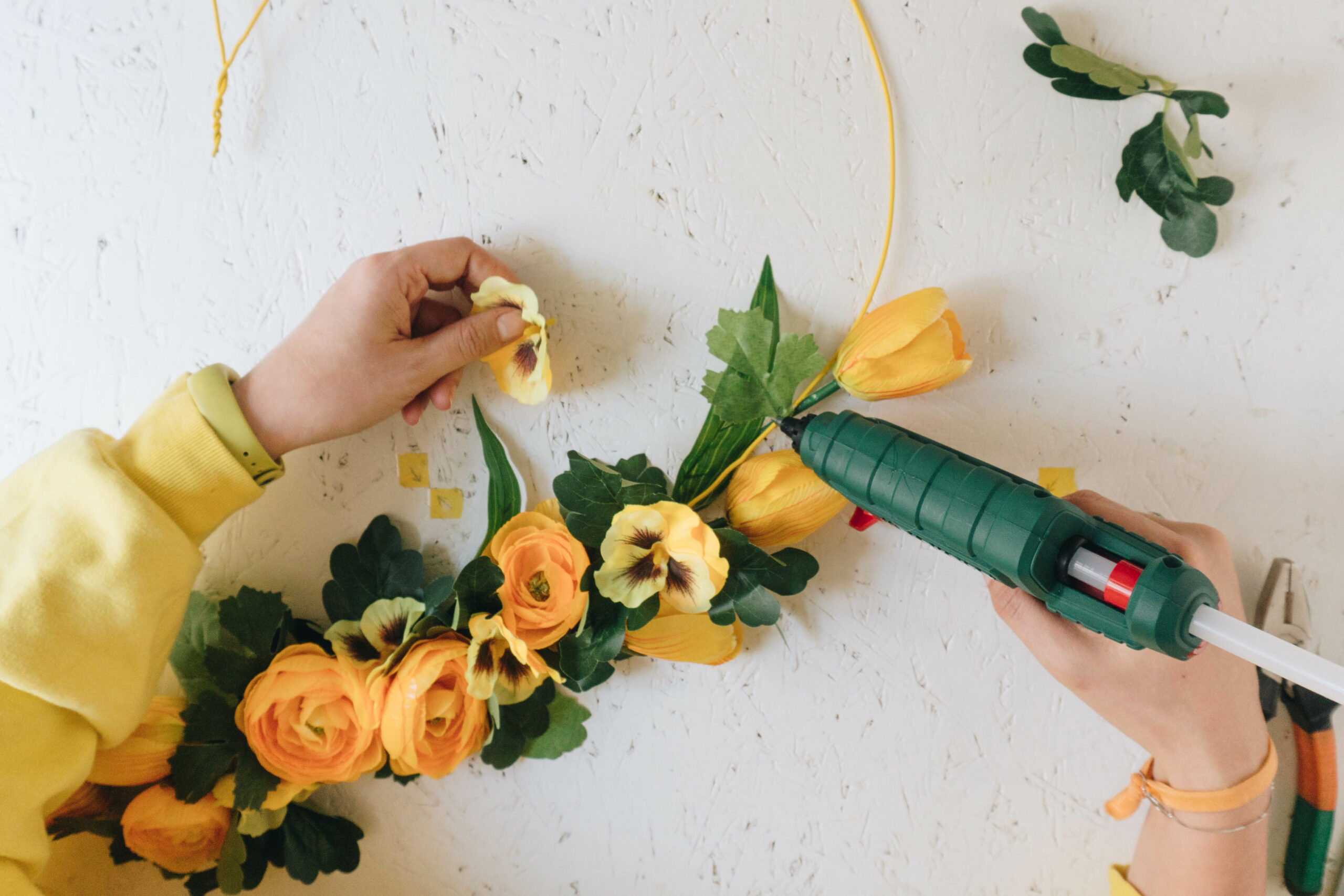 Klebe Vorsichtig die einzelnen Blüten mit Heißkleber fest.