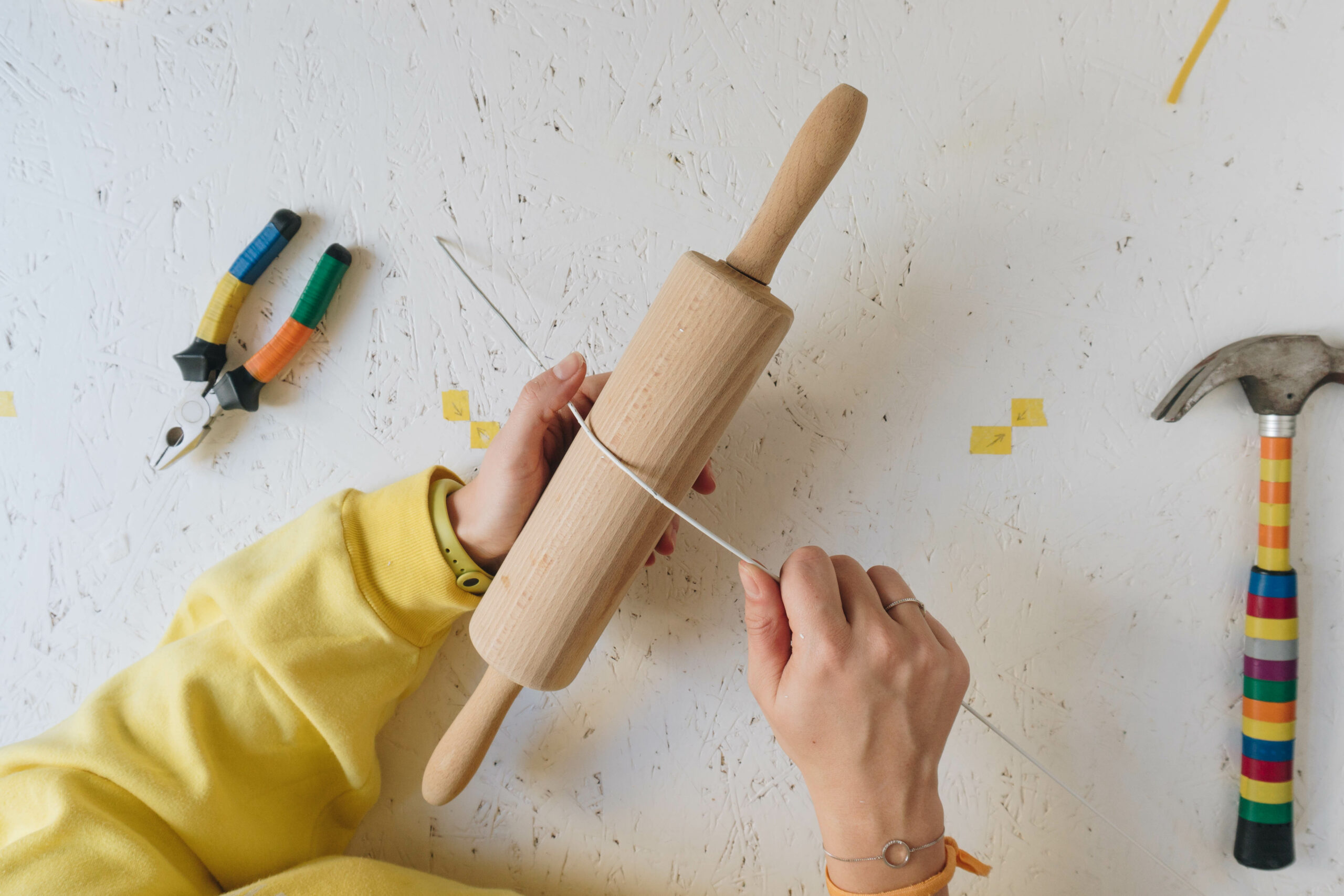 Als nächstes biegst du die Drähte zu je einer Herzhälfte. Achte dabei darauf, dass das lange Ende des Kleiderbügels (das Ende mit Haken) unten am Spitz deines Herzens und das kurze Ende (das um den Hals des Hackens gewickelt war) dort ist wo die Rundungen zusammenkommen. Nimm dein Nudelholz zur Hilfe um den Herzbogen zu biegen.
