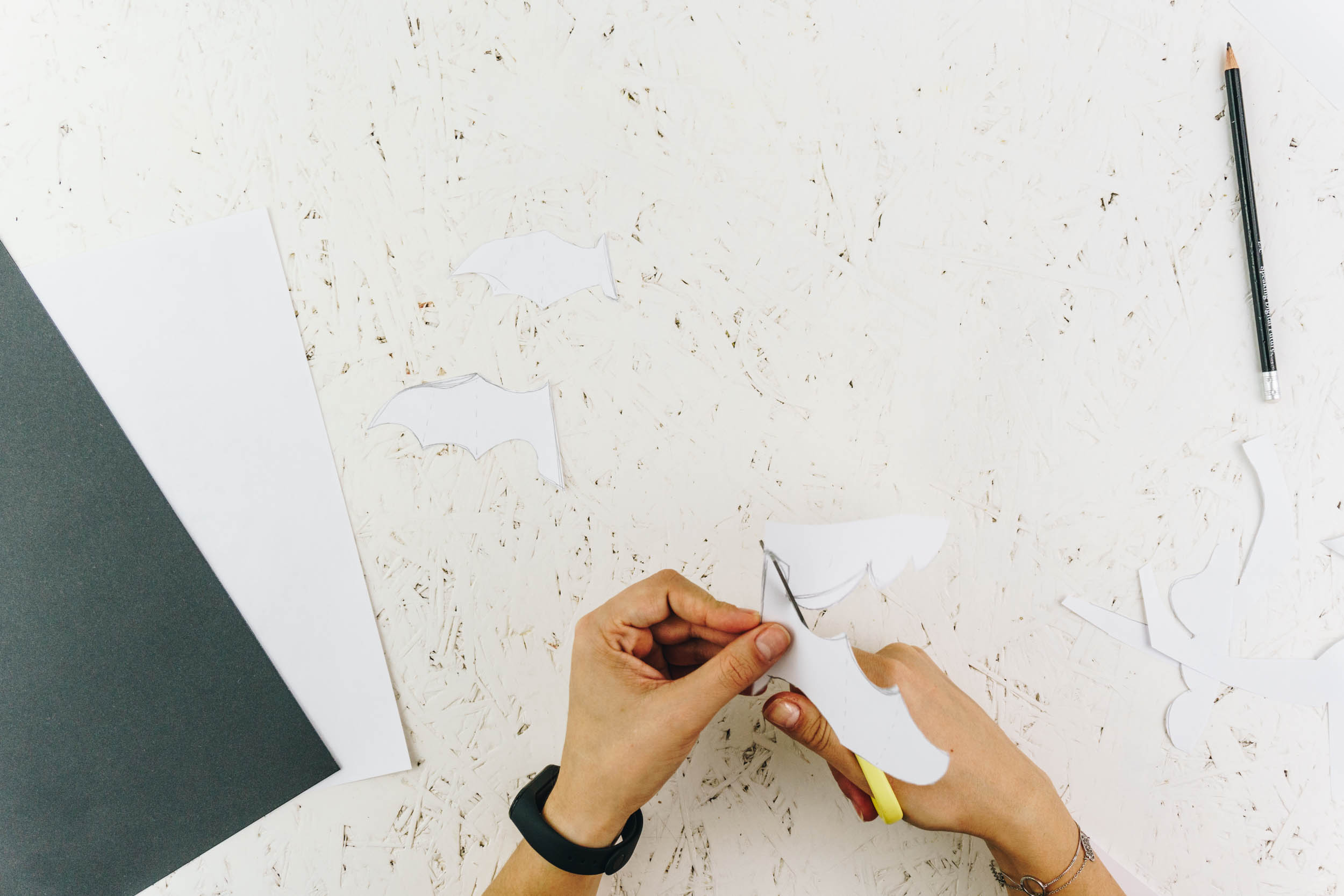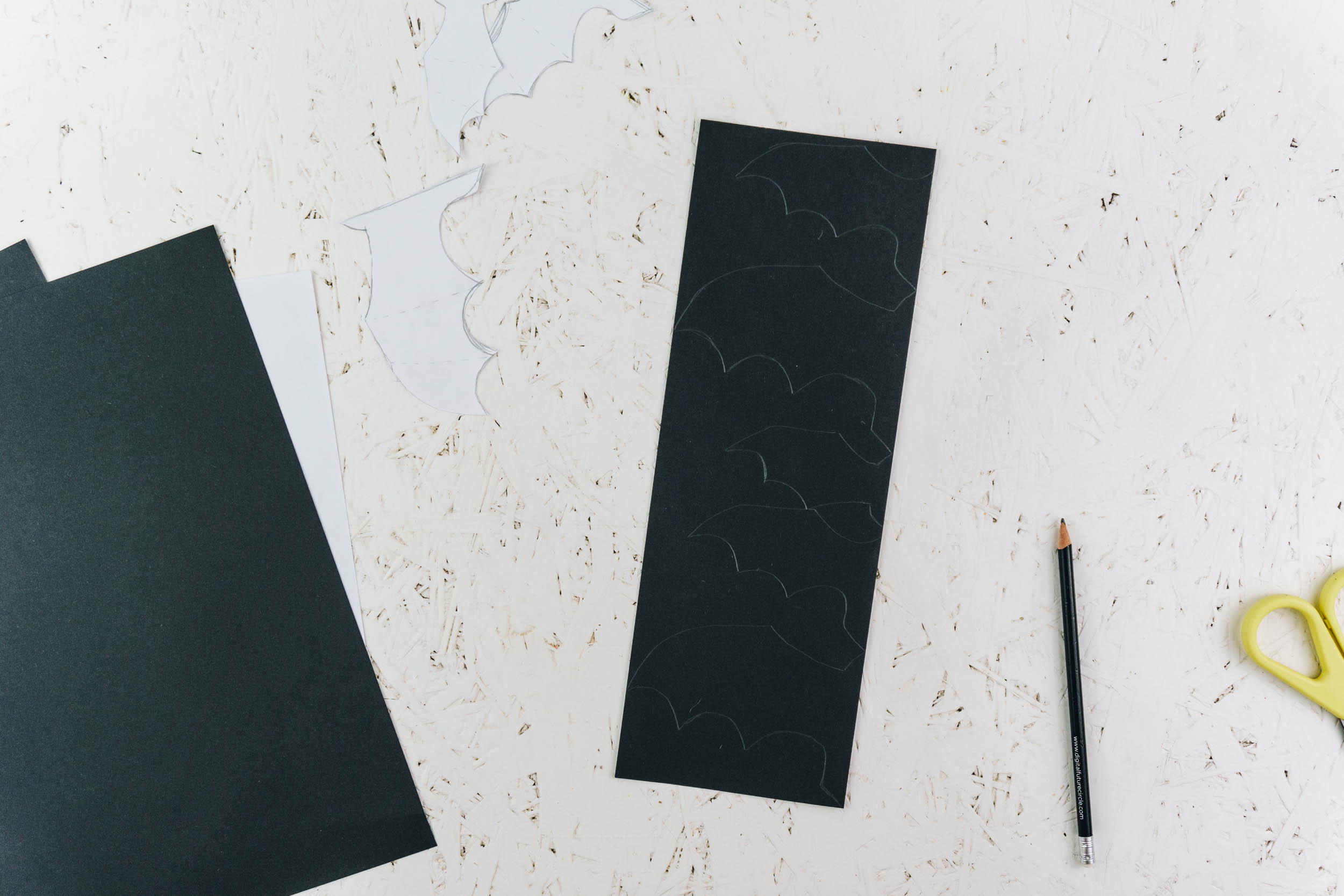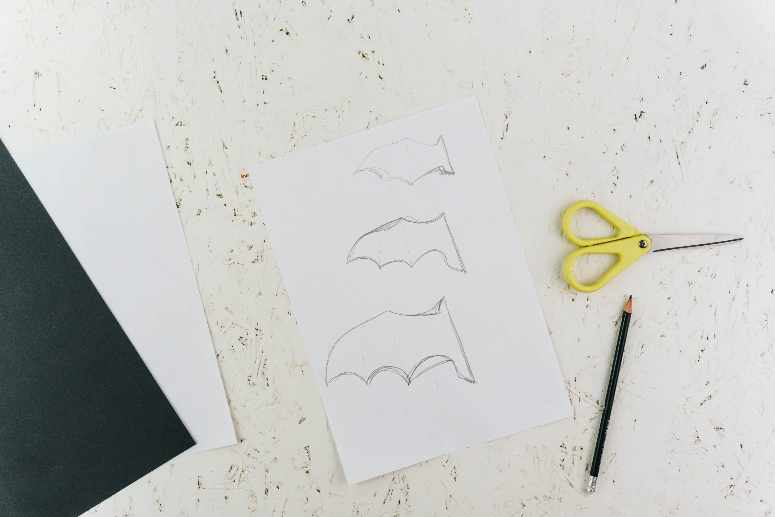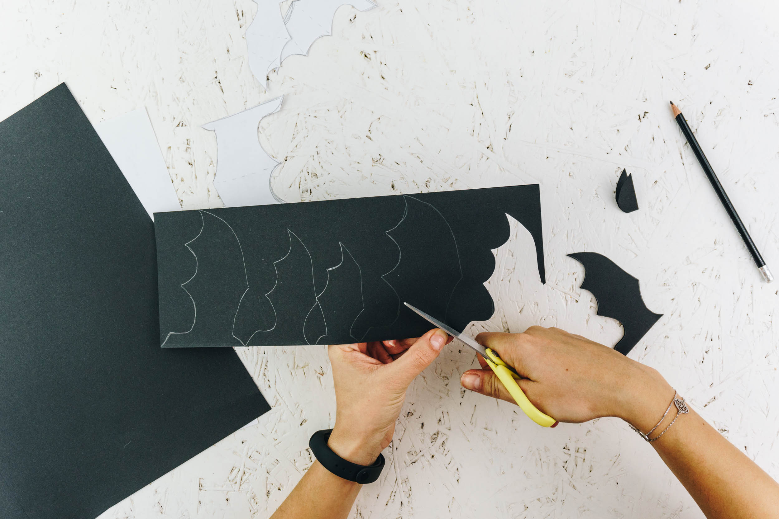 Drucke die Vorlage aus oder zeichne selbst eine und schneide die Fledermäuse aus.