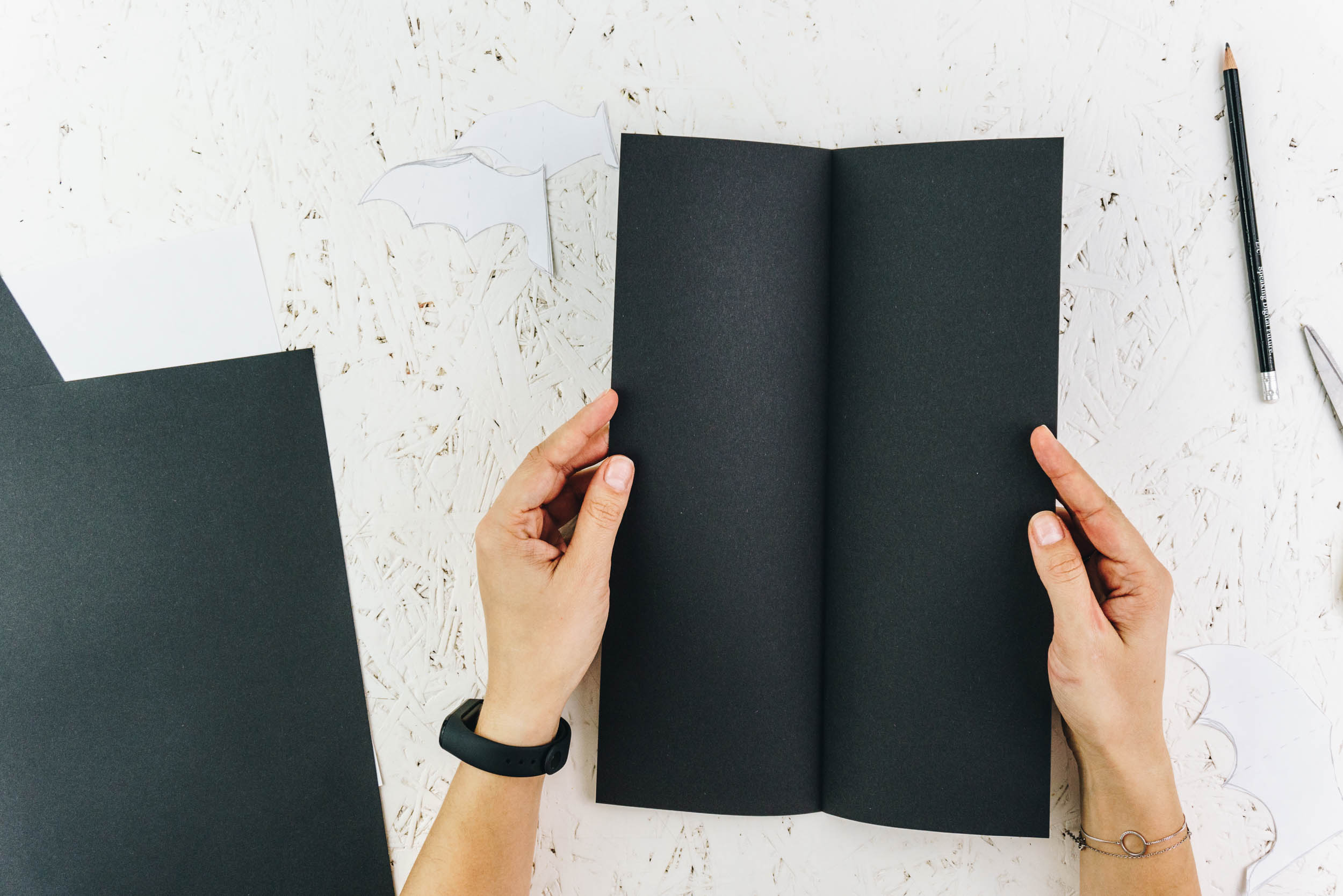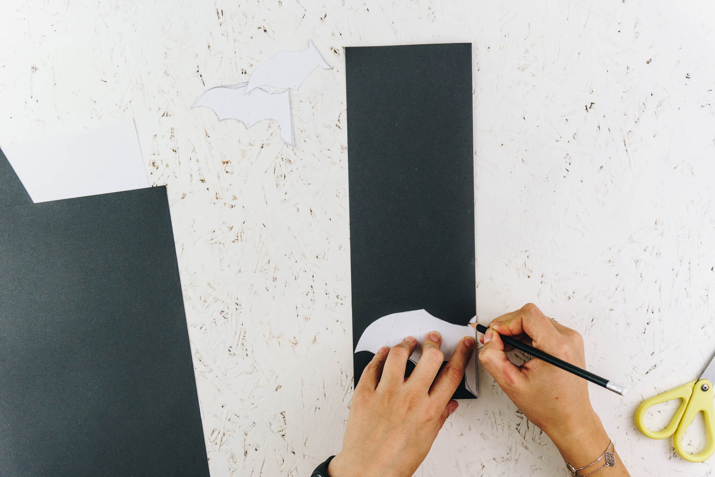 Lege nun deine Vorlage auf dein schwarzes Papier und zeichne die Fledermaus ab. Schneide sie aus und falte sie auf.