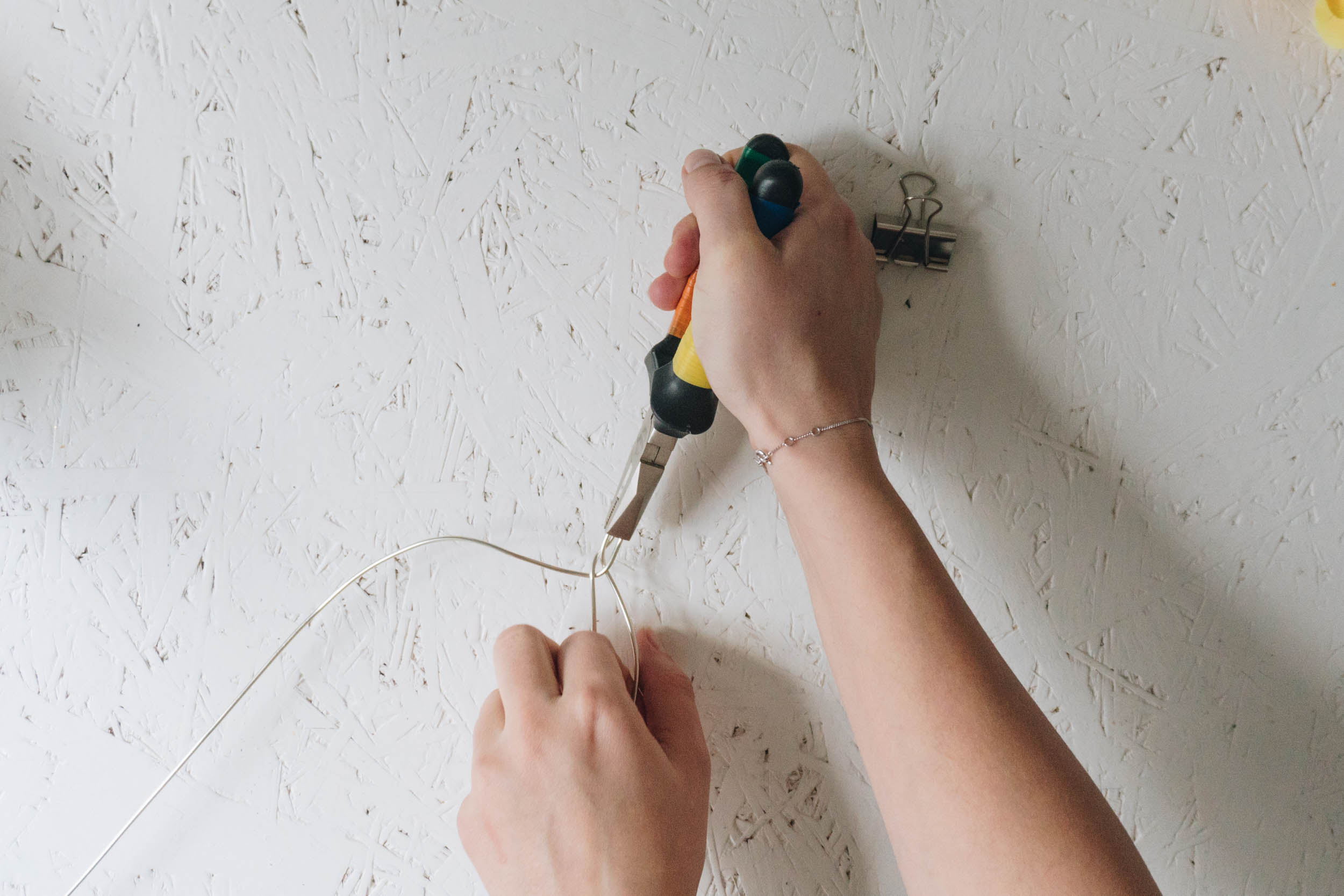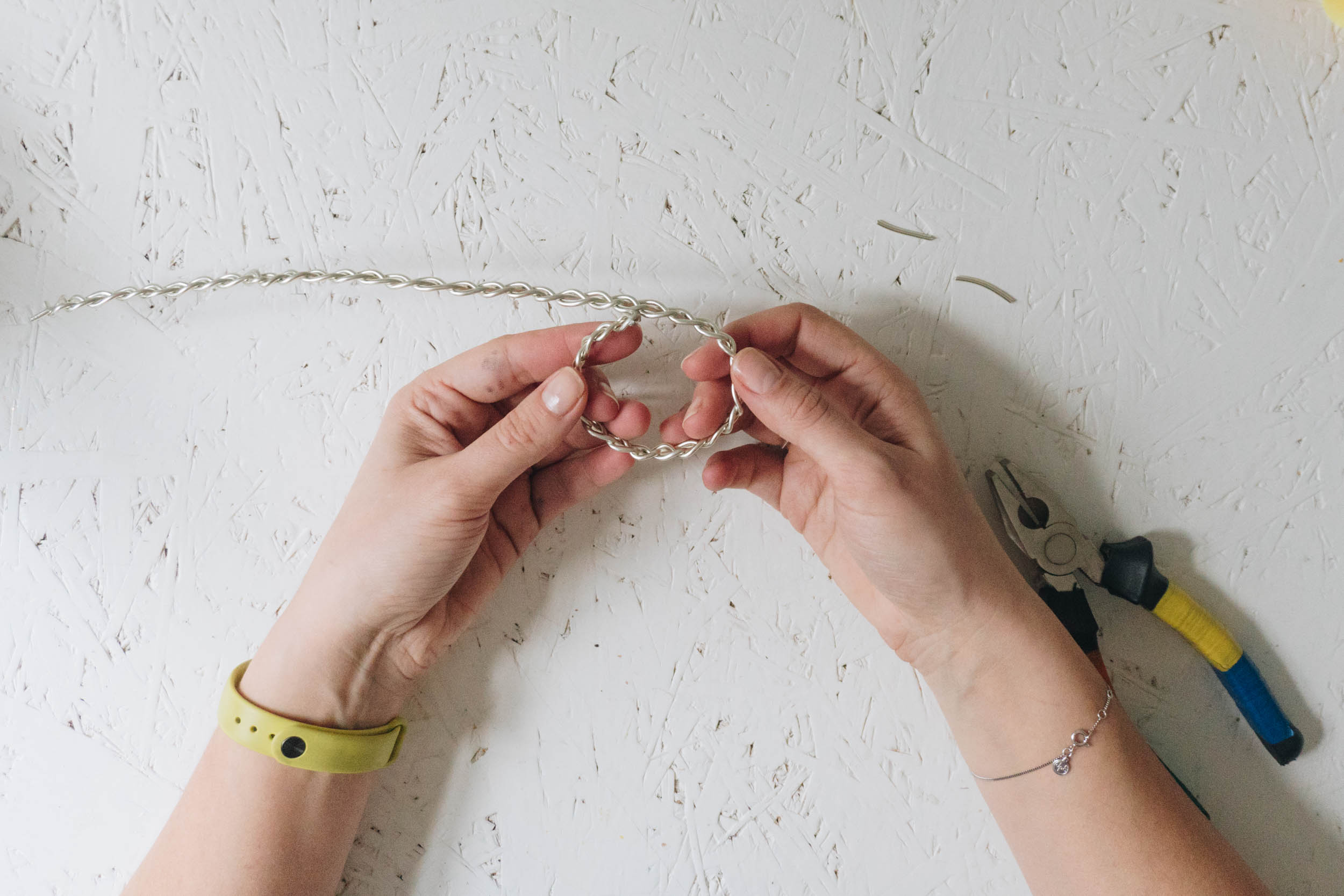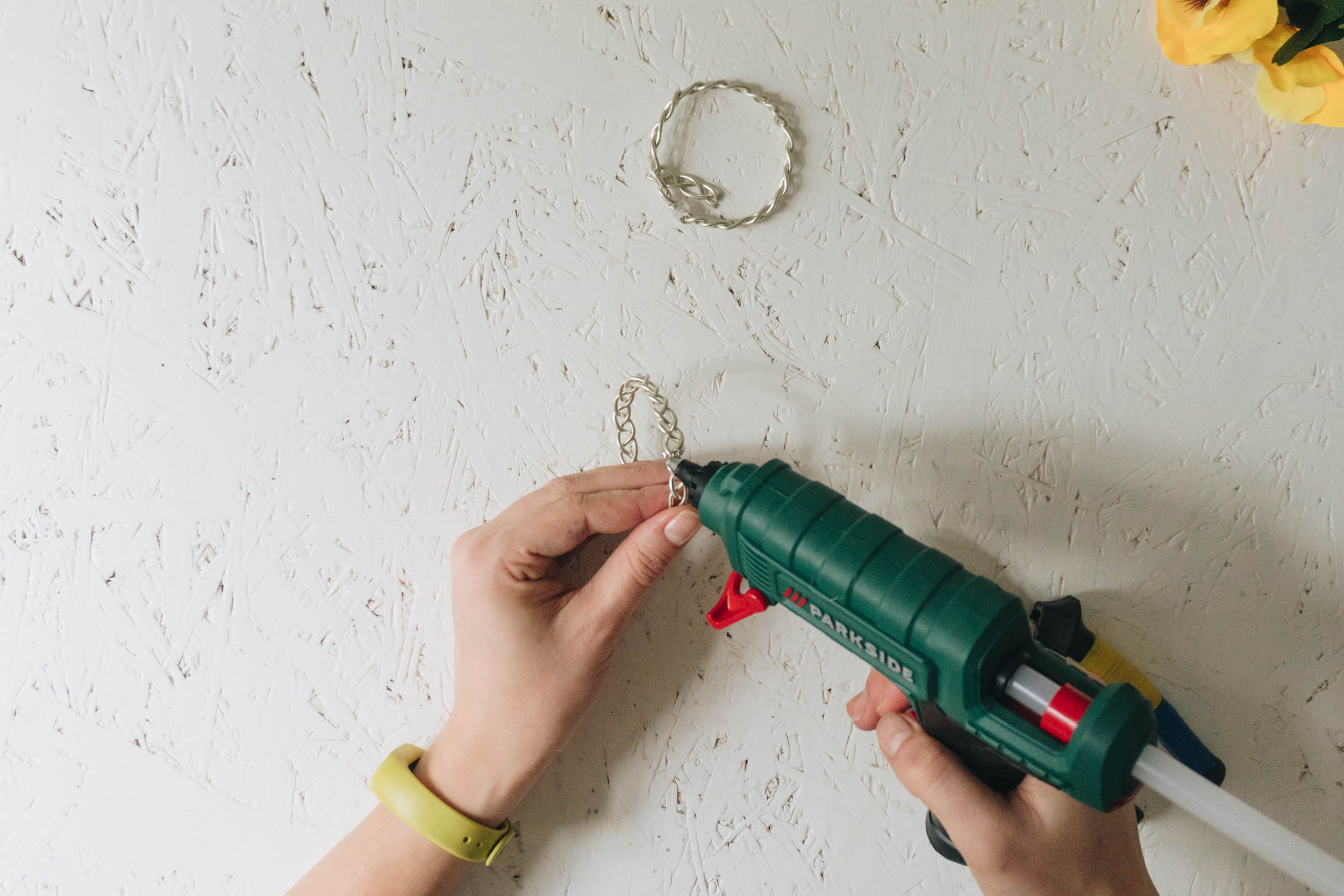 Scheide das Ende ab. Forme einen zweiten Ring und scheide auch diesem den überschüssigen Drahtzopf ab. Verklebe die Zopfenden mit einer Heißkleberpistole.