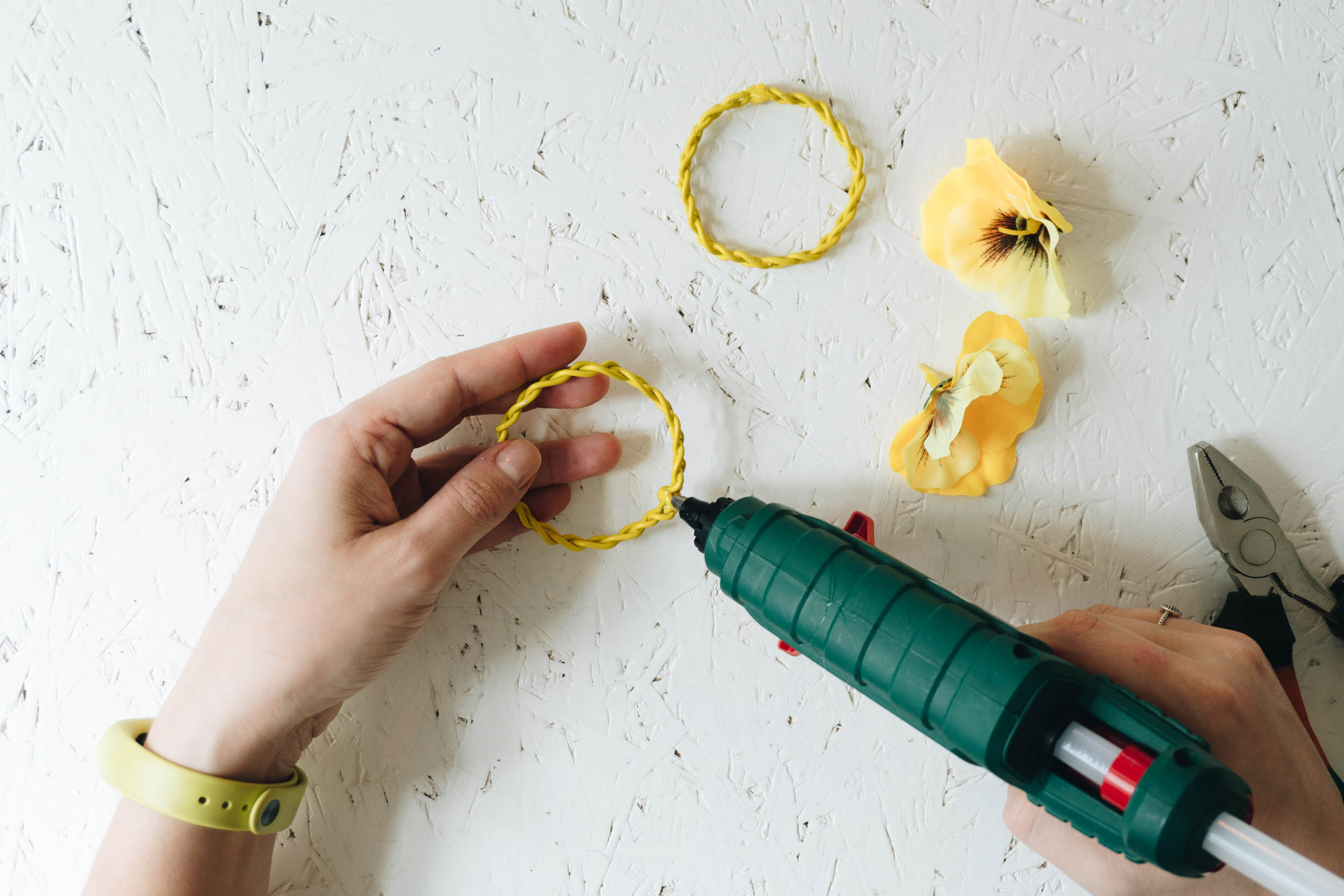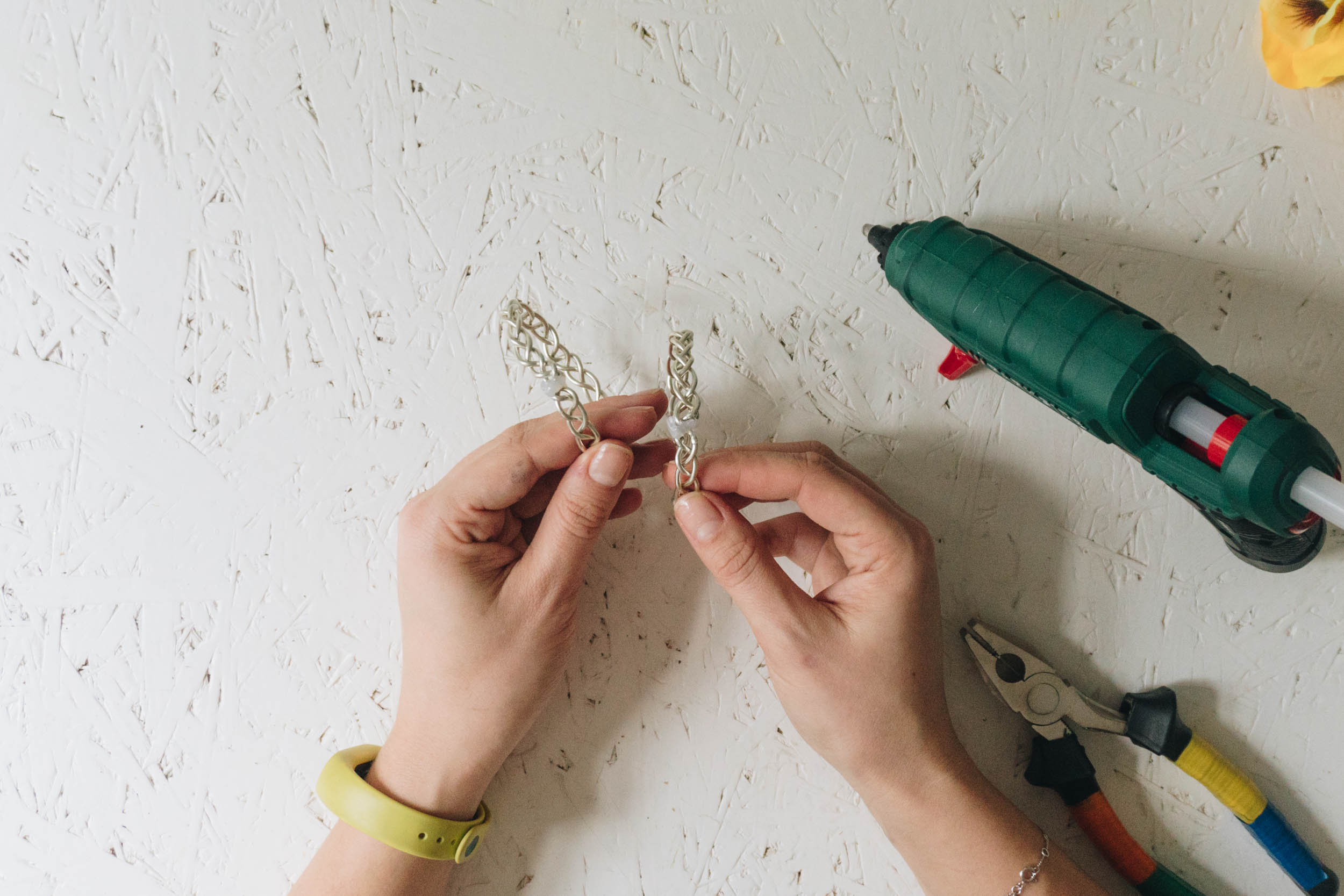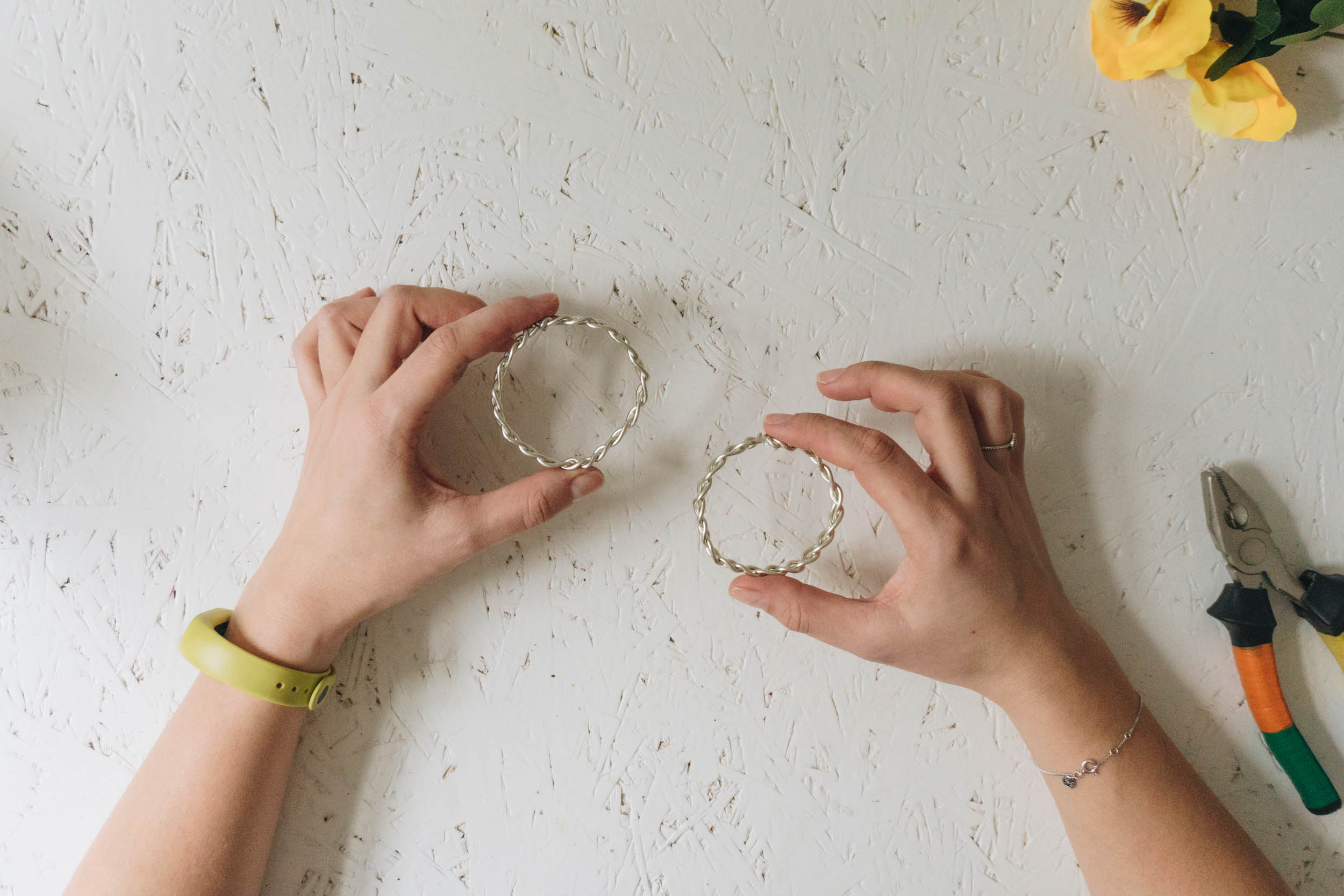 Scheide das Ende ab. Forme einen zweiten Ring und scheide auch diesem den überschüssigen Drahtzopf ab. Verklebe die Zopfenden mit einer Heißkleberpistole.
