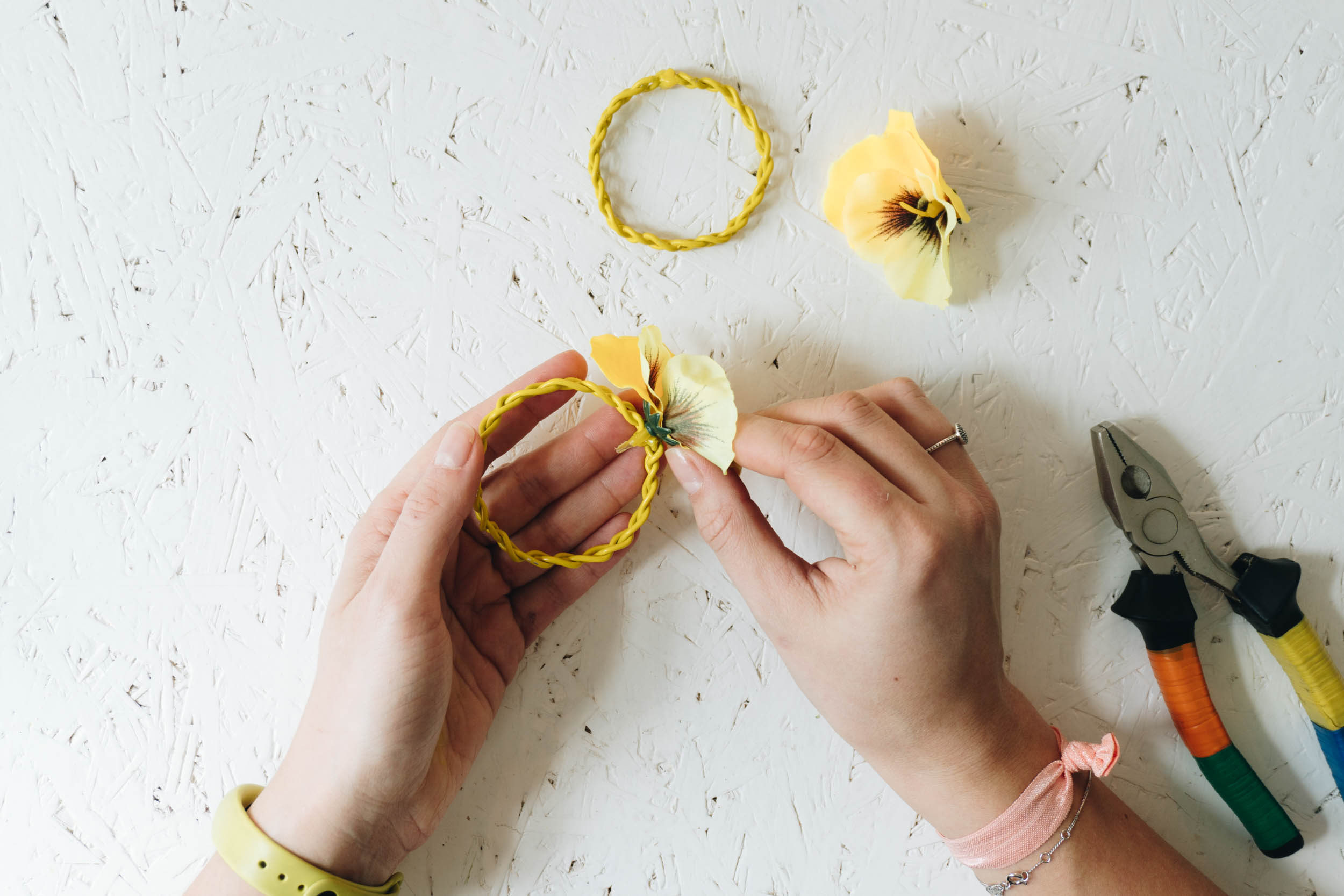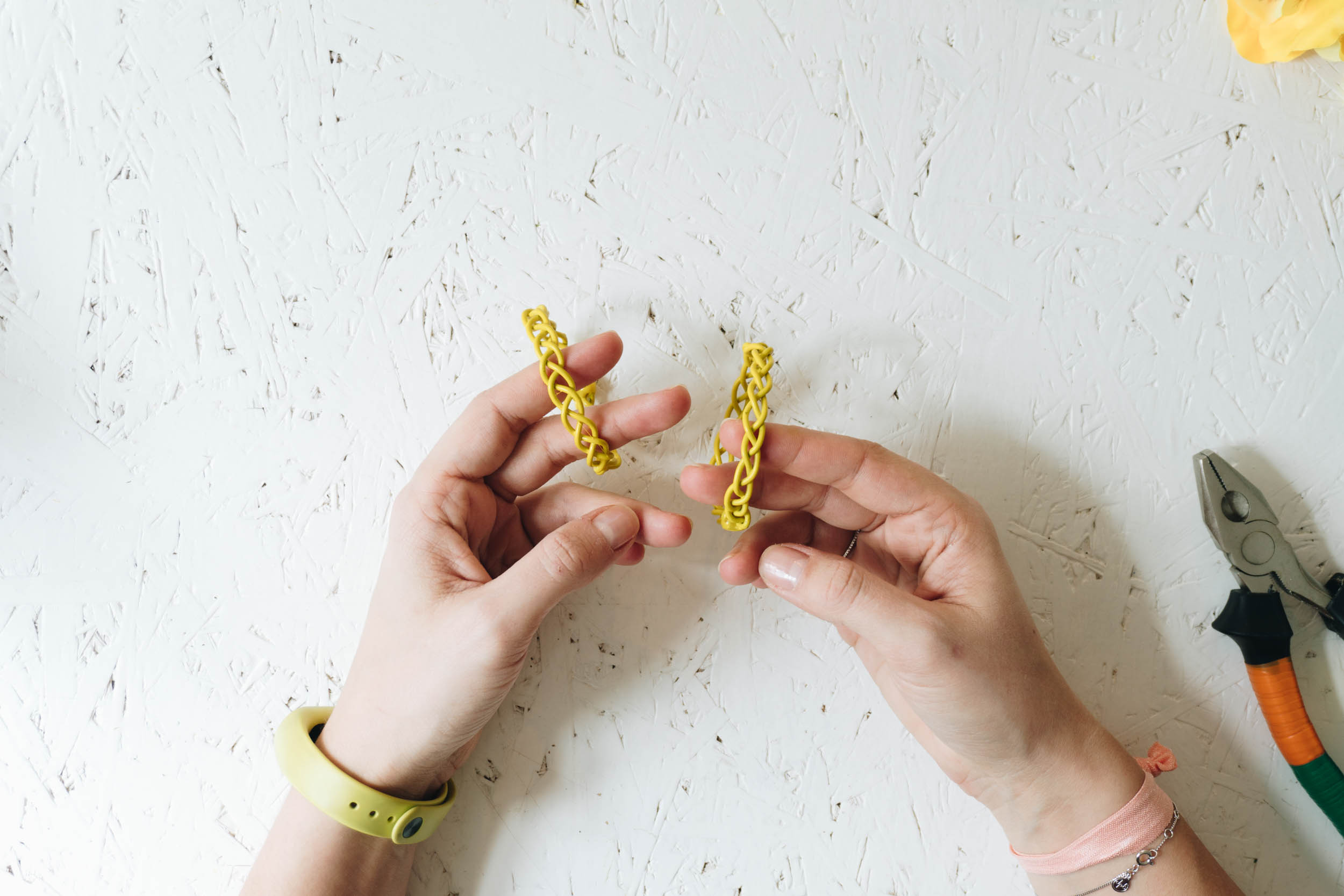 Lackiere deine zwei Zopfringe in der gewünschten Farbe. In meinem Fall in Gelb und lass den Lack gut trocknen.