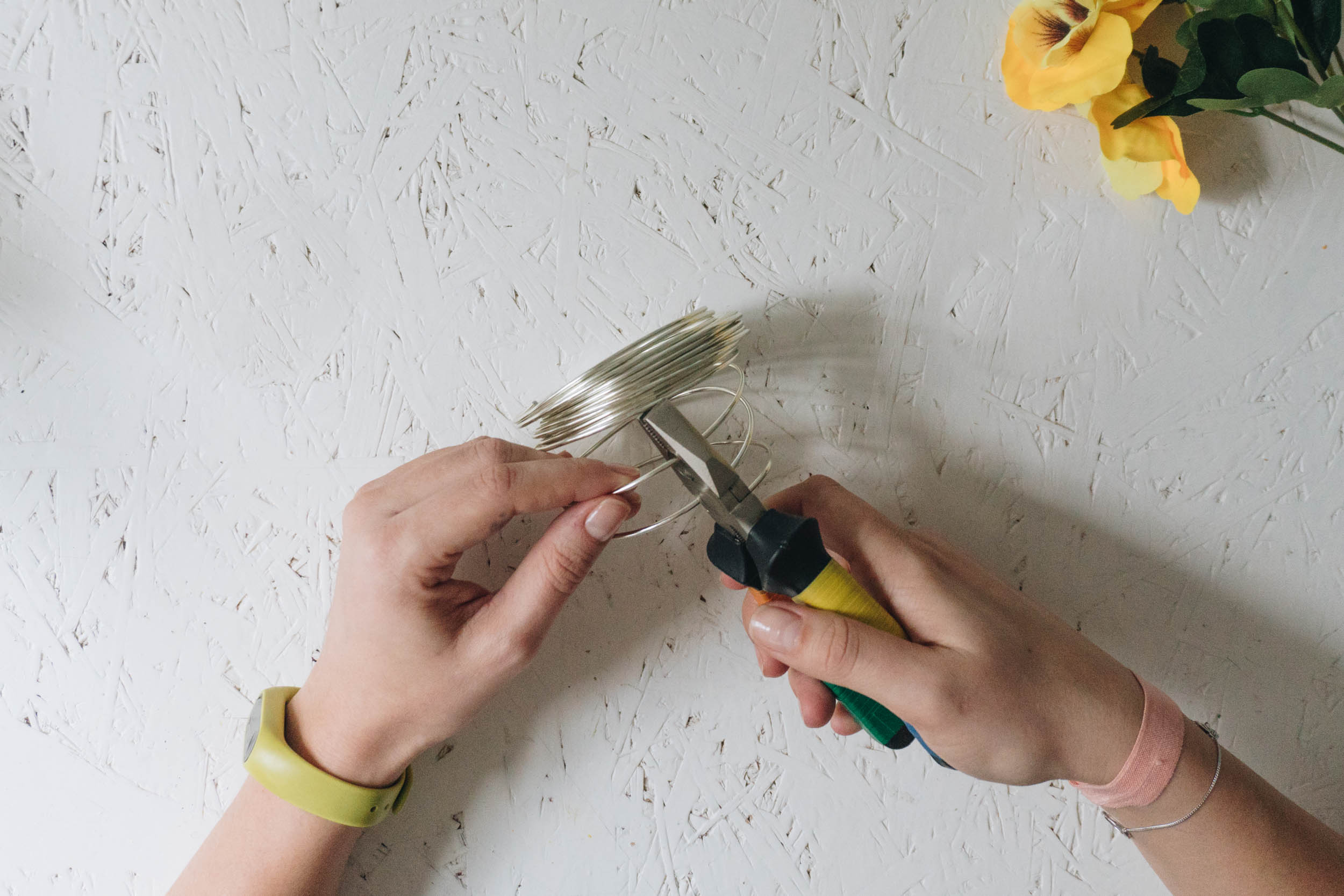 Sobald du einen langen Zopf aus Draht hast schneidest du an den Enden den überstehenden Draht ab. Nun drehst du den Zopf zu einem ca. 4cm großen Ring.