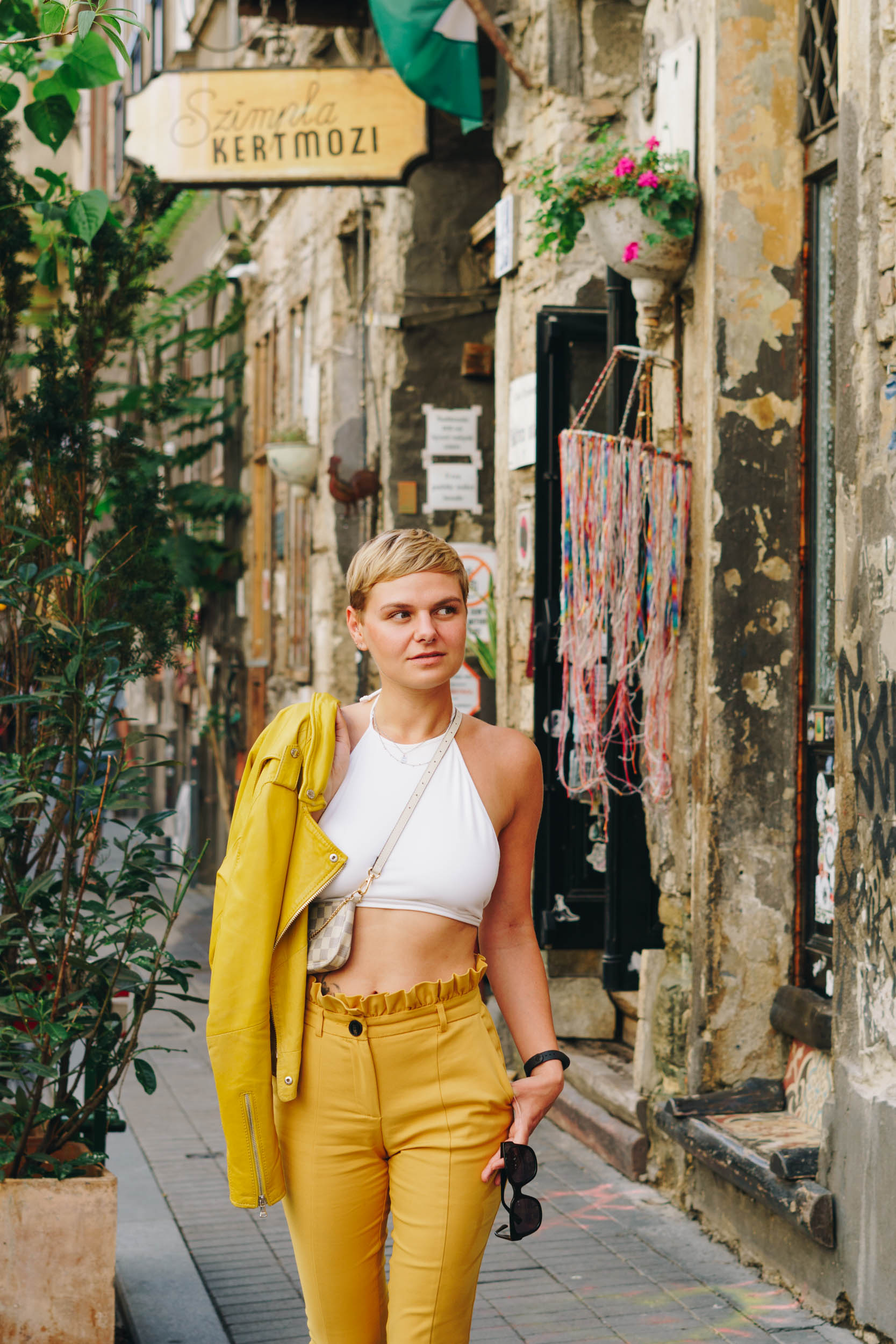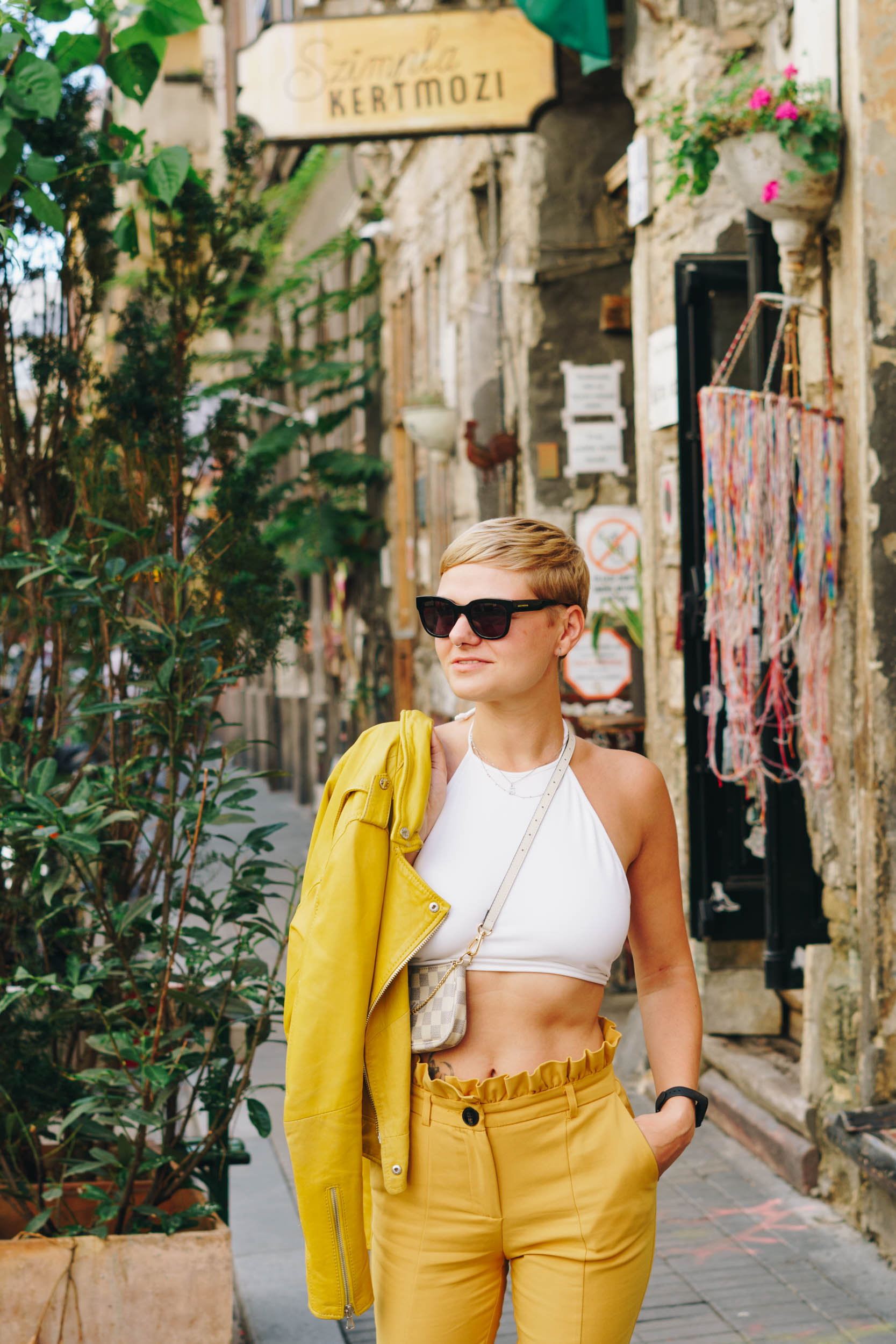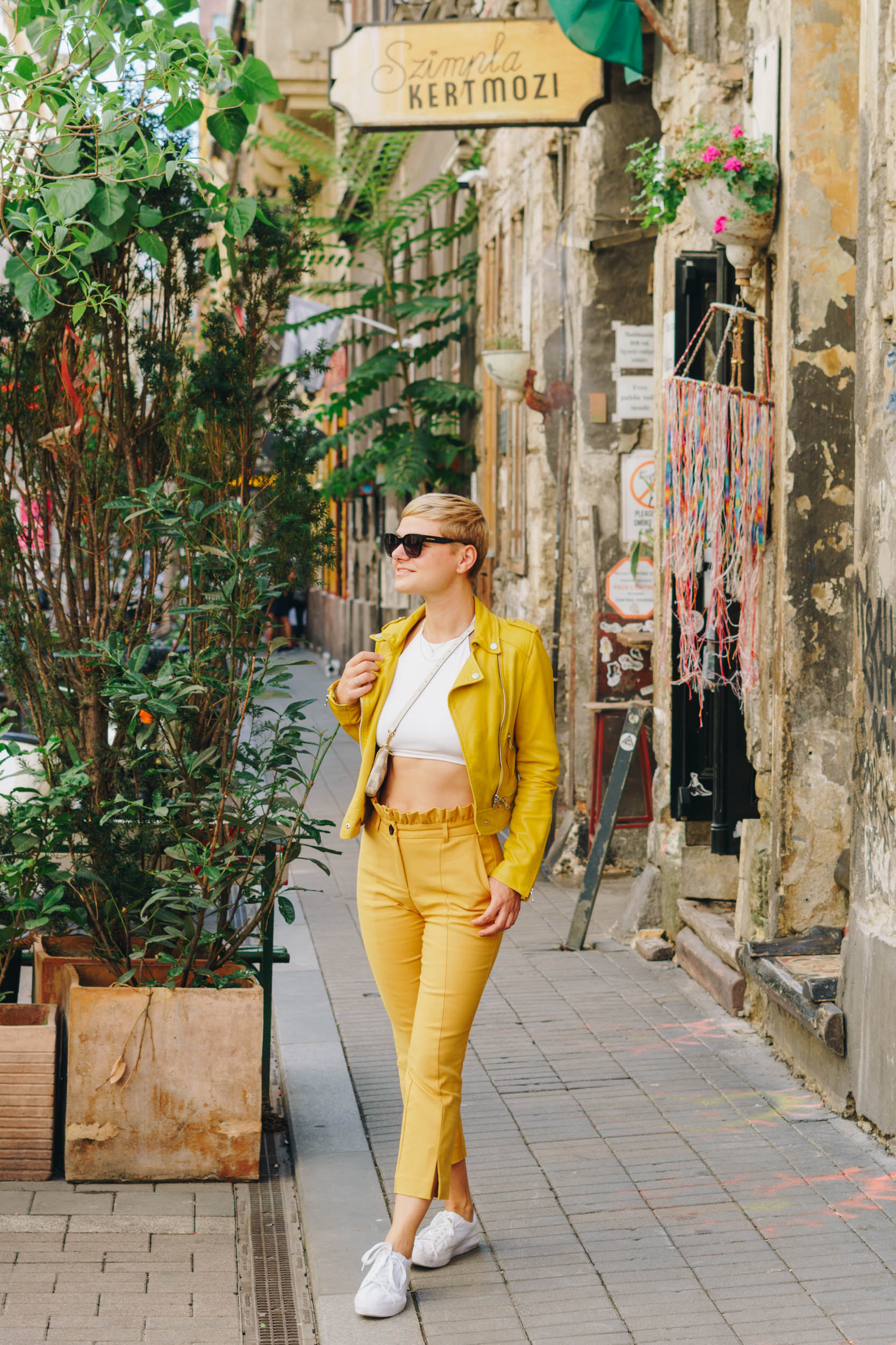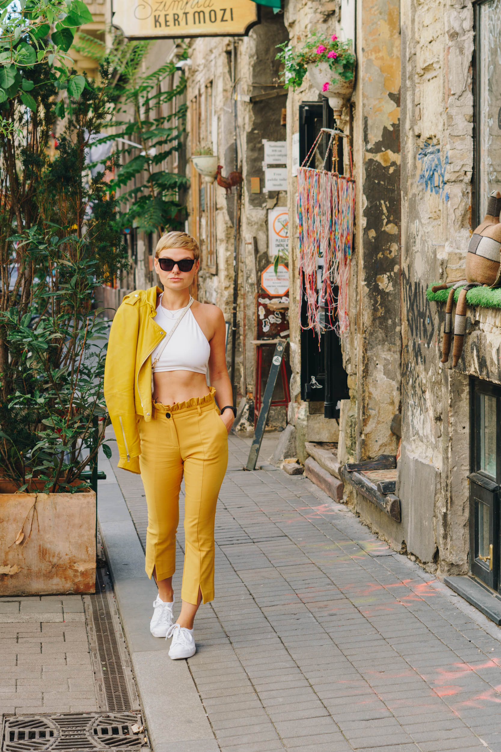 Auf den Bildern trage ich eine Paperbag von Mango, Croptop von Asos, Lederjacke von Oakwood, Sneakers von Sneakers von Asos und Sonnenbrille von Messyweekend.