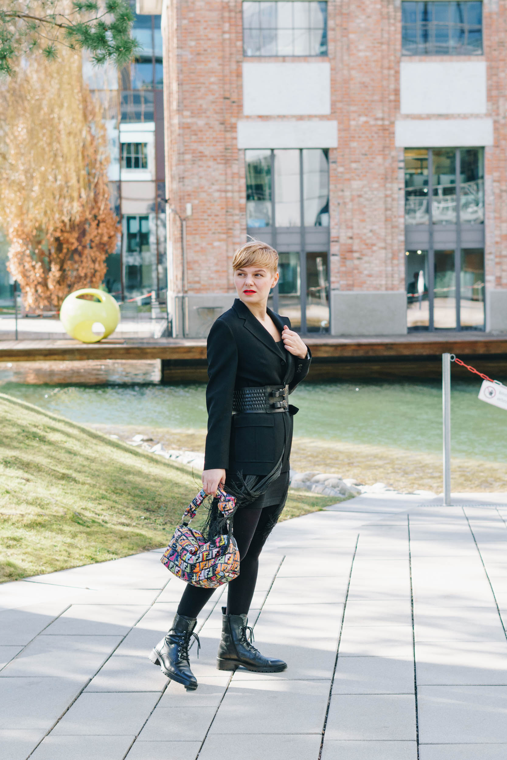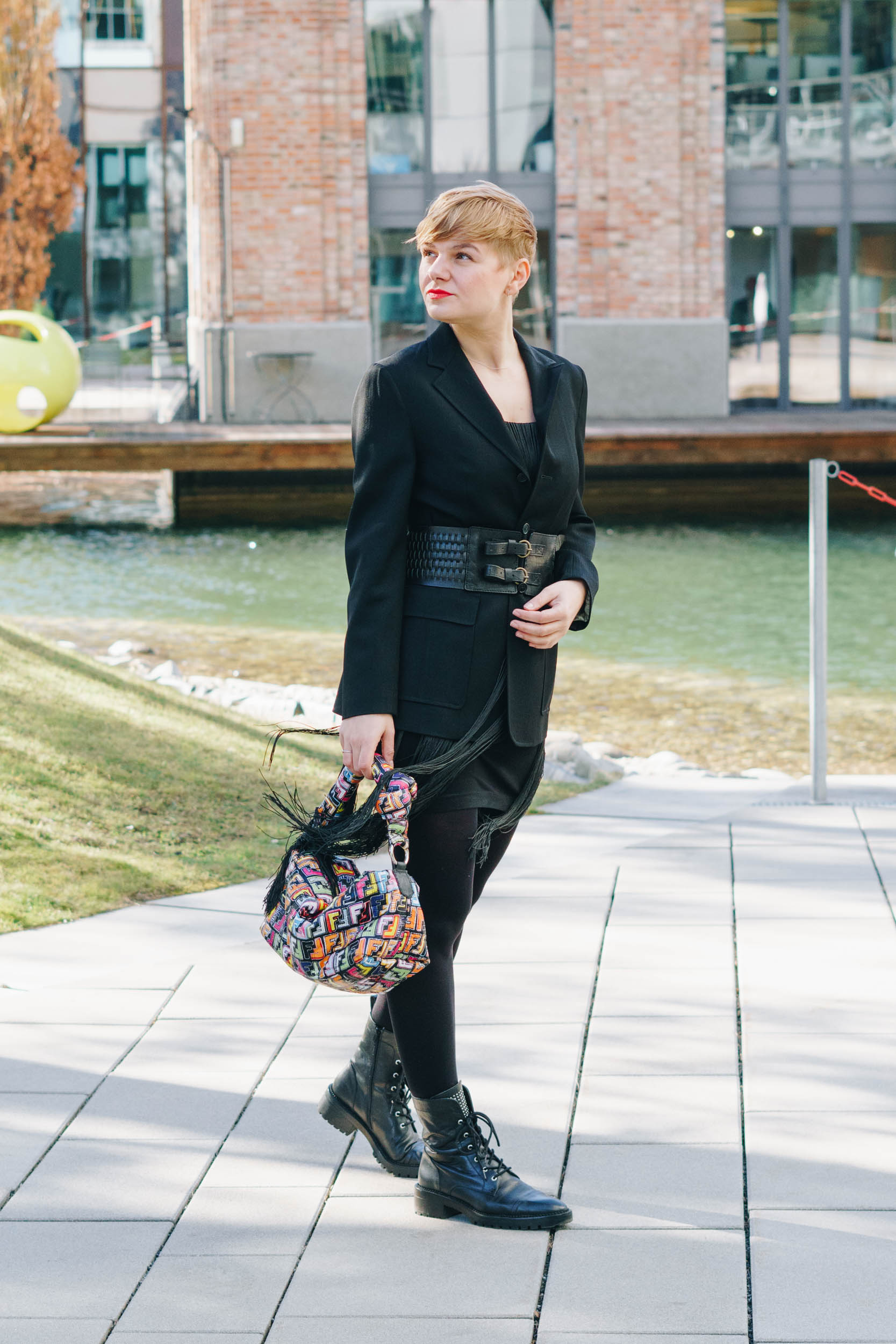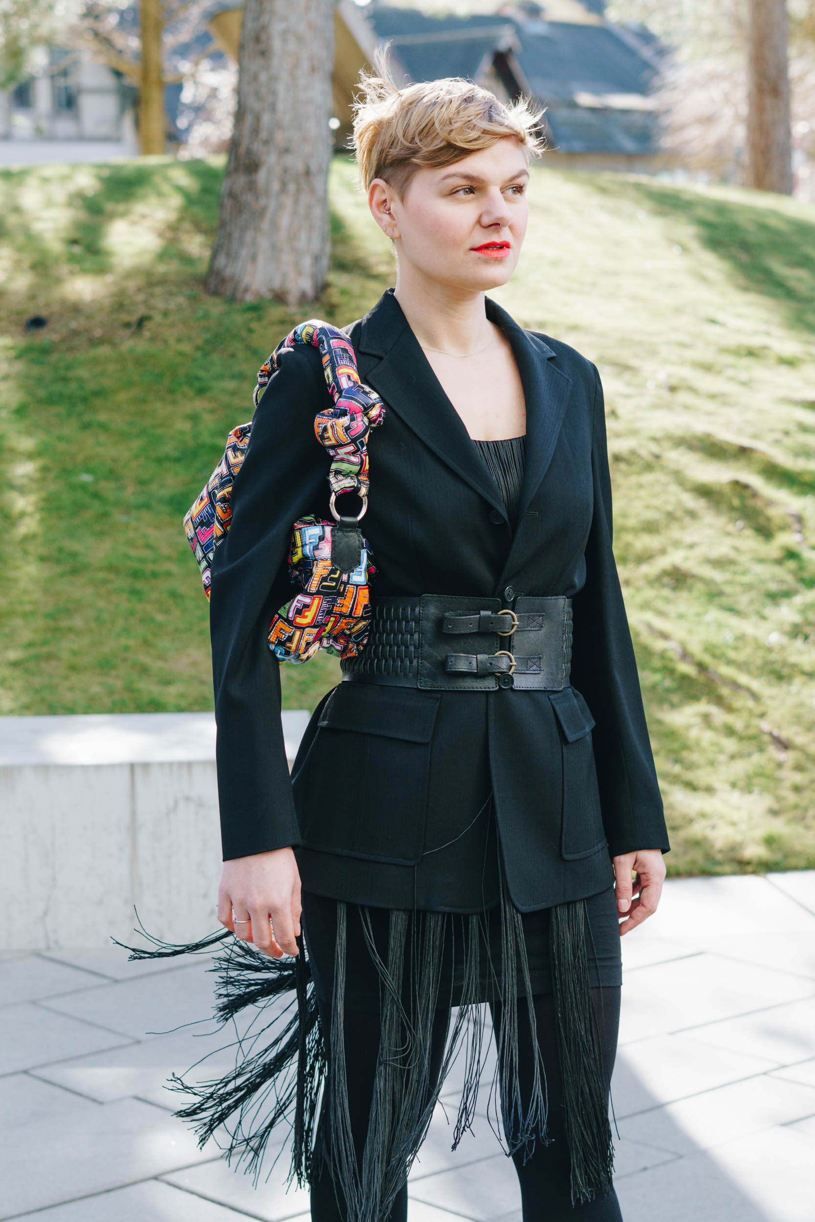 Auf den Bildern trage ich ein DIY Fransenkleid, Max Mara Blazer, Blickdichte Strumpfhose, Stiefel von Zara, Vintage Gürtel und DIY Handtasche.