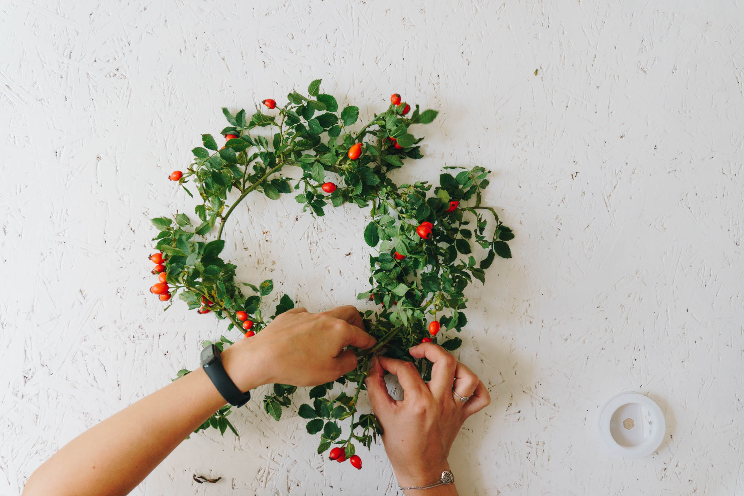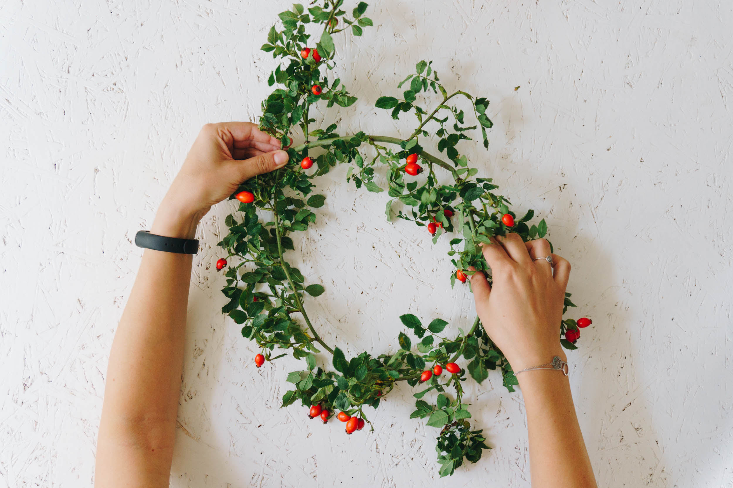 Binde deine langen Zweige zu einem ca. 20cm großen Ring. Befestige die Enden mit dem Nylonfaden und Schmuckdraht.