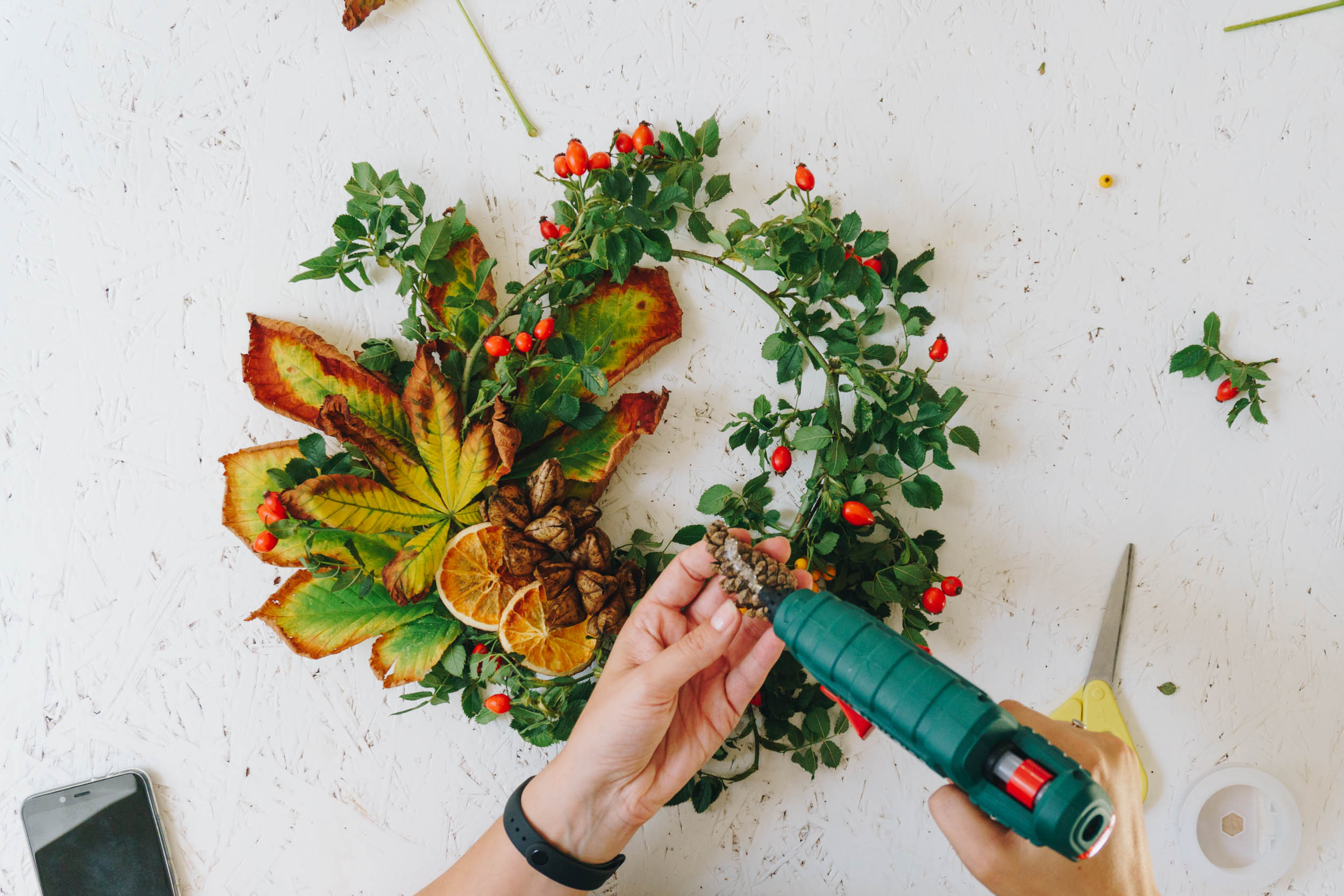 Klebe Blätter, Orangenscheiben und verschiedene Beeren, sowie Tannenzapfen an den Ring aus Zweigen. Befestige einen Metallring oder ein Satinband um den Kranz aufzuhängen. Fertig.