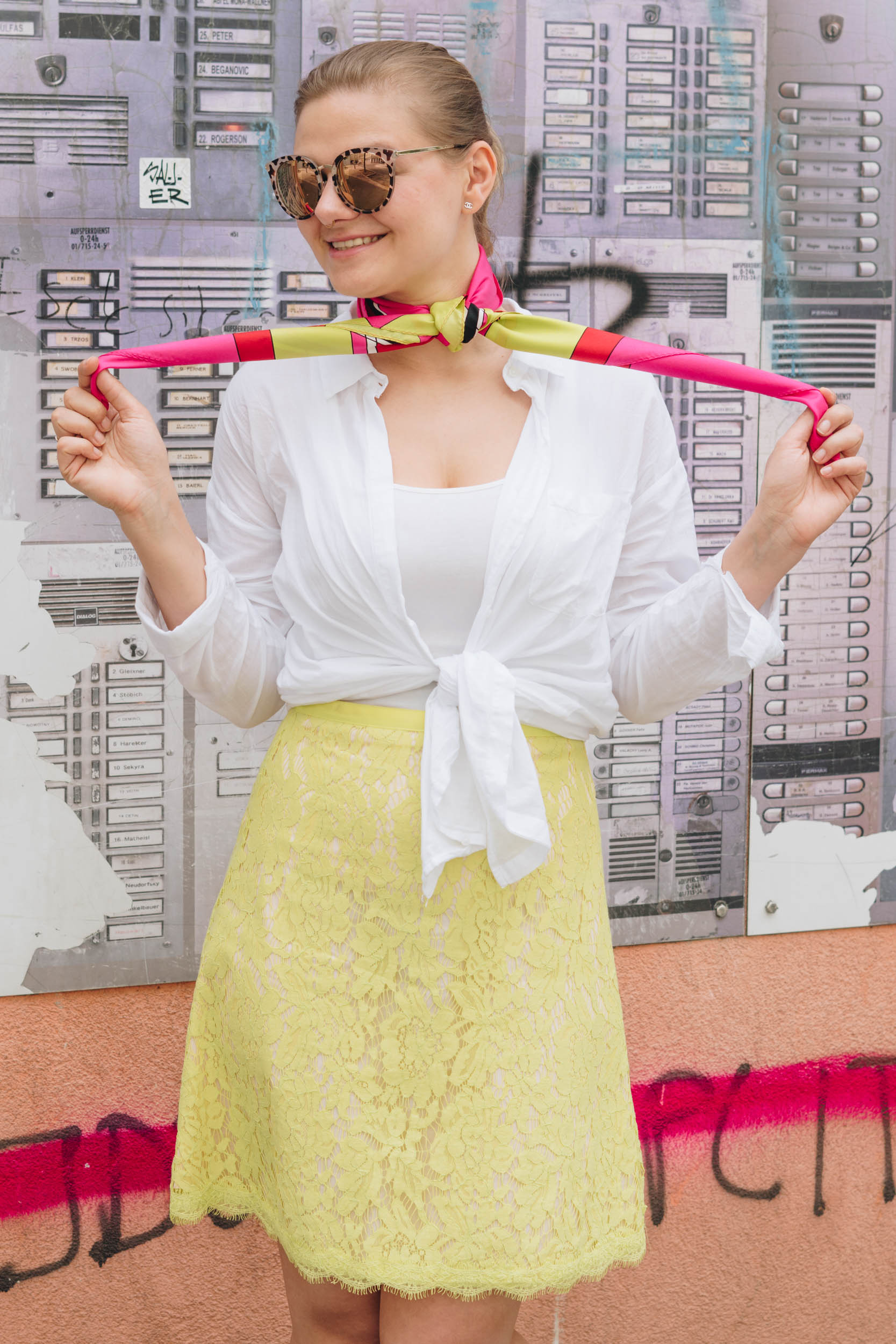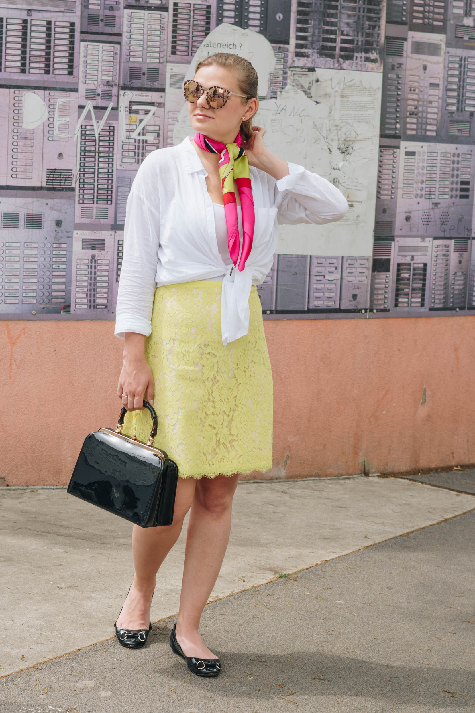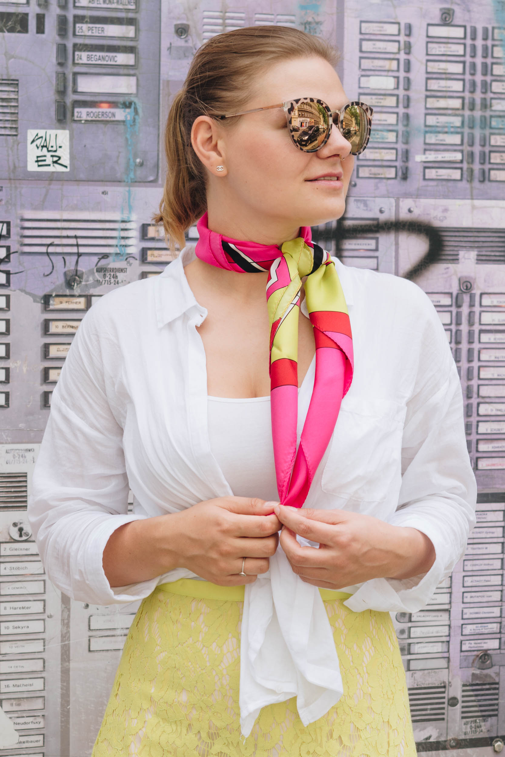 Um den Hals ist es mir am liebten. G erinnert es eher an Flugbegleiterinnen. So ein besonders schönes Tuch wie dieses passt aber eher zu einem schönen Abendessen als zur Arbeit. Für diesen Look falte ich das Tuch zu einem Dreieck und vom breiten Ende weg zu einem schmalen Schlauch.