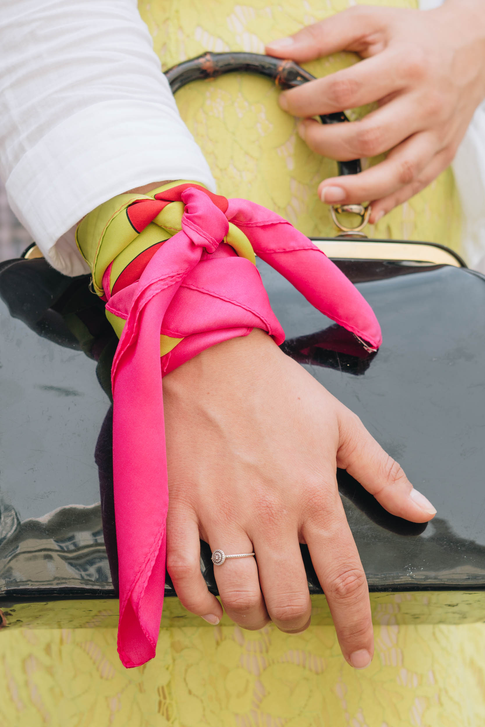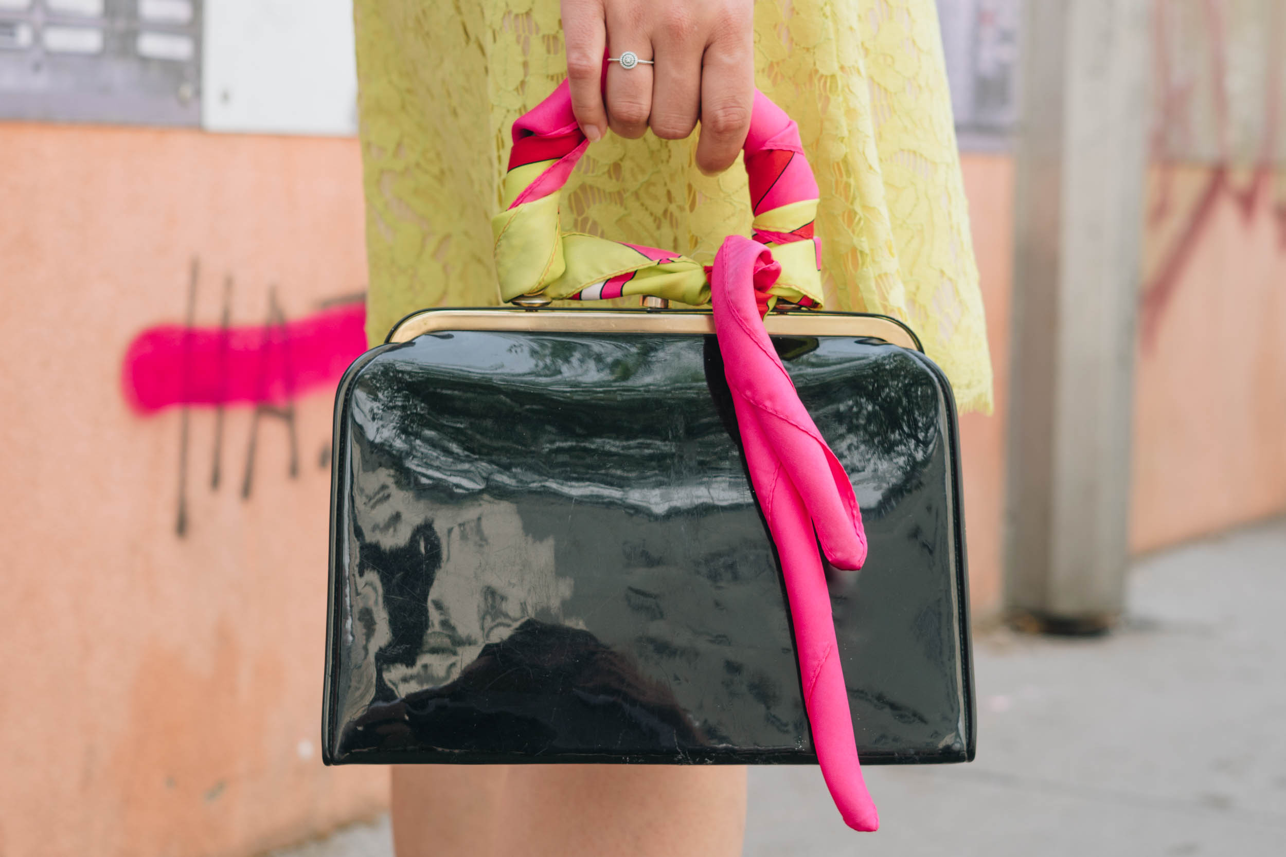 Inzwischen sieht man es recht oft und ich finde die Idee wirklich toll. Nimm ein Seidentuch, falte es zu einem schmalen Band und wickle es um den Griff deiner Tasche. Tada! Und schon sieht deine Tasche ganz anders aus und fast wie neu.