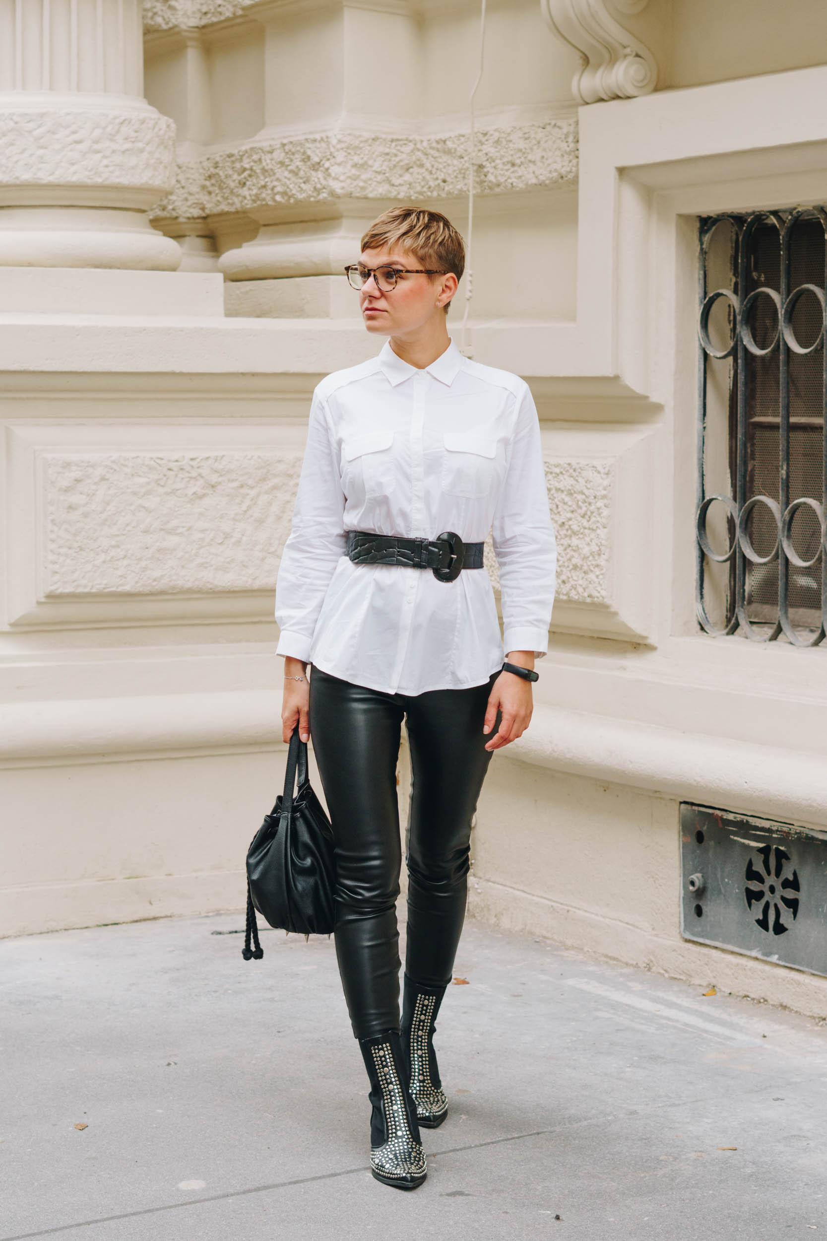 Auf den Bildern trage ich eine Military Bluse von seventy, eine Lederleggings von Zara, Boots aus Madrid, DIY Beuteltasche mit Nieten, Vintage Gürtel und Brille von Mister Spex.