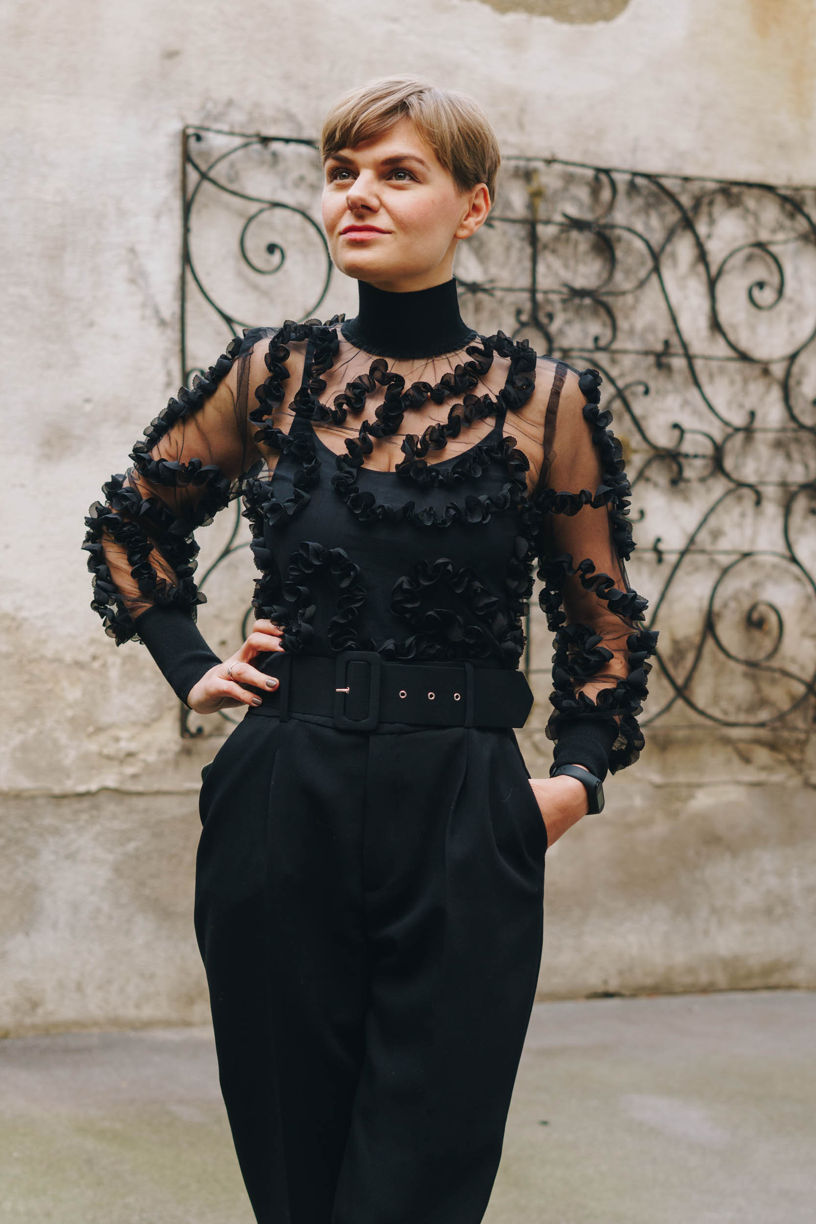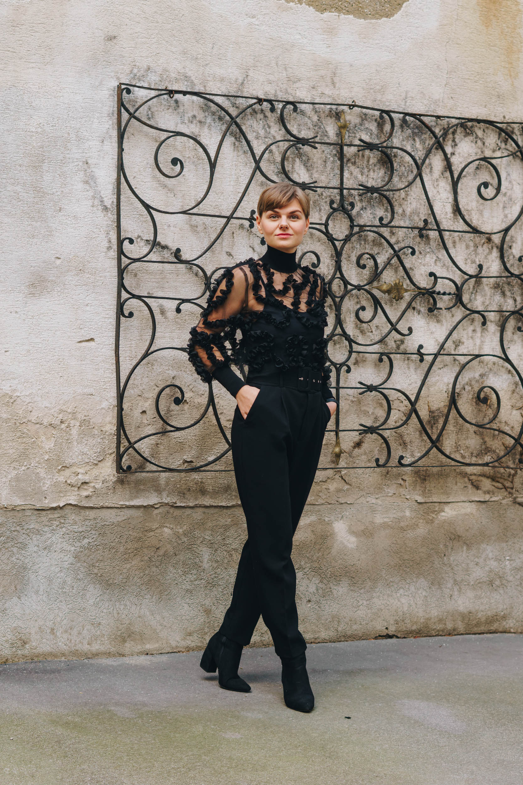 Auf den Bildern trage ich einen Mantel von only, ein Spitzen-Oberteil und Stoffhose von Zara, einen Body von hm und Stiefletten von Asos.