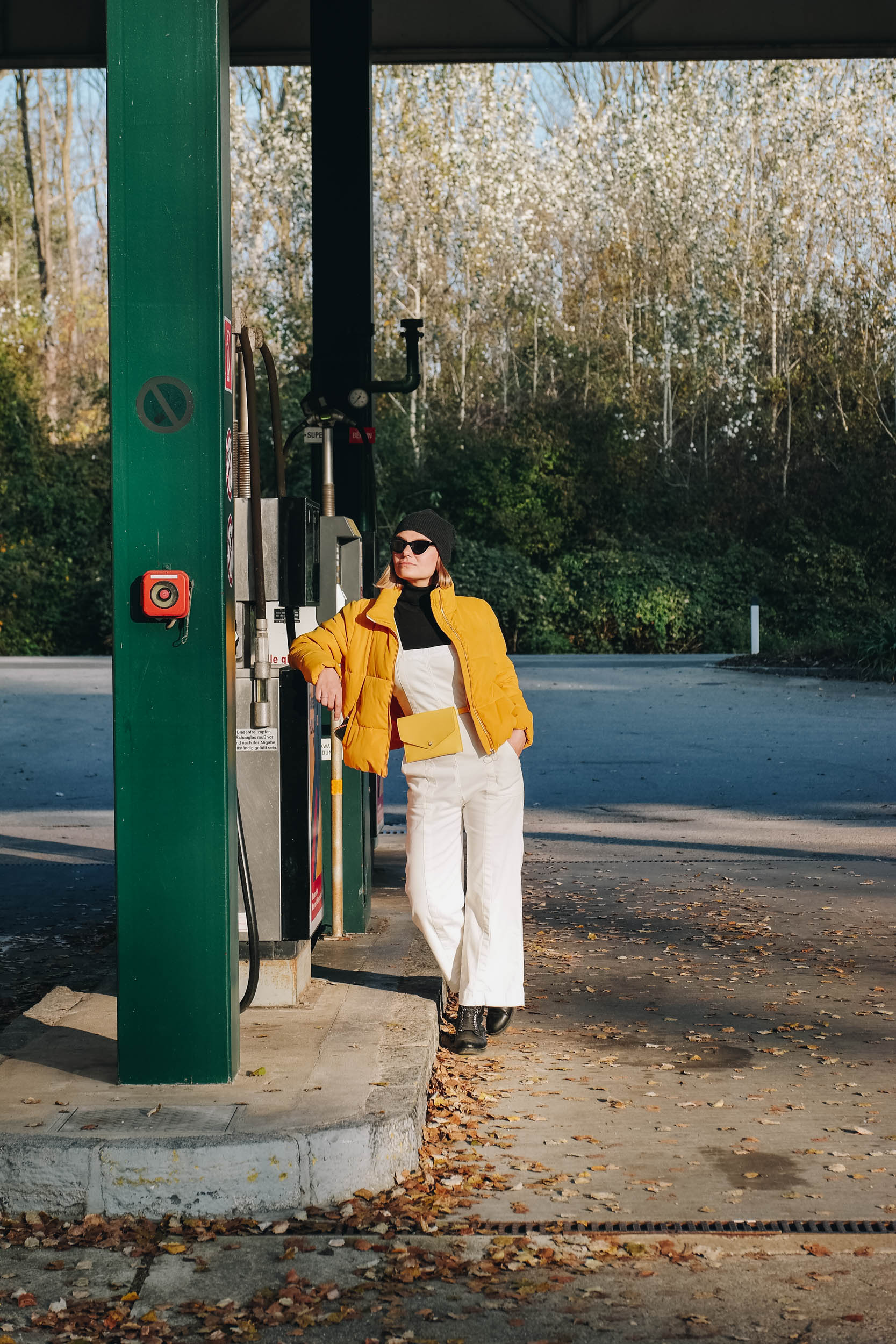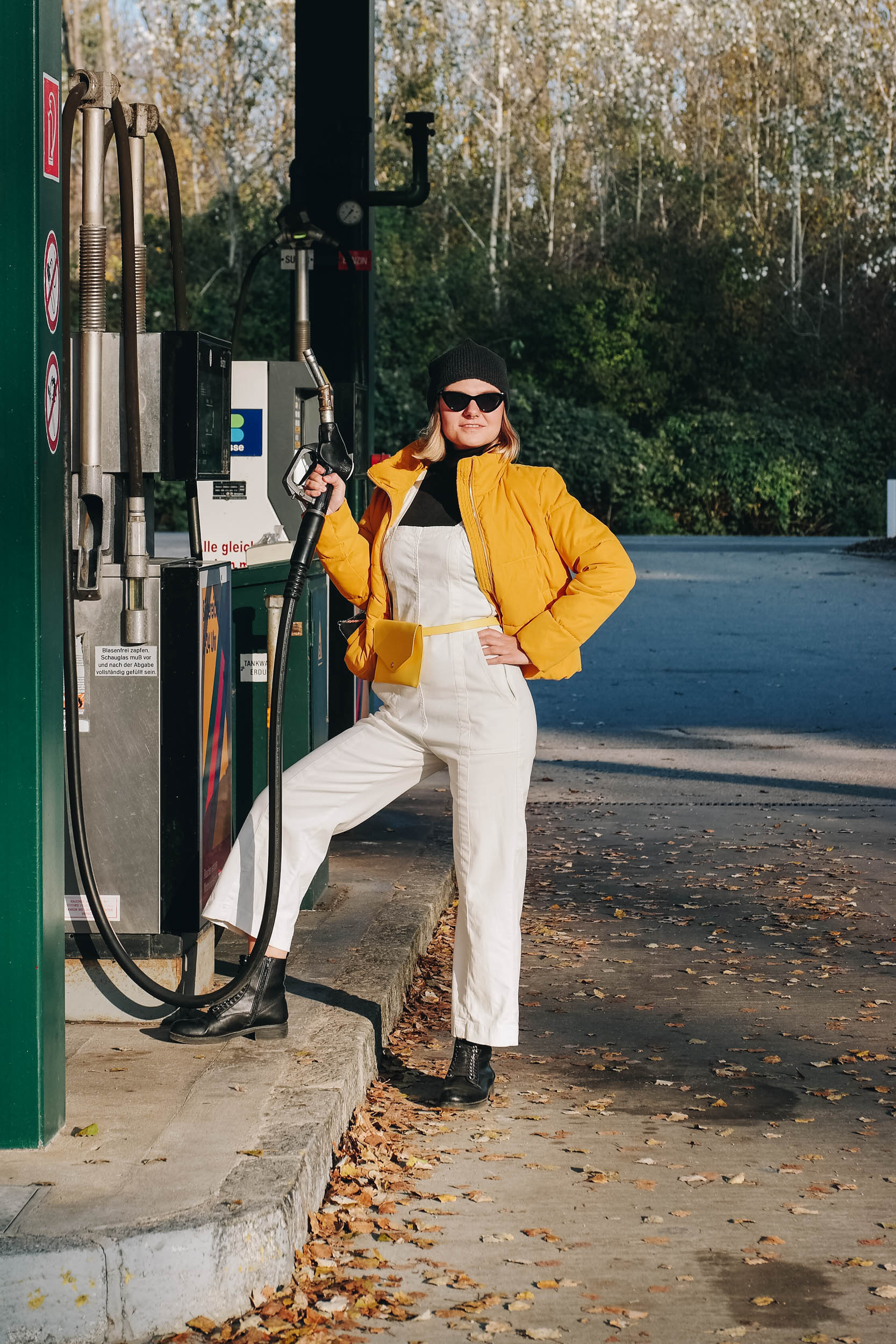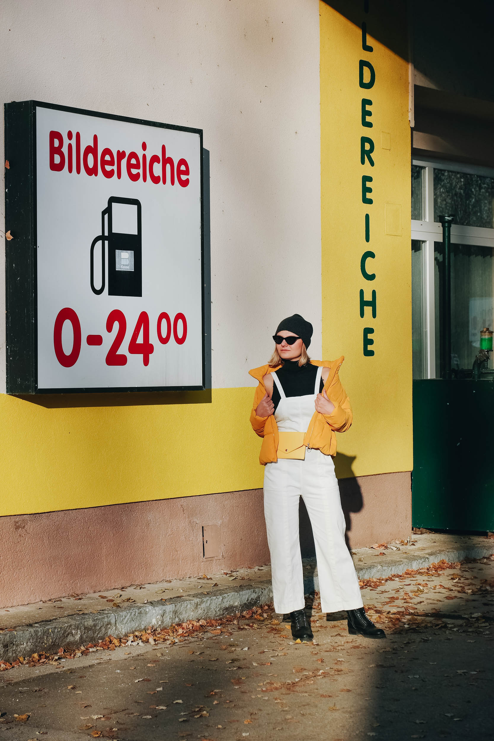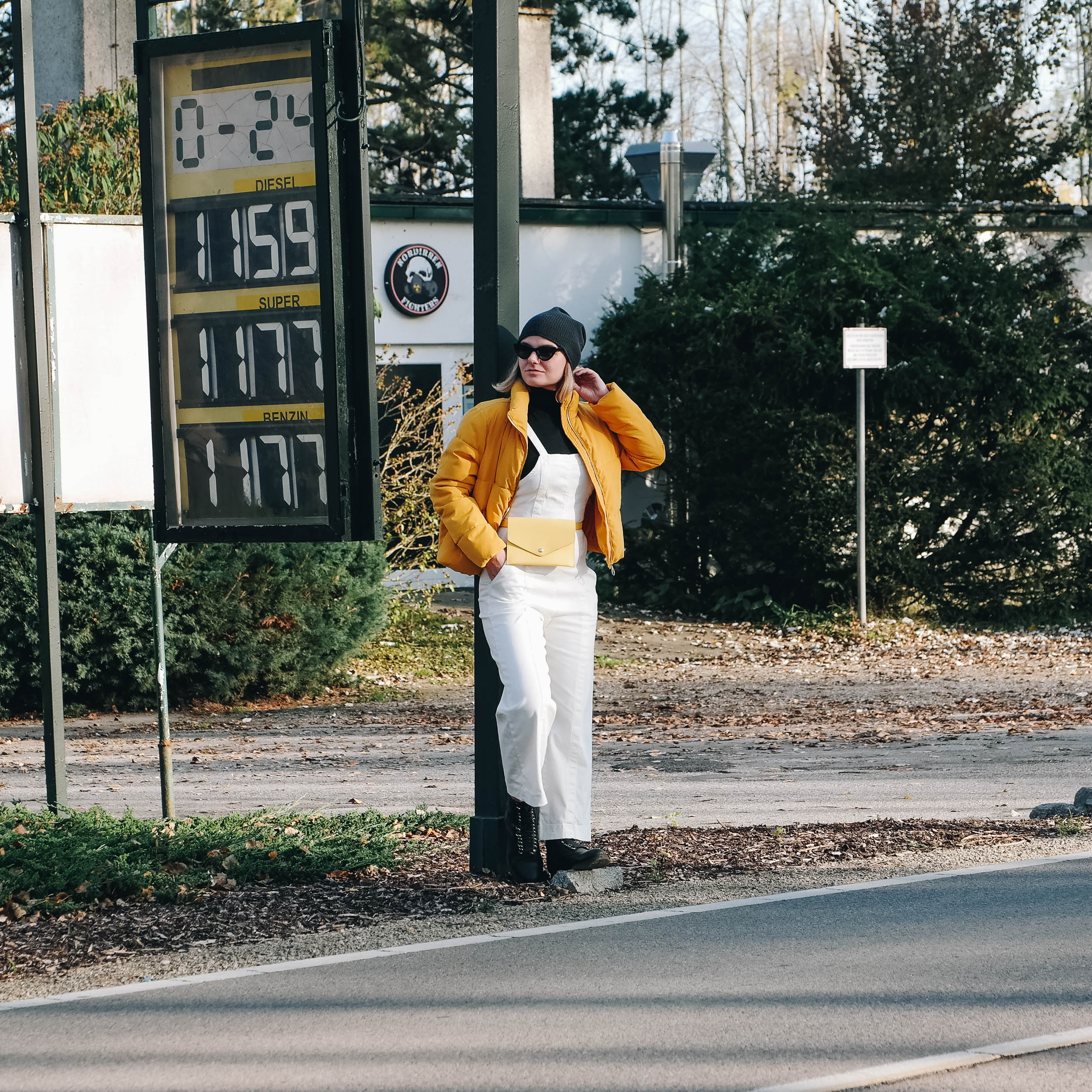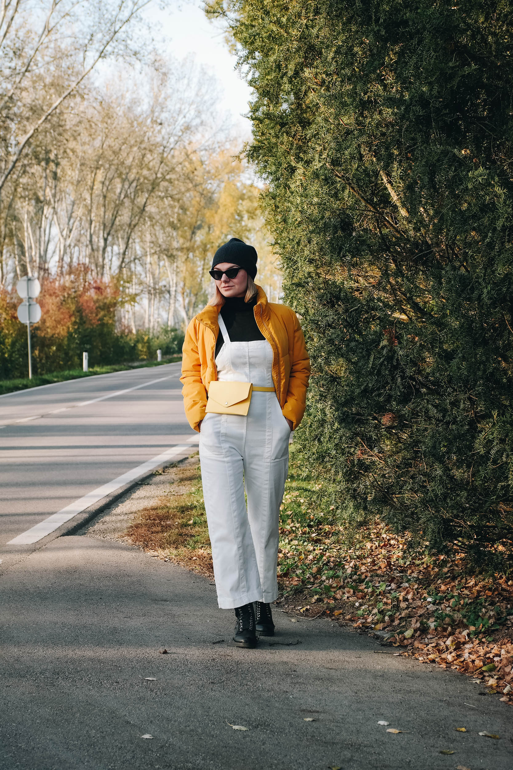 Auf den Bildern trage ich eine Steppjacke und Bauchtasche von only, eine Latzhose von Bershka, einen ärmellosen Rolli von Zara, Boots von omg!, Haube von asos und Sonnenbrille von Hallhuber.